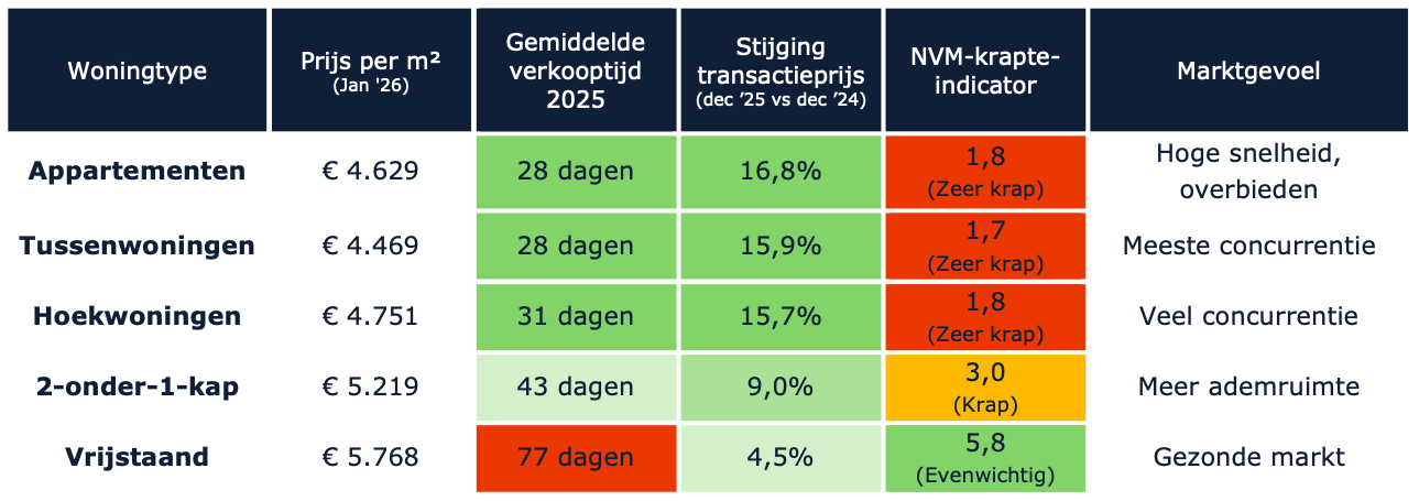 - Appartementen en tussenwoningen: krapte blijft, goed geprijsde woningen in goede staat blijven concurrerend.