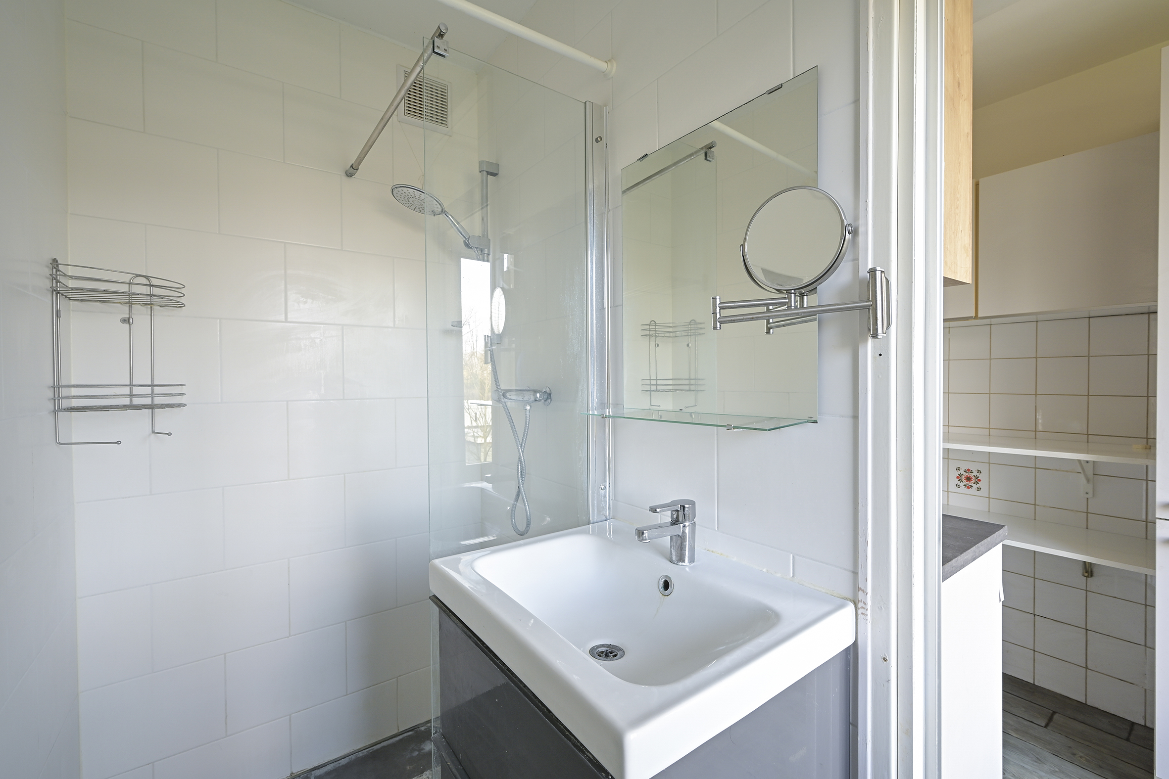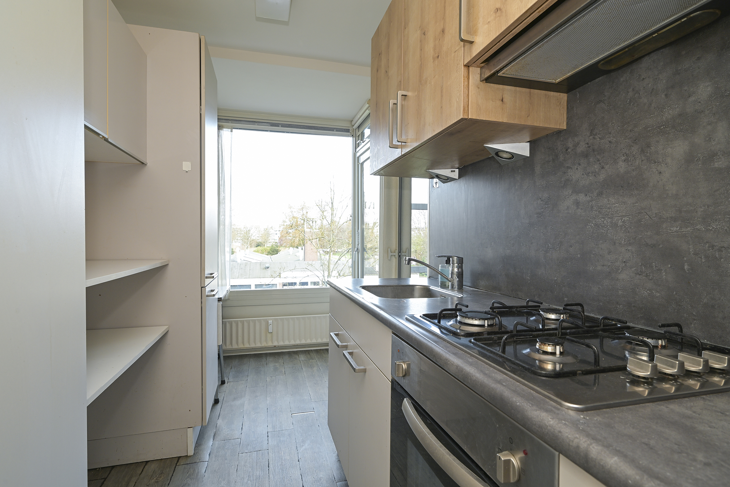 De gesloten keuken is praktisch ingericht met werkbladen aan beide zijden en voorzien van onder andere een 4-pits gasfornuis, ingebouwde oven, losse koelkast en aansluiting voor de wasmachine. Vanuit de keuken is er toegang tot de badkamer met douche en wastafel en tevens tot een tweede balkon aan de achterzijde.