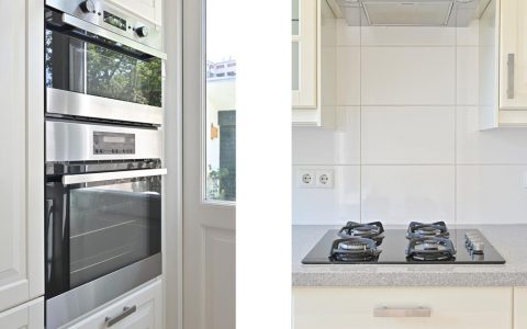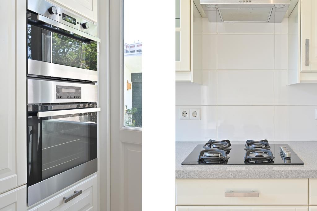 Ground floor: hallway, toilet and spacious living and dining room with wooden floor, access to the modern kitchen with all built-in appliances.