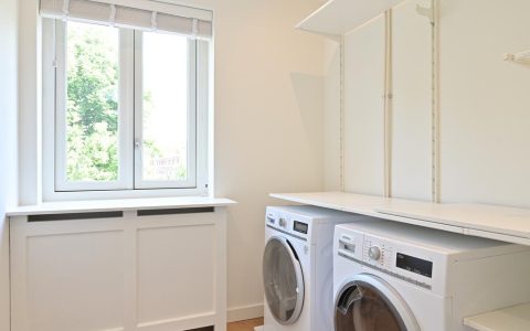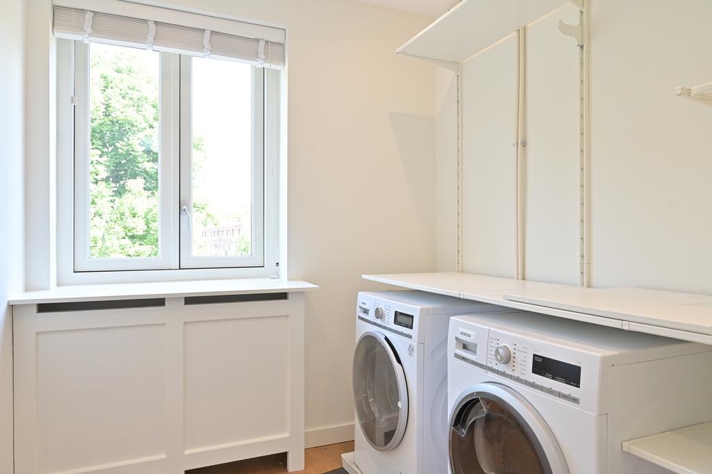 Second floor: landing, two bedrooms with built-in closets. Laundry room with washing machine and dryer.