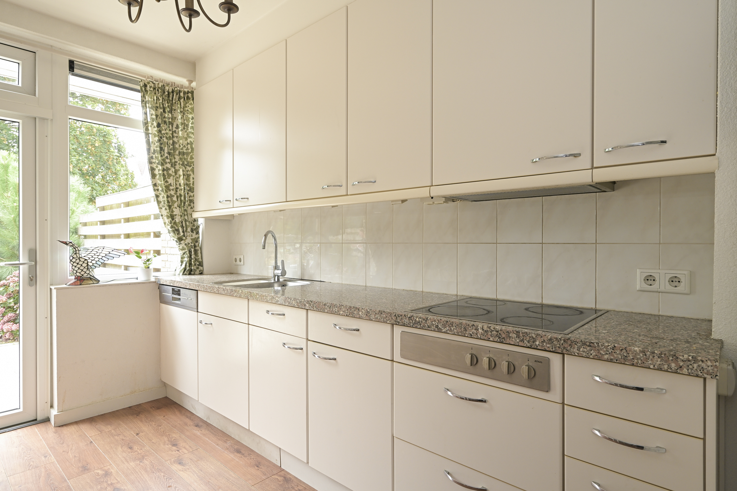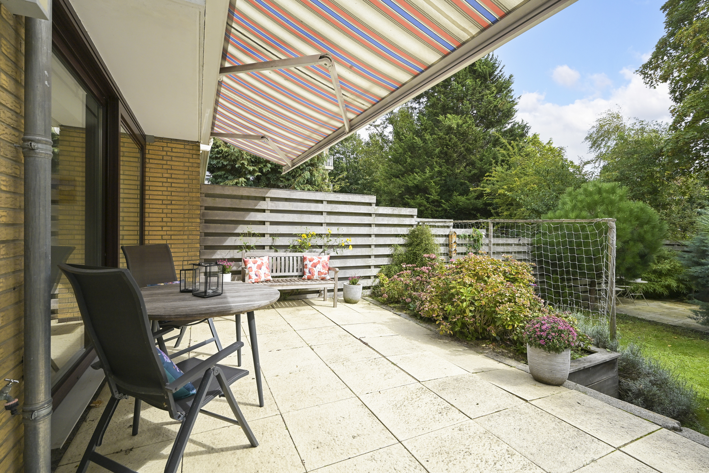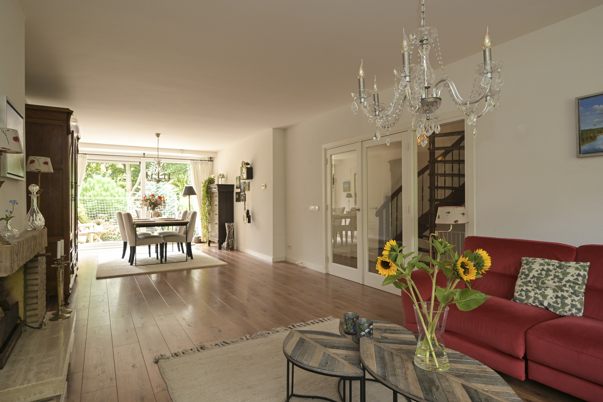 Via de ruime voortuin bereikt u de overdekte entree. Het huis beschikt over een ruime vestibule en hal. Via de dubbele deuren komt u in de fijne lichte en ruime woonkamer met een open haard met zowel voor als achter prachtig uitzicht in het ‘groen’. De achterzijde is voorzien van een grote schuifpui naar het zonneterras. De in licht tinten uitgevoerde keuken is voorzien van diverse inbouwapparatuur en een natuurstenen werkblad. Ook vanuit de keuken is het achterterras en tuin bereikbaar. Naast het trappenhuis in de hal is de wc gesitueerd.