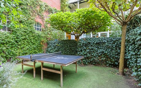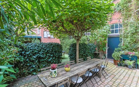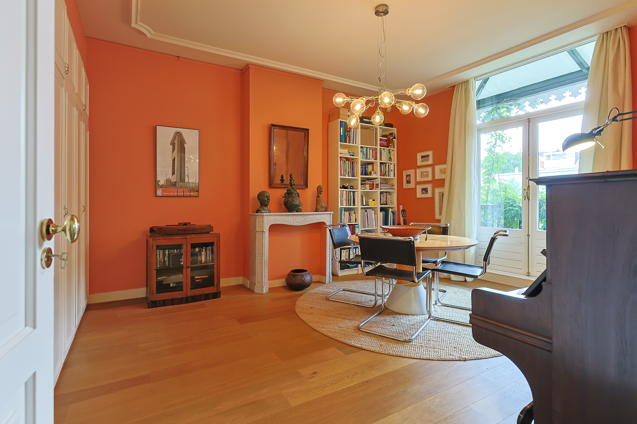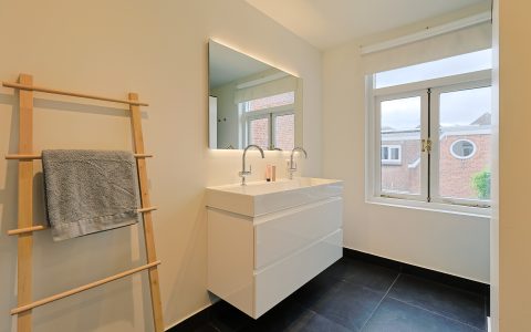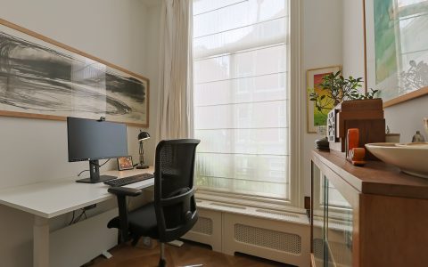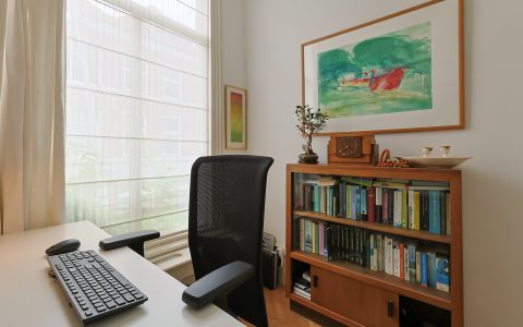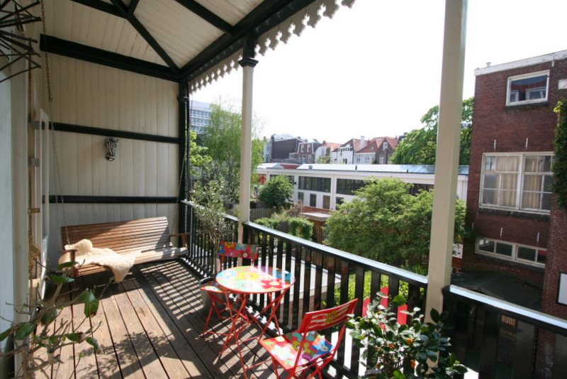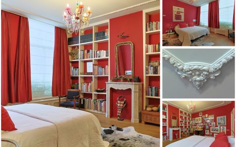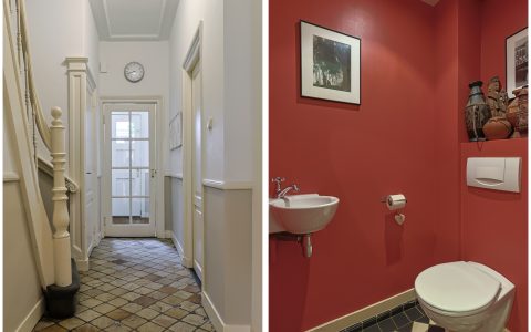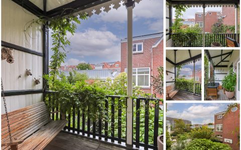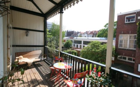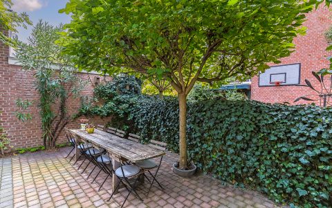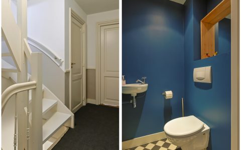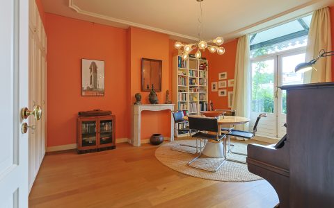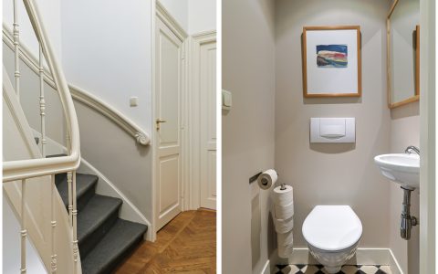 Landing with beautiful herringbone parquet floor, toilet with a small sink. The spacious front bedroom has a built-in (book)case wall and a marble fireplace. The front-side cabinet room has a parquet floor. The rear bedroom, also with a parquet floor, features a magnificent wall of cupboards, a marble fireplace, and French doors leading to the beautiful authentic veranda that spans the full width of the house. From this veranda, which offers plenty of privacy and where you can enjoy a warm and sheltered spot early in the season, you have a view over the inner gardens of the neighboring plots. The modern bathroom, finished in light tones, completes this floor. This bathroom is equipped with a bathtub, a spacious walk-in shower, a double washbasin in a cabinet with plenty of storage space, and underfloor heating.