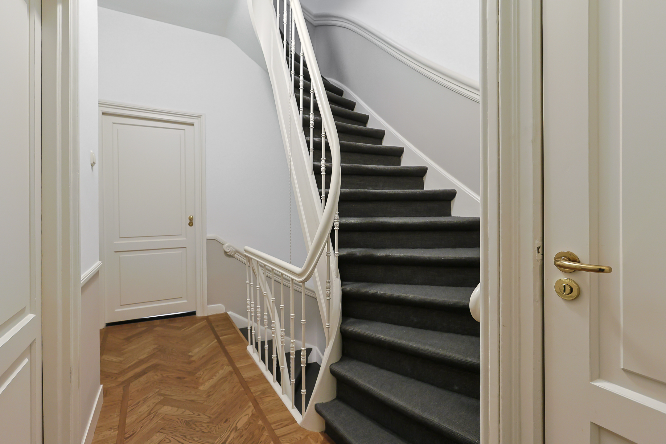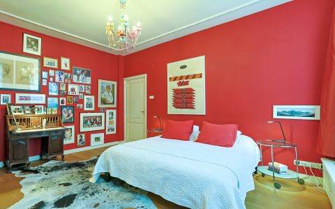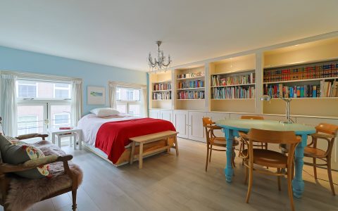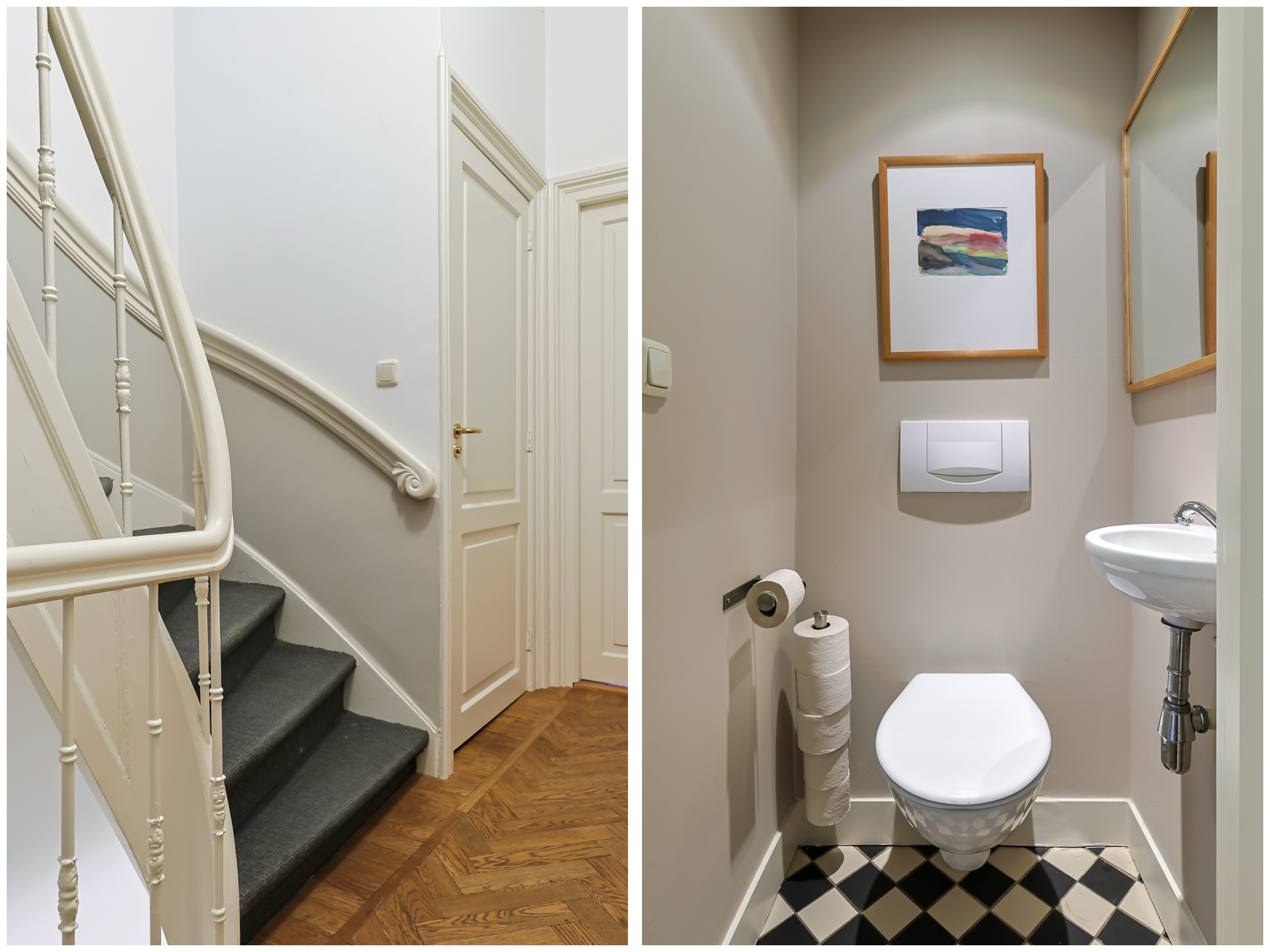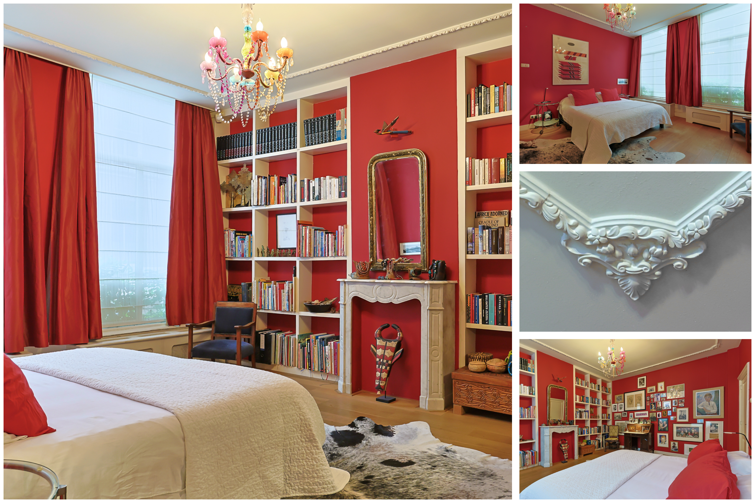 Landing with beautiful herringbone parquet floor, toilet with a small sink. The spacious front bedroom has a built-in (book)case wall and a marble fireplace. The front-side cabinet room has a parquet floor. The rear bedroom, also with a parquet floor, features a magnificent wall of cupboards, a marble fireplace, and French doors leading to the beautiful authentic veranda that spans the full width of the house. From this veranda, which offers plenty of privacy and where you can enjoy a warm and sheltered spot early in the season, you have a view over the inner gardens of the neighboring plots. The modern bathroom, finished in light tones, completes this floor. This bathroom is equipped with a bathtub, a spacious walk-in shower, a double washbasin in a cabinet with plenty of storage space, and underfloor heating.