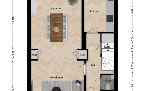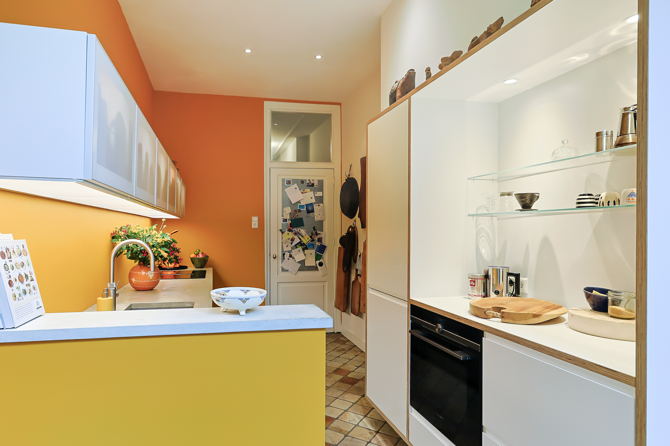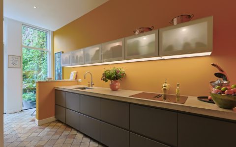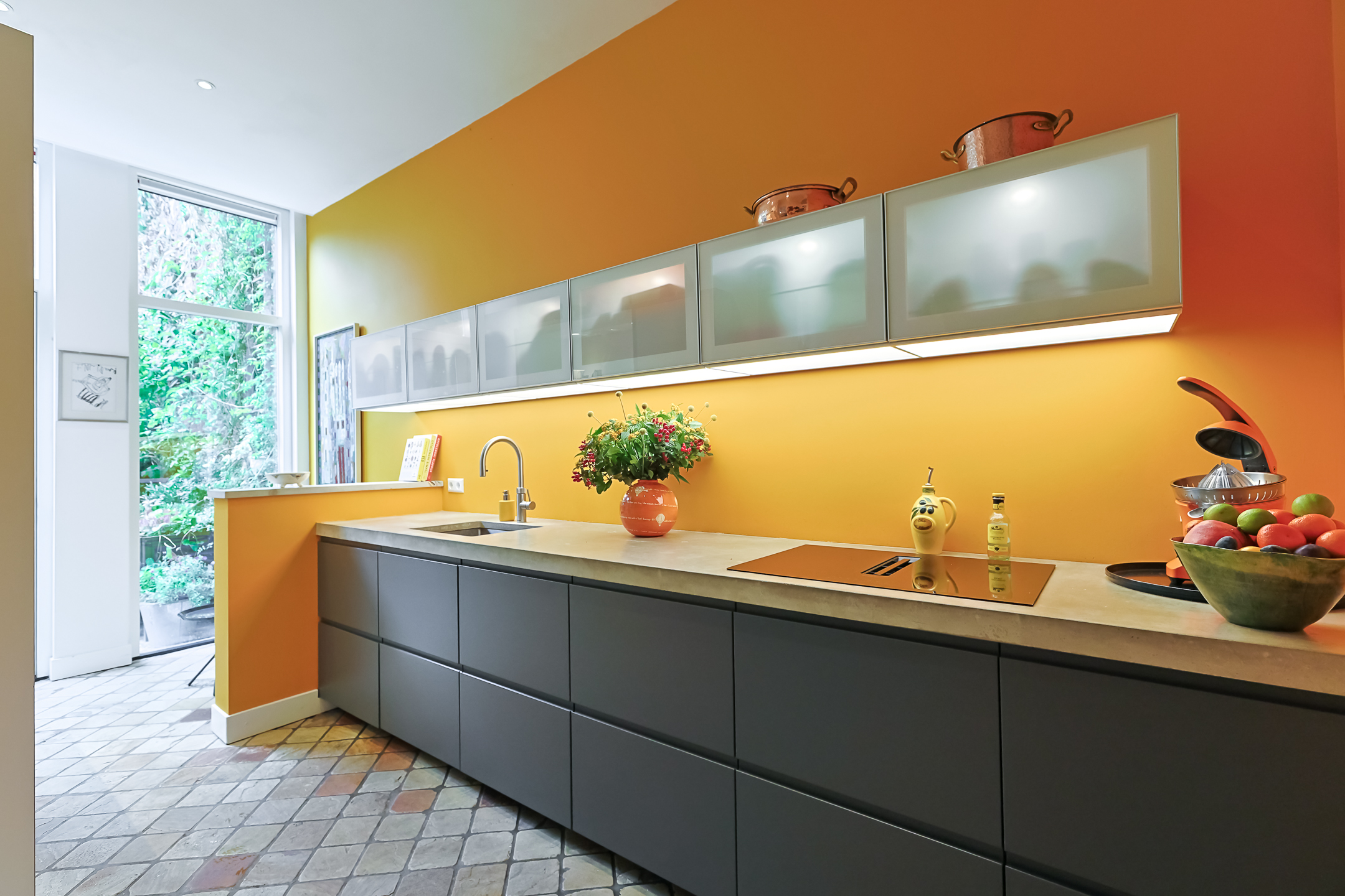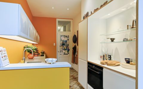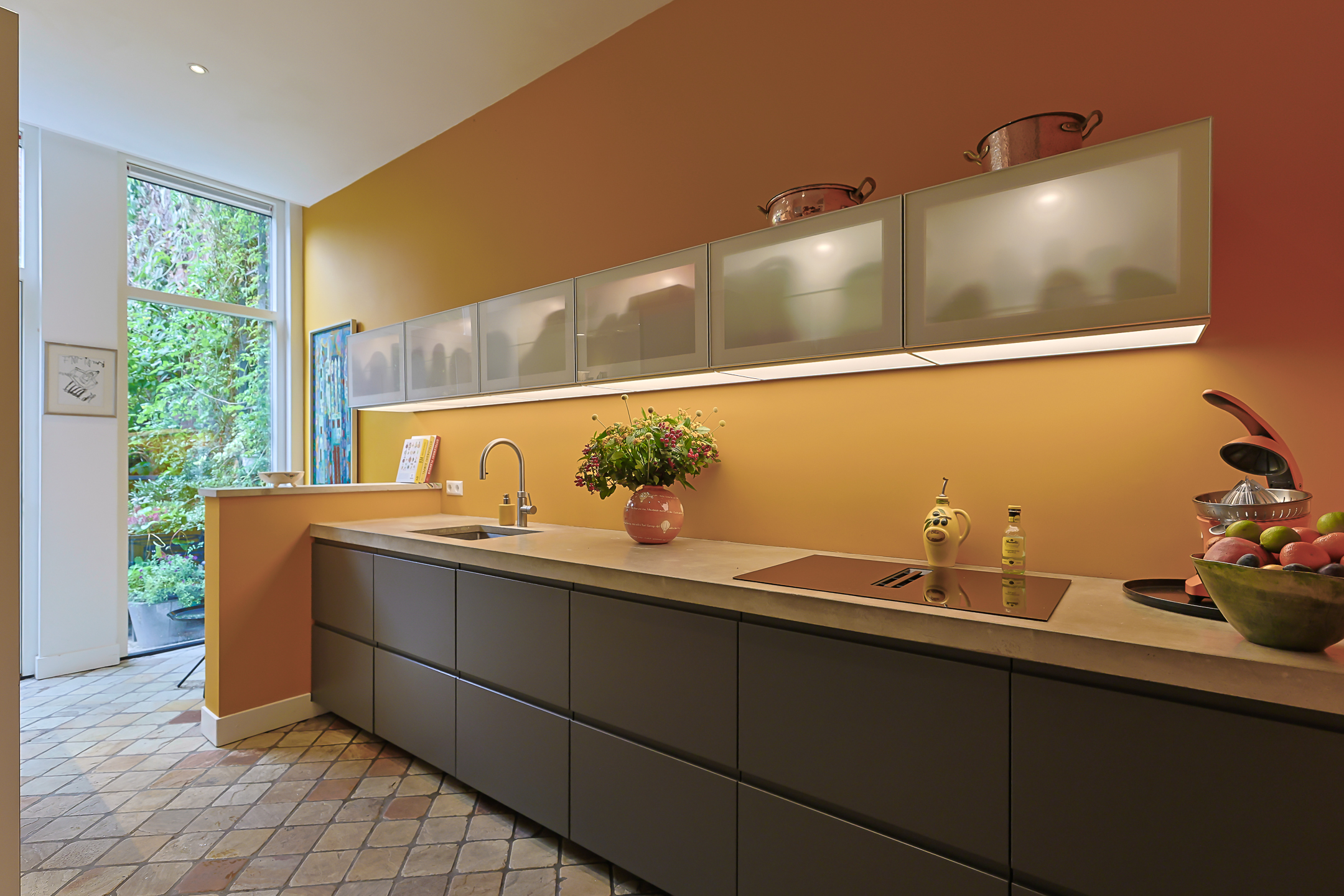 Via de vestibule komt u in de gang met de trapopgang, de deur naar de ruime droge kelder onder de keuken en een modern toilet met fonteintje. Vanuit de gang komt u in de moderne deels open keuken die is voorzien van een vaatwasser, een Quooker, een inductiekookplaat met een ingebouwd afzuigsysteem, een koel-/vriescombinatie en een combi-oven. Het strak vormgegeven keukenmeubel is voorzien van een fraai betongegoten aanrechtblad. In het deel waar de oven en de koelkast geplaatst zijn, is een gezellige koffie corner. De keuken is voorzien van vloerverwarming. Vanuit de keuken bereikt u de zonnige (ZW) en besloten stadstuin (ca. 9.00m x 6.5m) met zij-ingang. (Heerlijk met fietsen, plantjes voor de tuin of het afvoeren van rommel) Er is een aparte plaats voor fietsen in belendend pand.