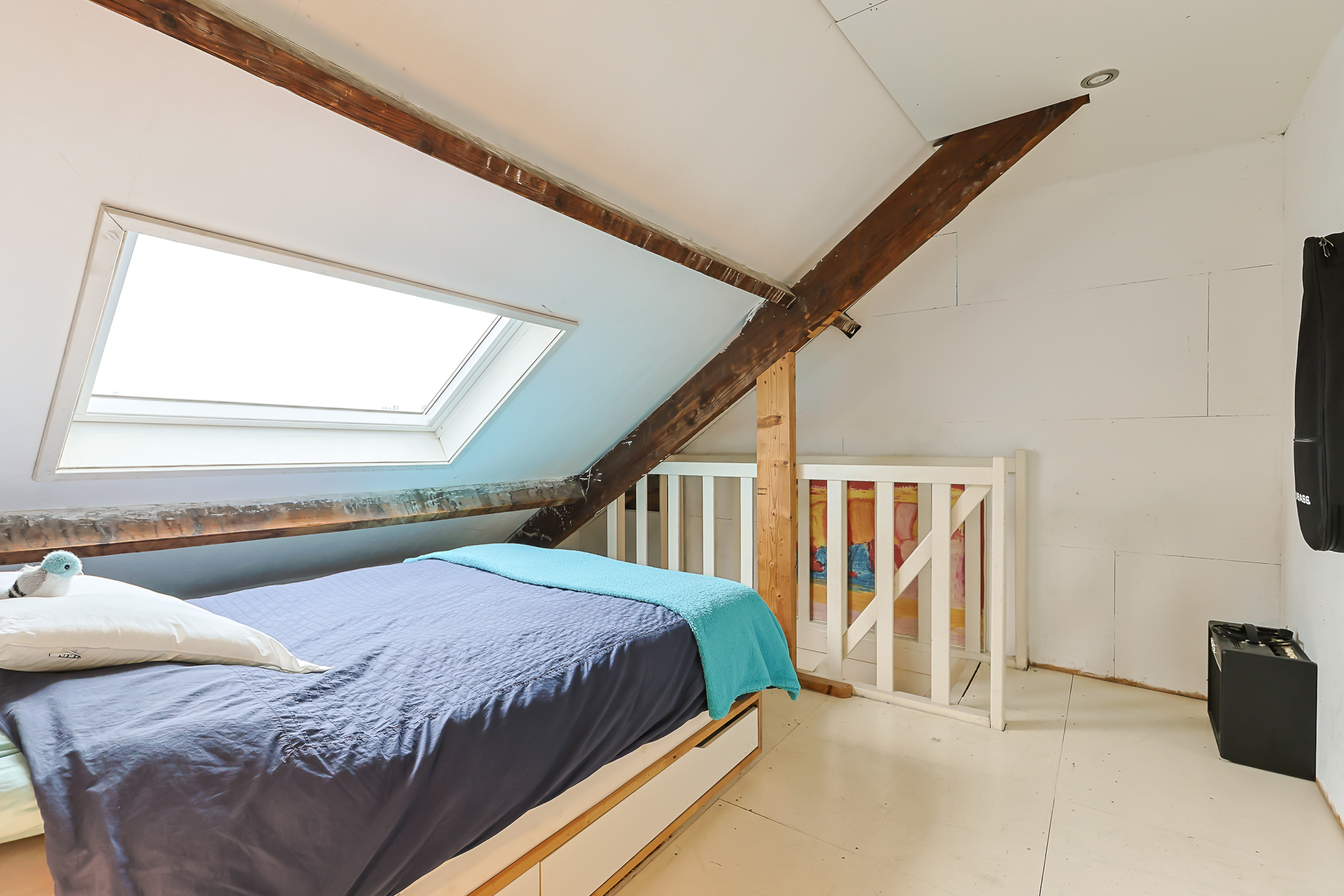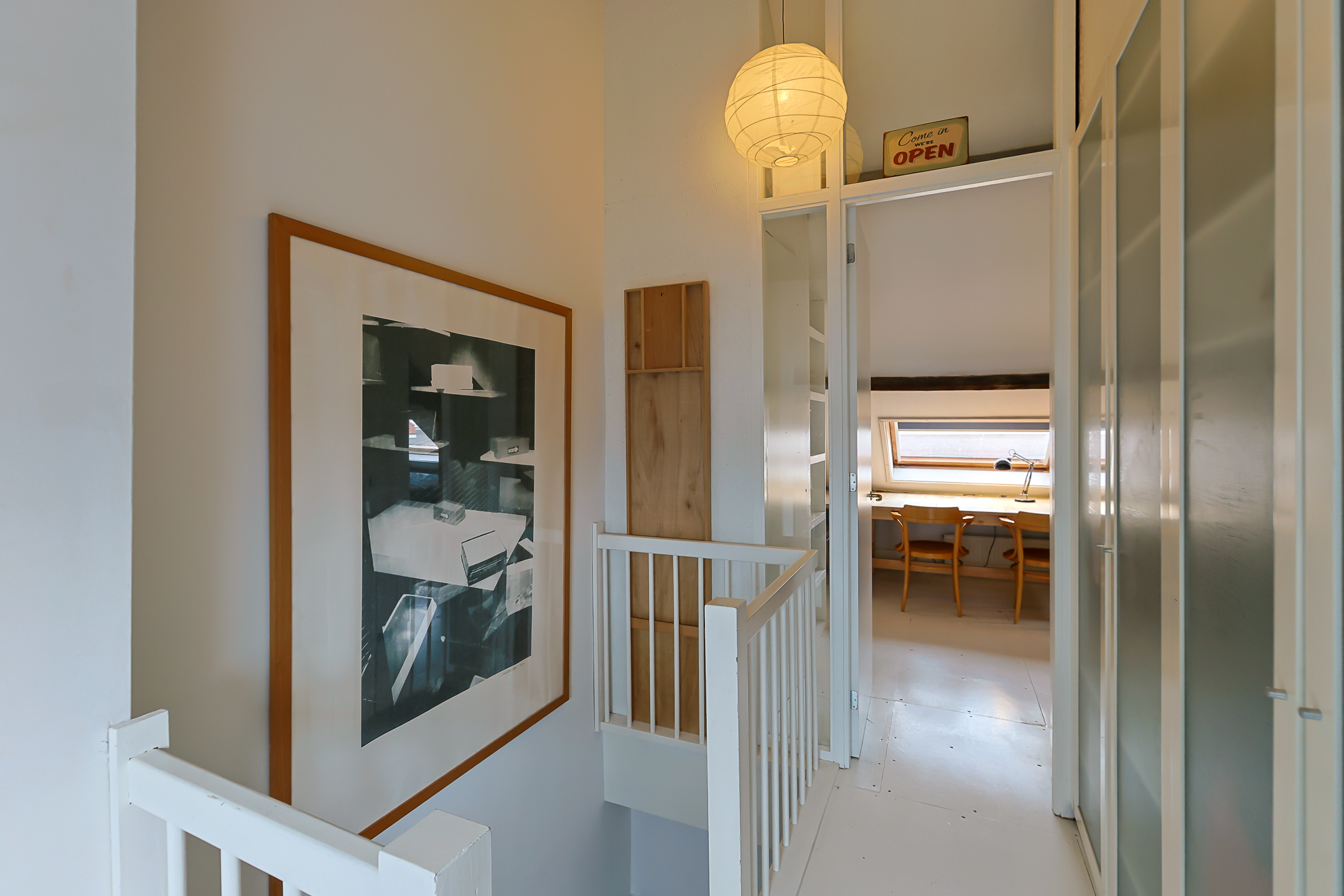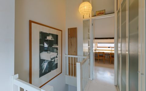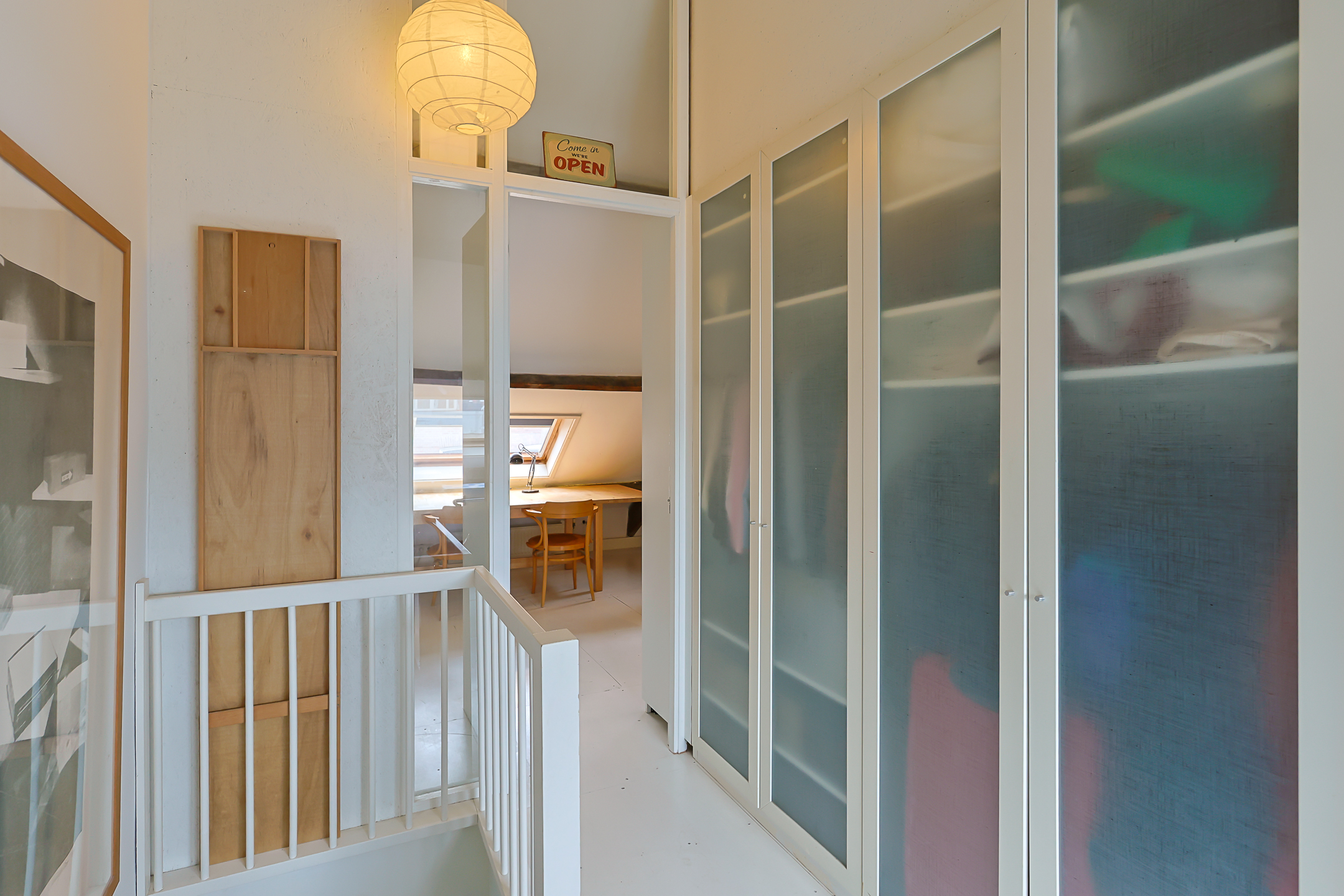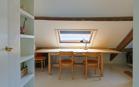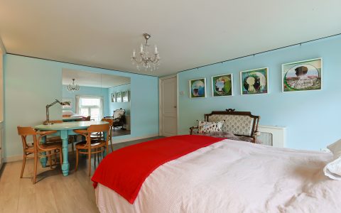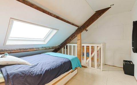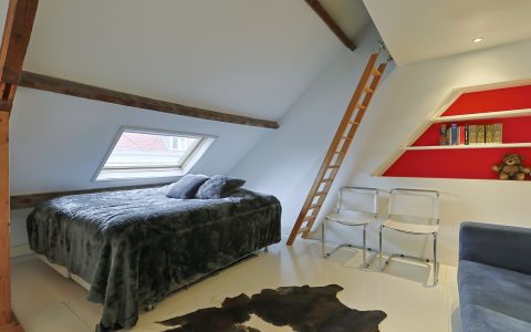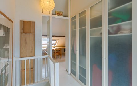 Overloop. Hier bevindt zich de opstelplaats van de cv-installatie, een grote kastenwand met veel bergruimte en de doorloop naar de ruime sfeervolle voorkamer. Deze voorkamer is door de grote veluxramen heerlijk licht en ideaal voor een tiener of als gastenkamer door de privacy en tussenvloer met extra bed, bereikbaar met losse trap.