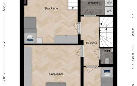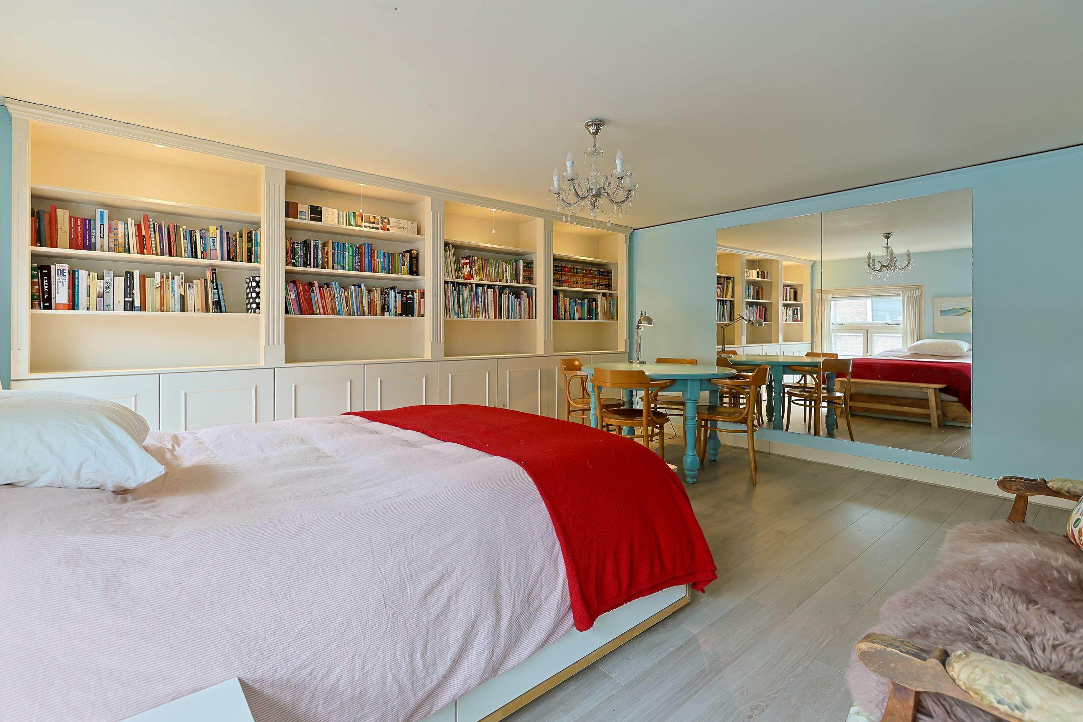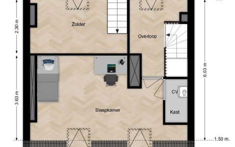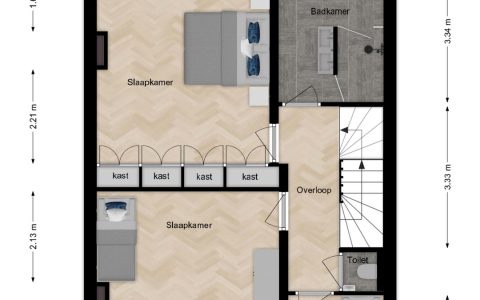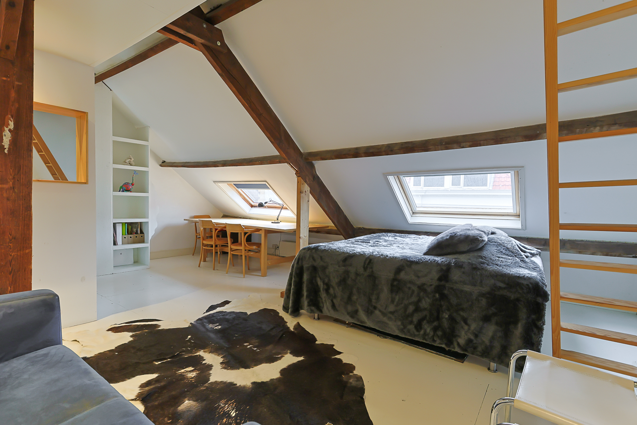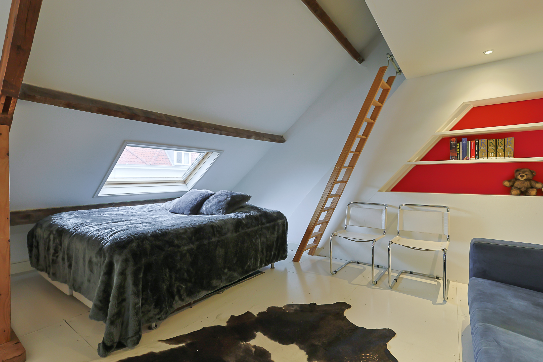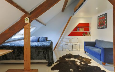 Overloop. Hier bevindt zich de opstelplaats van de cv-installatie, een grote kastenwand met veel bergruimte en de doorloop naar de ruime sfeervolle voorkamer. Deze voorkamer is door de grote veluxramen heerlijk licht en ideaal voor een tiener of als gastenkamer door de privacy en tussenvloer met extra bed, bereikbaar met losse trap.