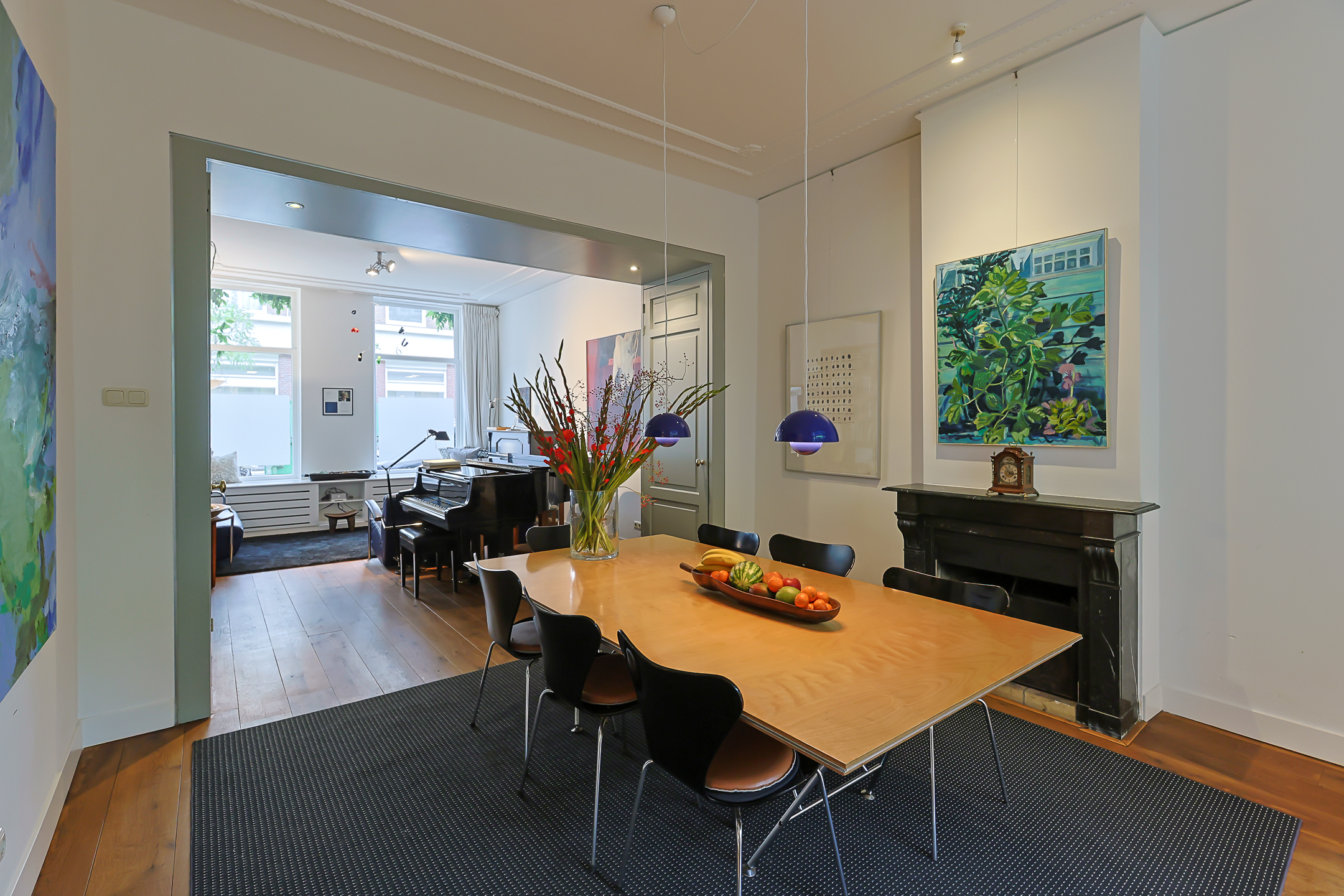 Entrance:Through the vestibule, you enter the hallway with the staircase, the door to the spacious dry cellar beneath the kitchen, and a modern toilet with a small sink. From the hallway, you enter the modern partially open kitchen, which is equipped with a dishwasher, a Quooker, an induction cooktop with a built-in ventilation system, a fridge/freezer combination, and a combi-oven. The sleekly designed kitchen unit features a beautiful concrete countertop. In the section with the oven and fridge, there is a cozy coffee corner. The kitchen has underfloor heating. From the kitchen, you can access the sunny (SW) and private city garden (approx. 9.00m x 6.5m) with a side entrance. (Perfect for bikes, garden plants, or taking out the trash.) There is a separate place for bicycles in the adjacent building.The beautiful and spacious living room features solid wooden plank flooring and a fireplace with a marble mantel. The beautifully ornamented ceilings also immediately catch the eye.