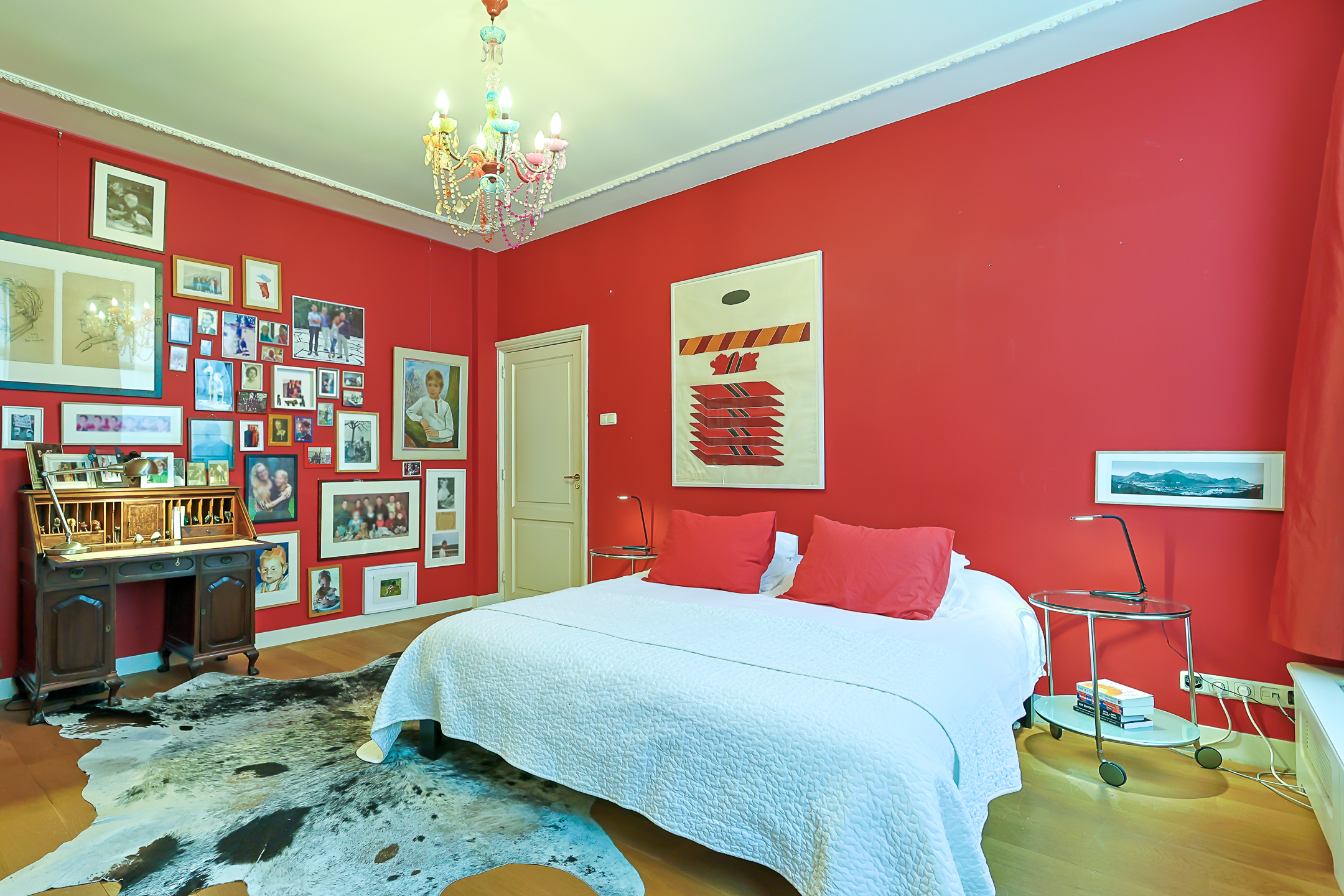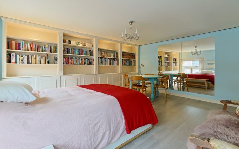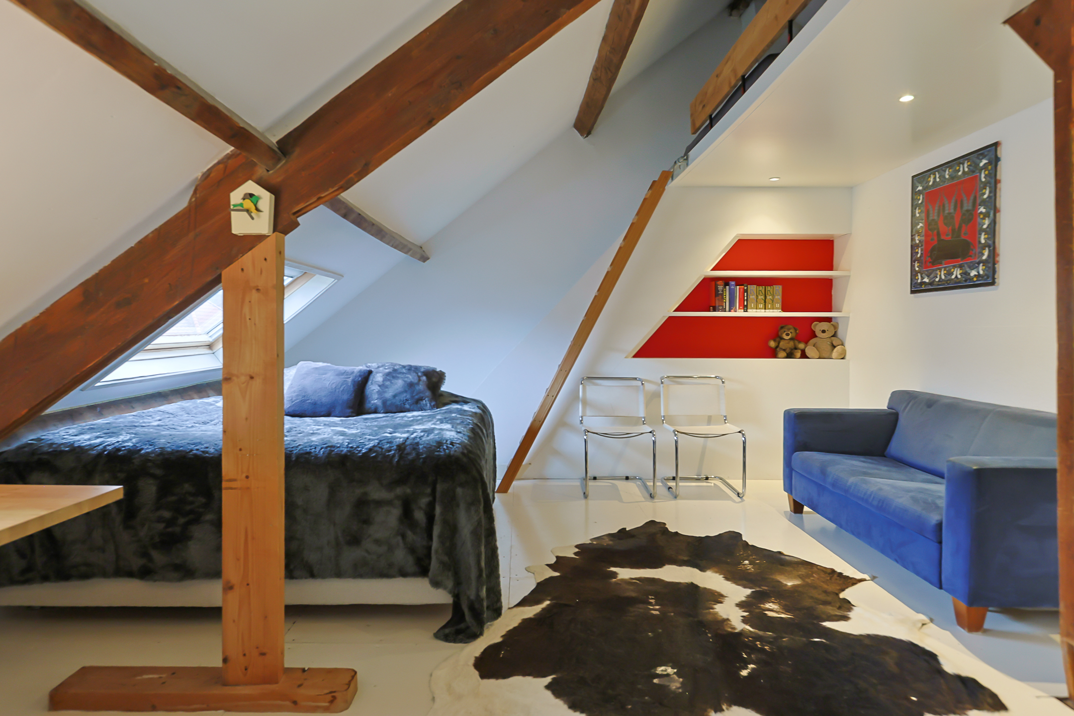 Landing. Here is the location of the central heating system, a large wall of cupboards with plenty of storage space, and the passage to the spacious, cozy front room. This front room is wonderfully bright thanks to the large Velux windows and is ideal for a teenager or as a guest room due to the privacy and mezzanine with an extra bed, accessible by a separate staircase.