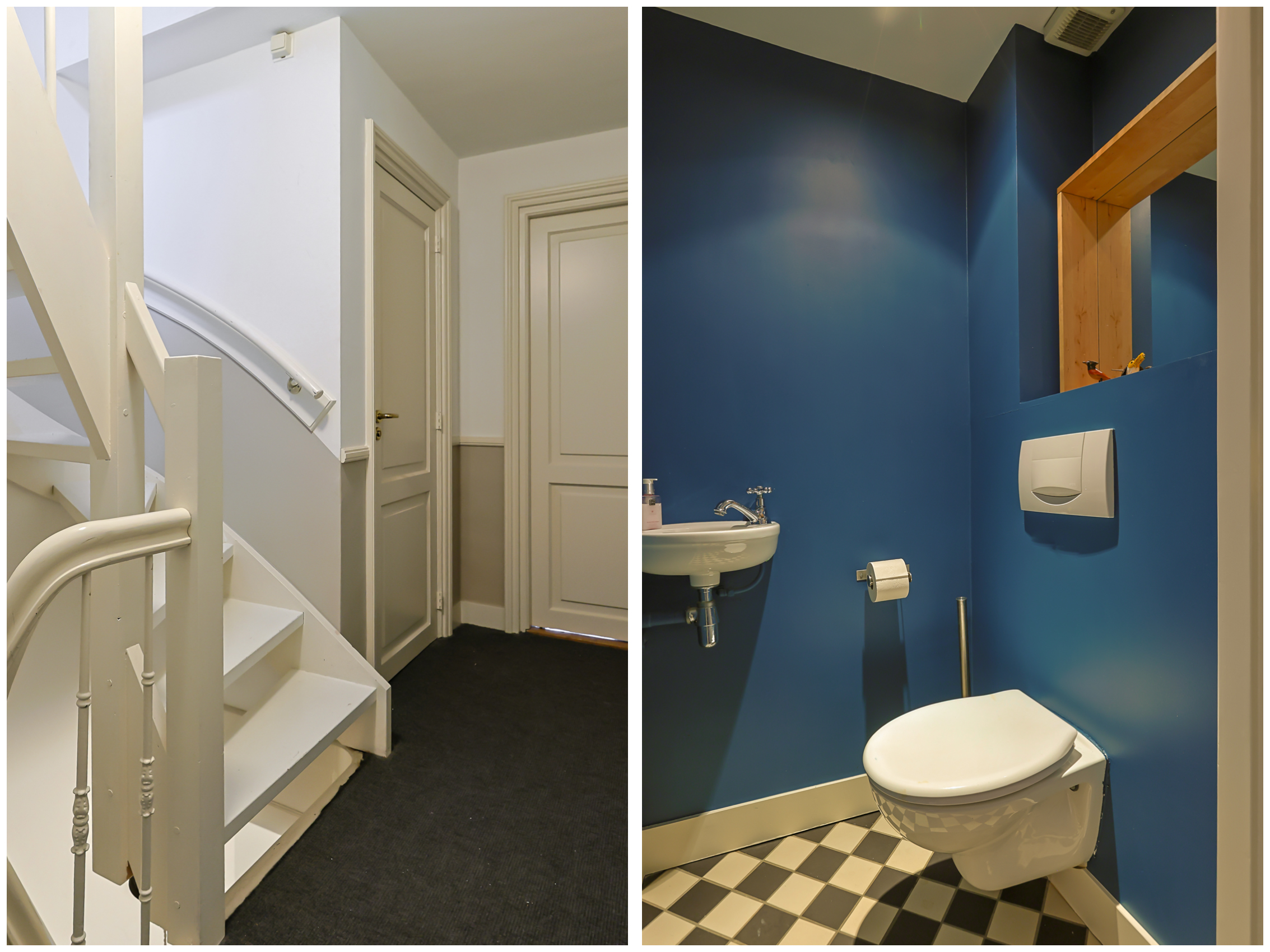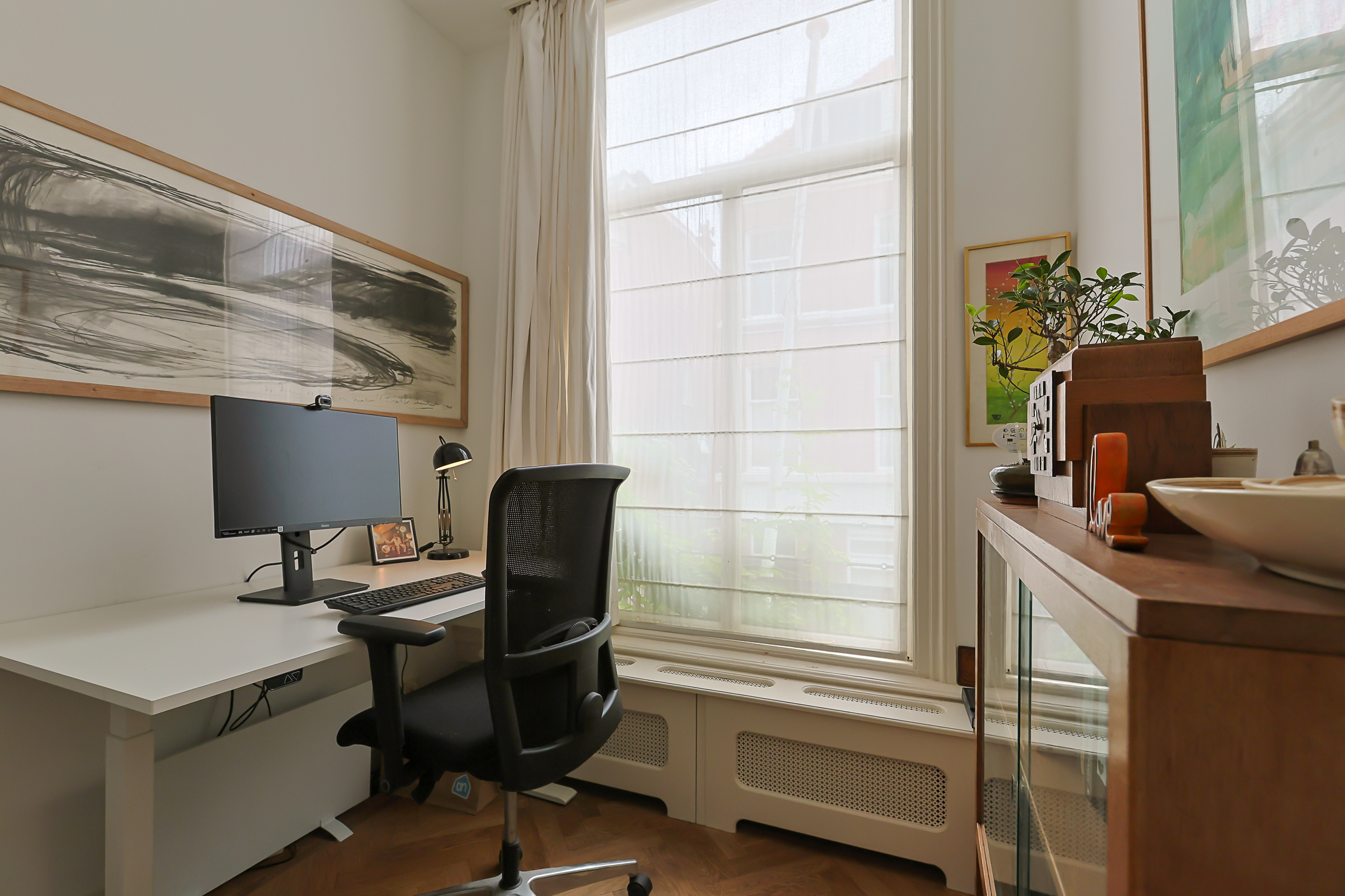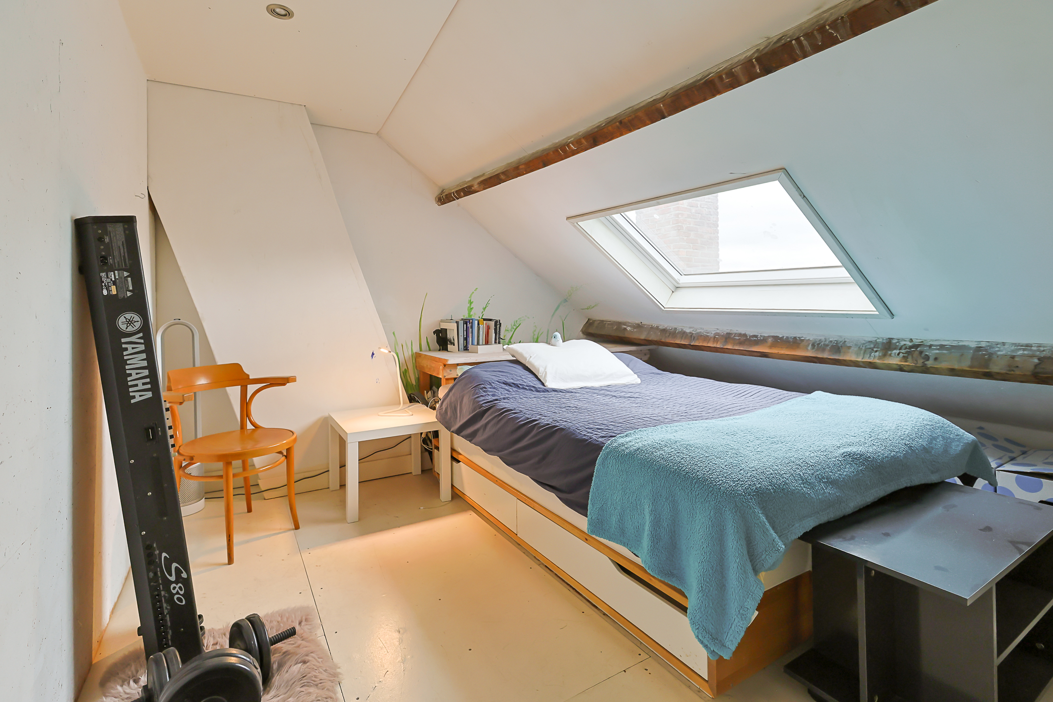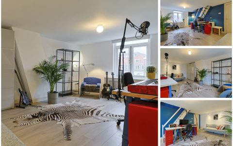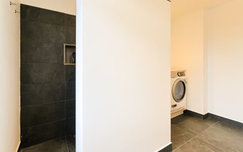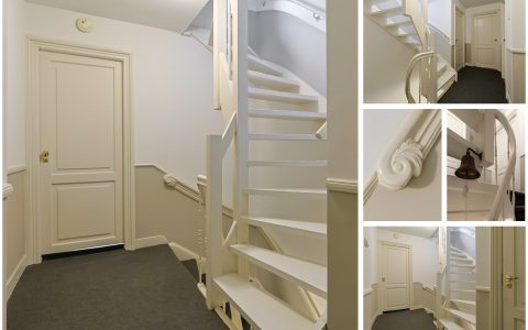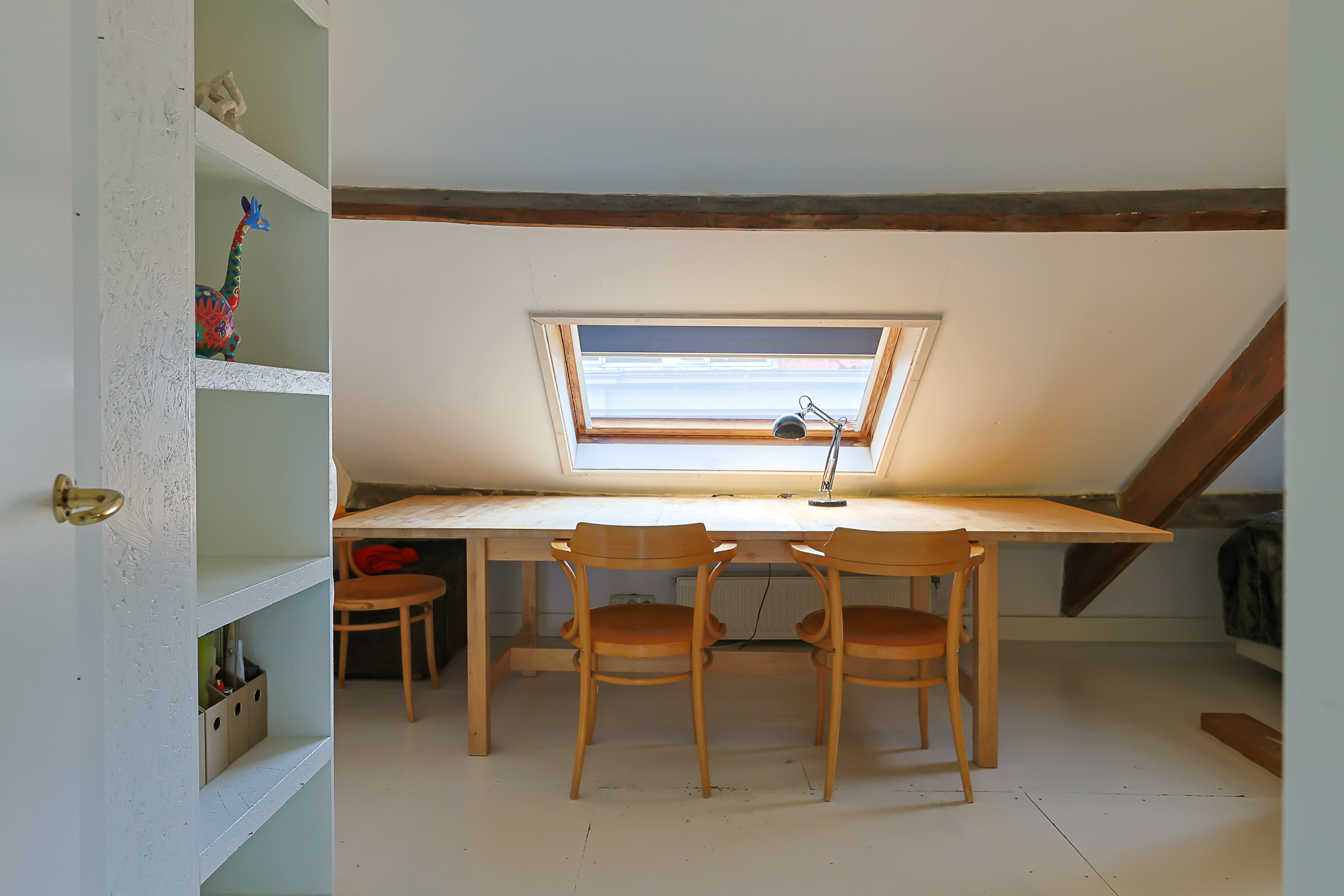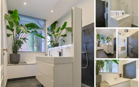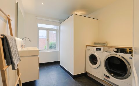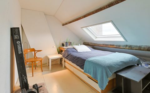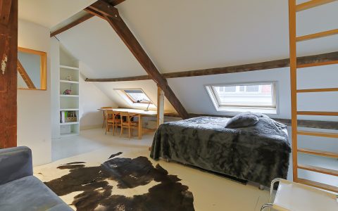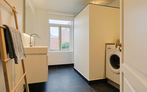 From the landing, you have access to the spacious front room, which features a beautiful built-in wardrobe wall. The front-side room is currently set up as a studio. The second, modern-finished bathroom has a walk-in shower and a double sink in an attractive cabinet. This bathroom also houses the space for the washing machine and dryer. The bathroom is equipped with underfloor heating. The very bright back room is spacious and has a staircase leading to the surprisingly large attic room above.