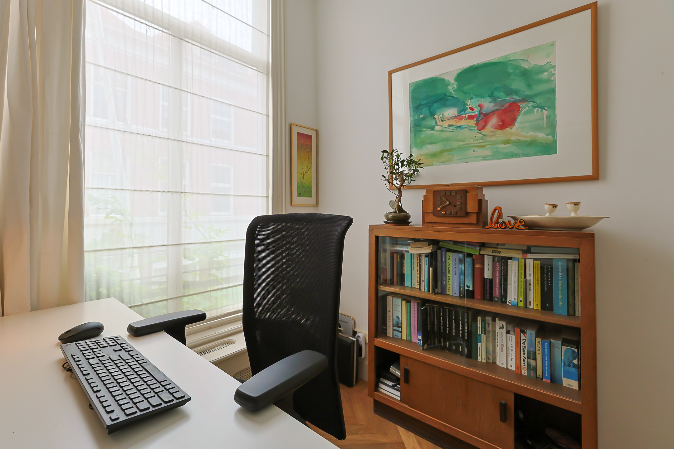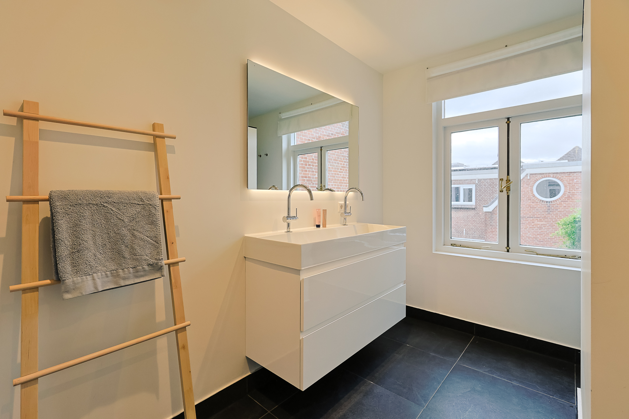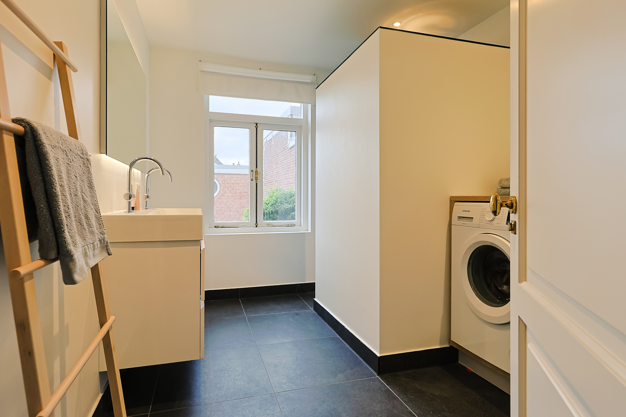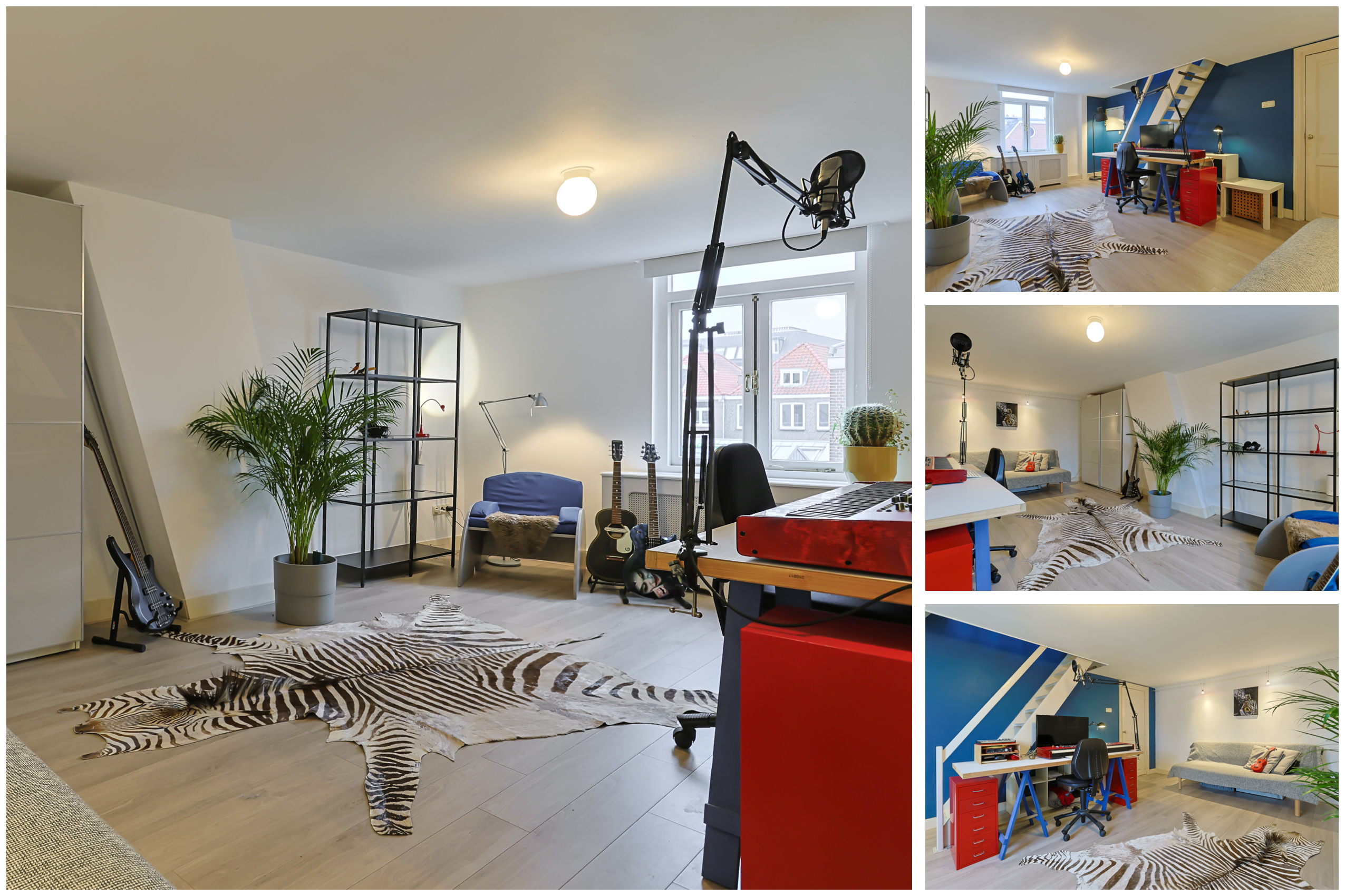 From the landing, you have access to the spacious front room, which features a beautiful built-in wardrobe wall. The front-side room is currently set up as a studio. The second, modern-finished bathroom has a walk-in shower and a double sink in an attractive cabinet. This bathroom also houses the space for the washing machine and dryer. The bathroom is equipped with underfloor heating. The very bright back room is spacious and has a staircase leading to the surprisingly large attic room above.