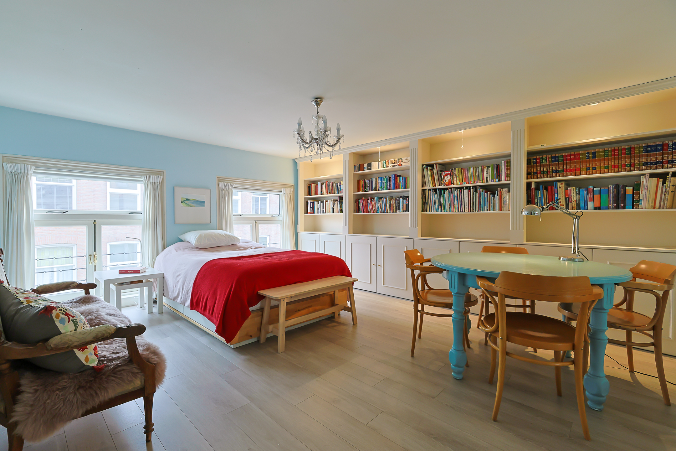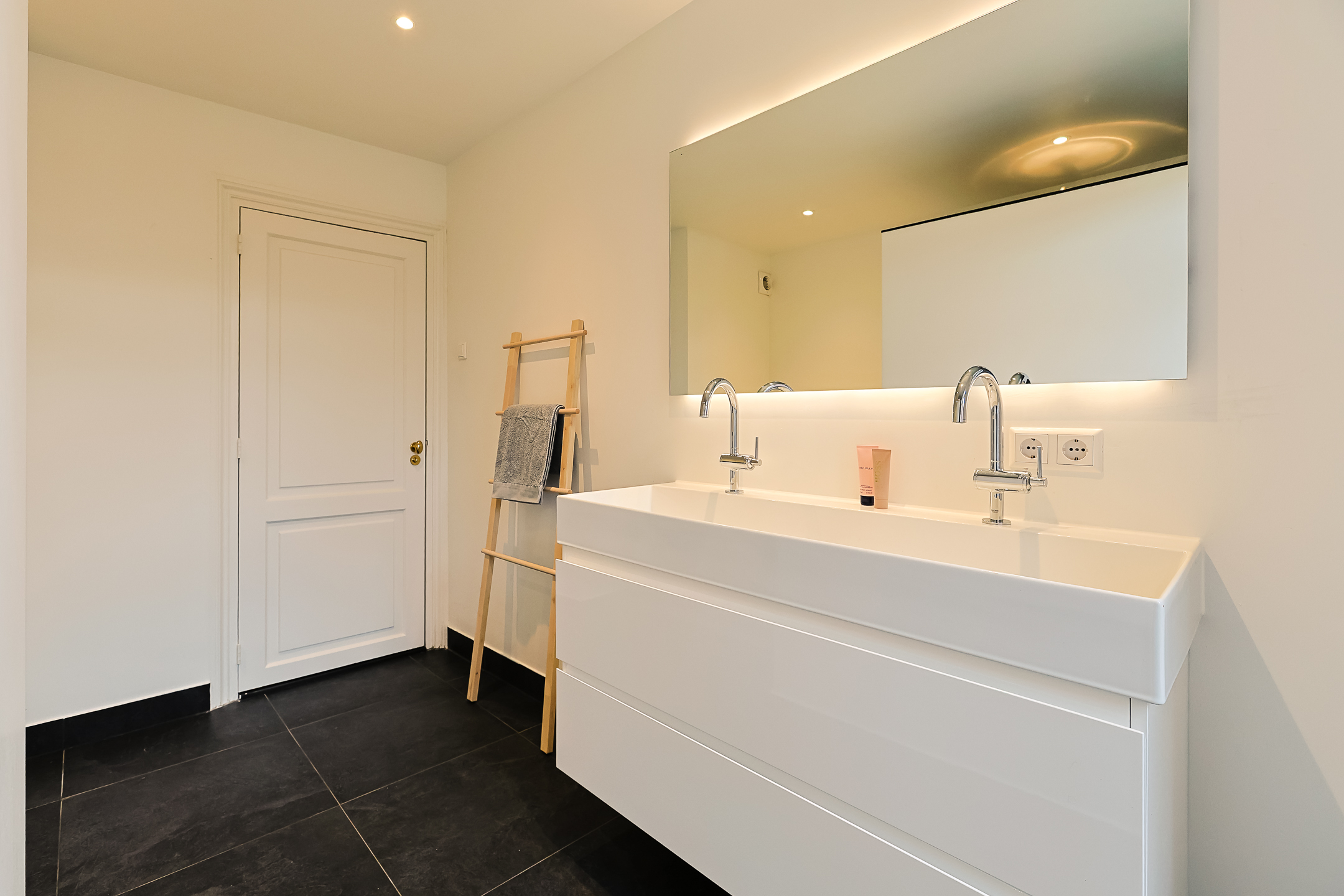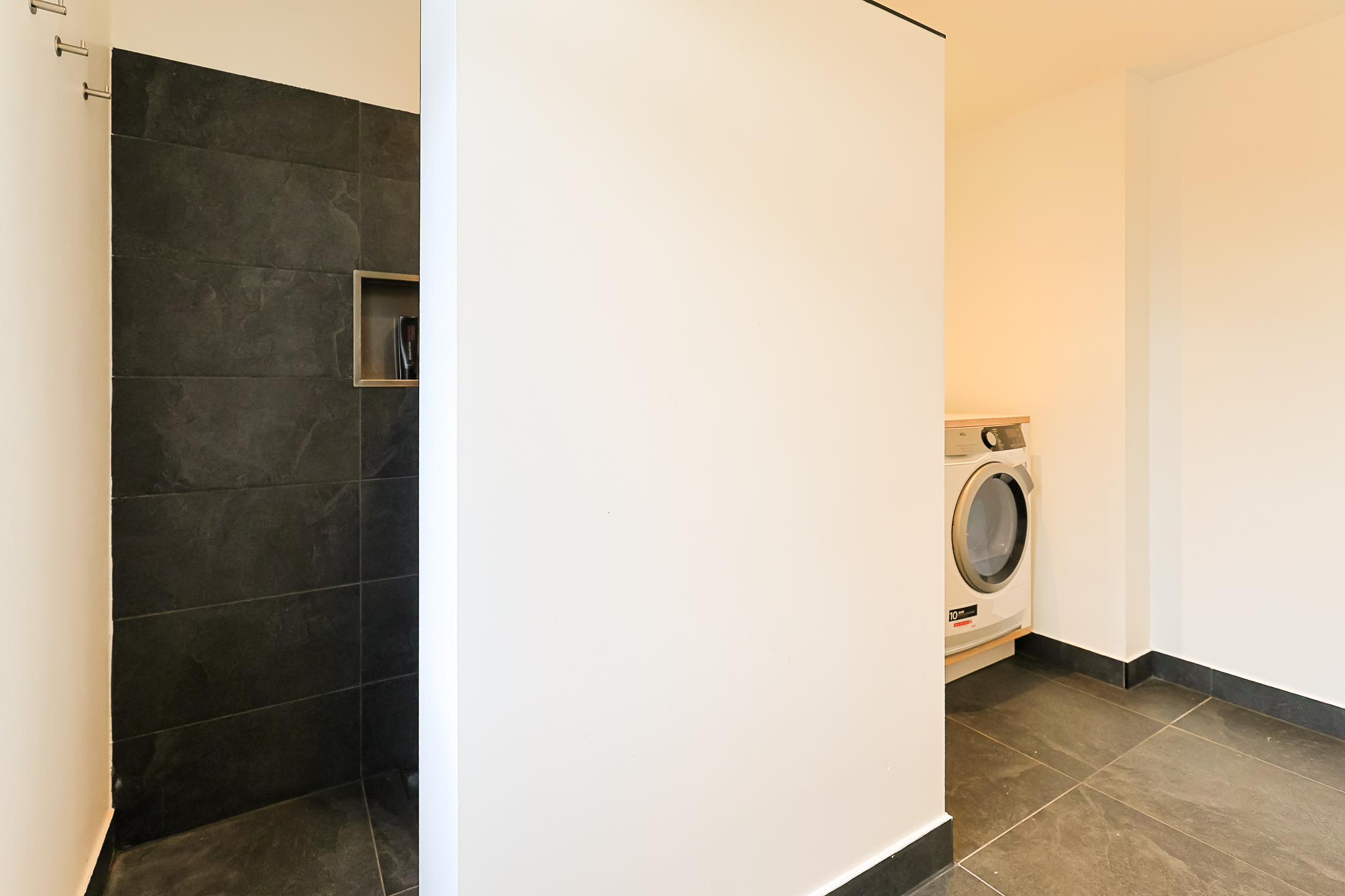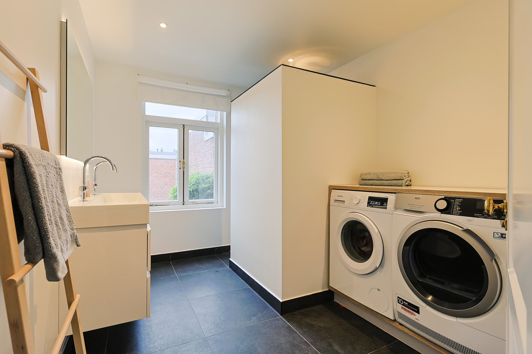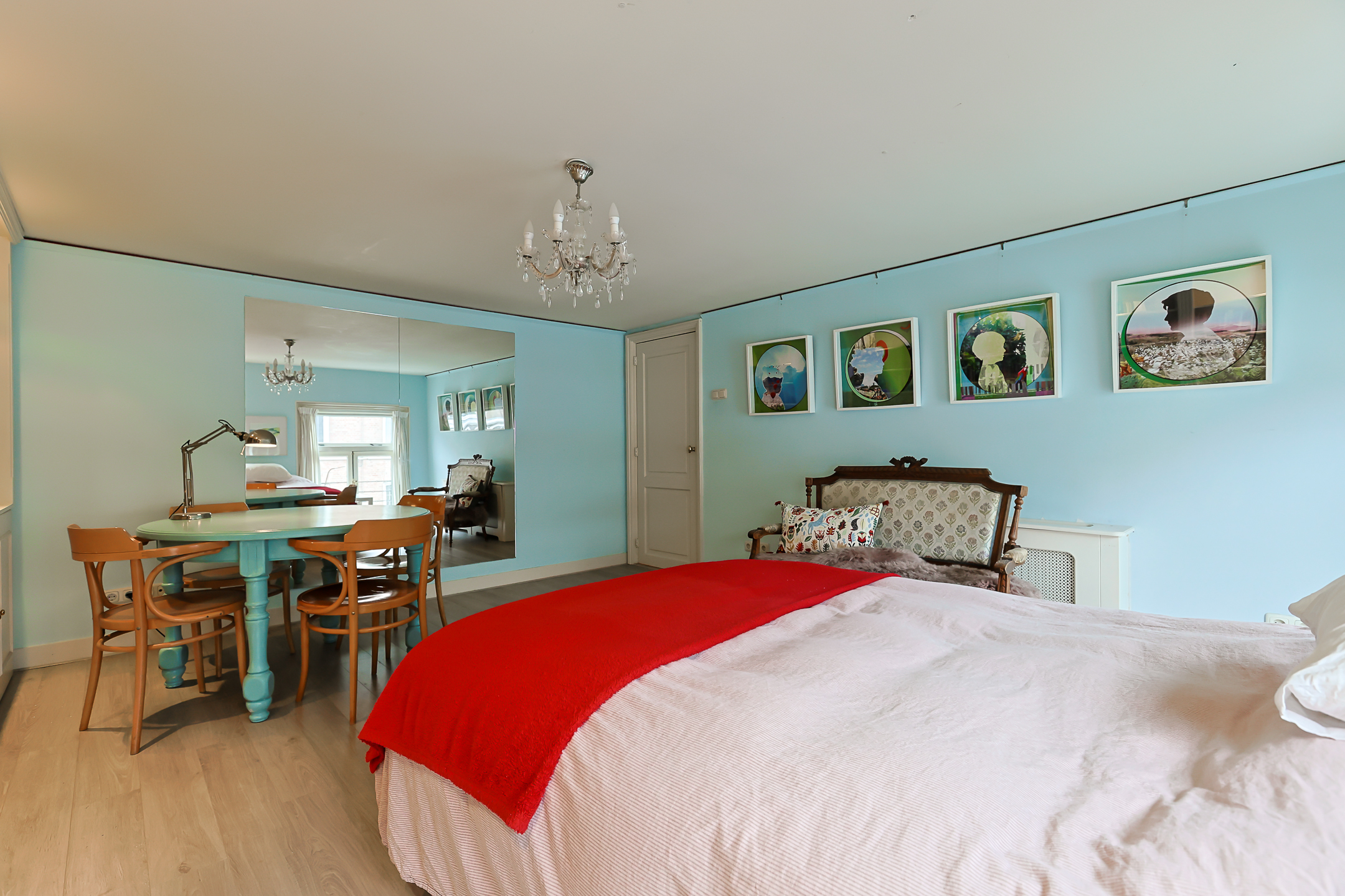 From the landing, you have access to the spacious front room, which features a beautiful built-in wardrobe wall. The front-side room is currently set up as a studio. The second, modern-finished bathroom has a walk-in shower and a double sink in an attractive cabinet. This bathroom also houses the space for the washing machine and dryer. The bathroom is equipped with underfloor heating. The very bright back room is spacious and has a staircase leading to the surprisingly large attic room above.