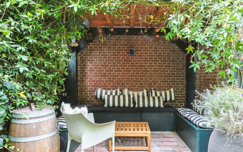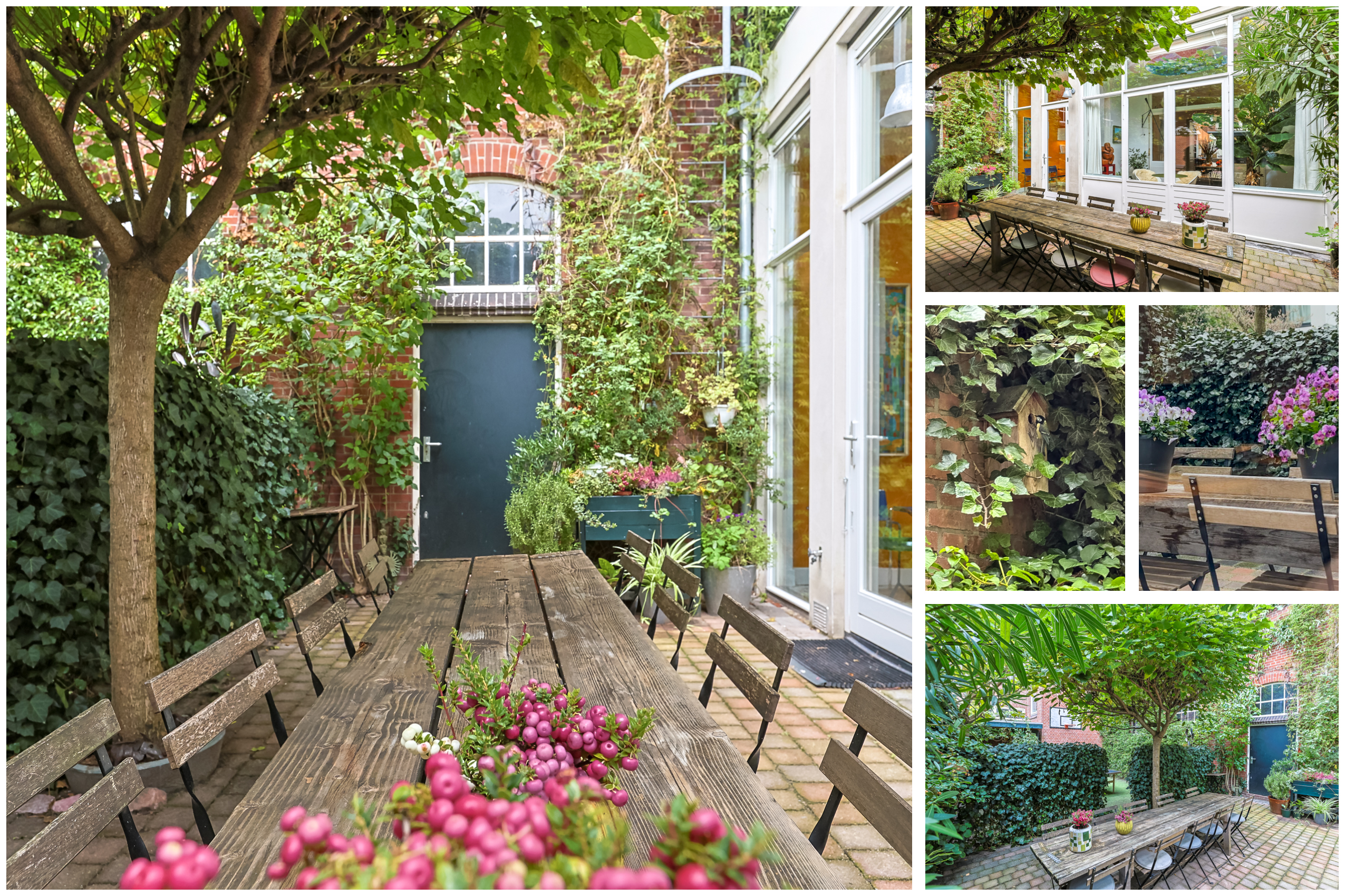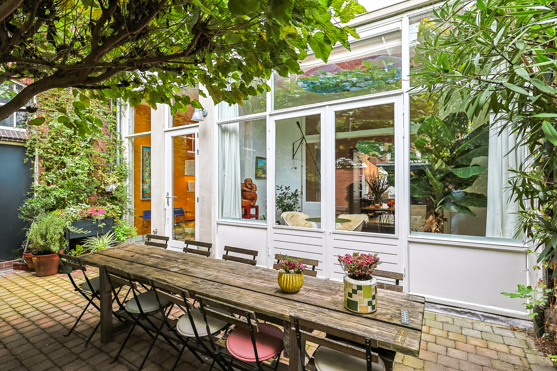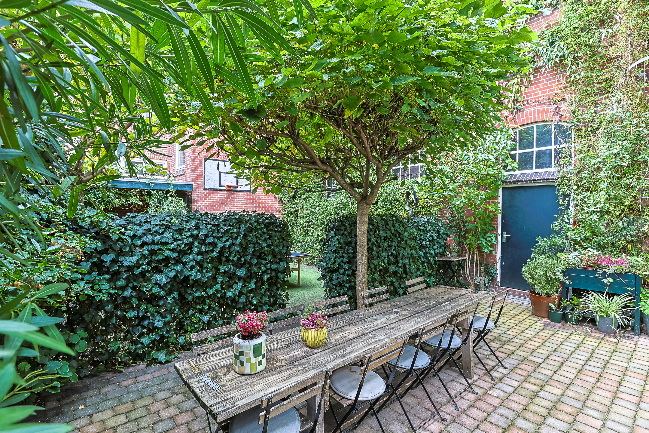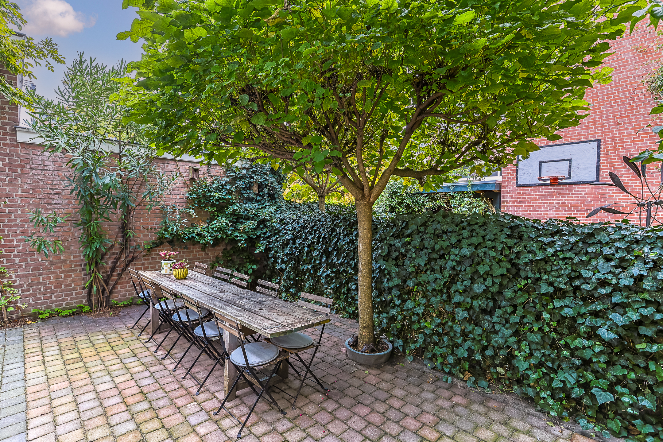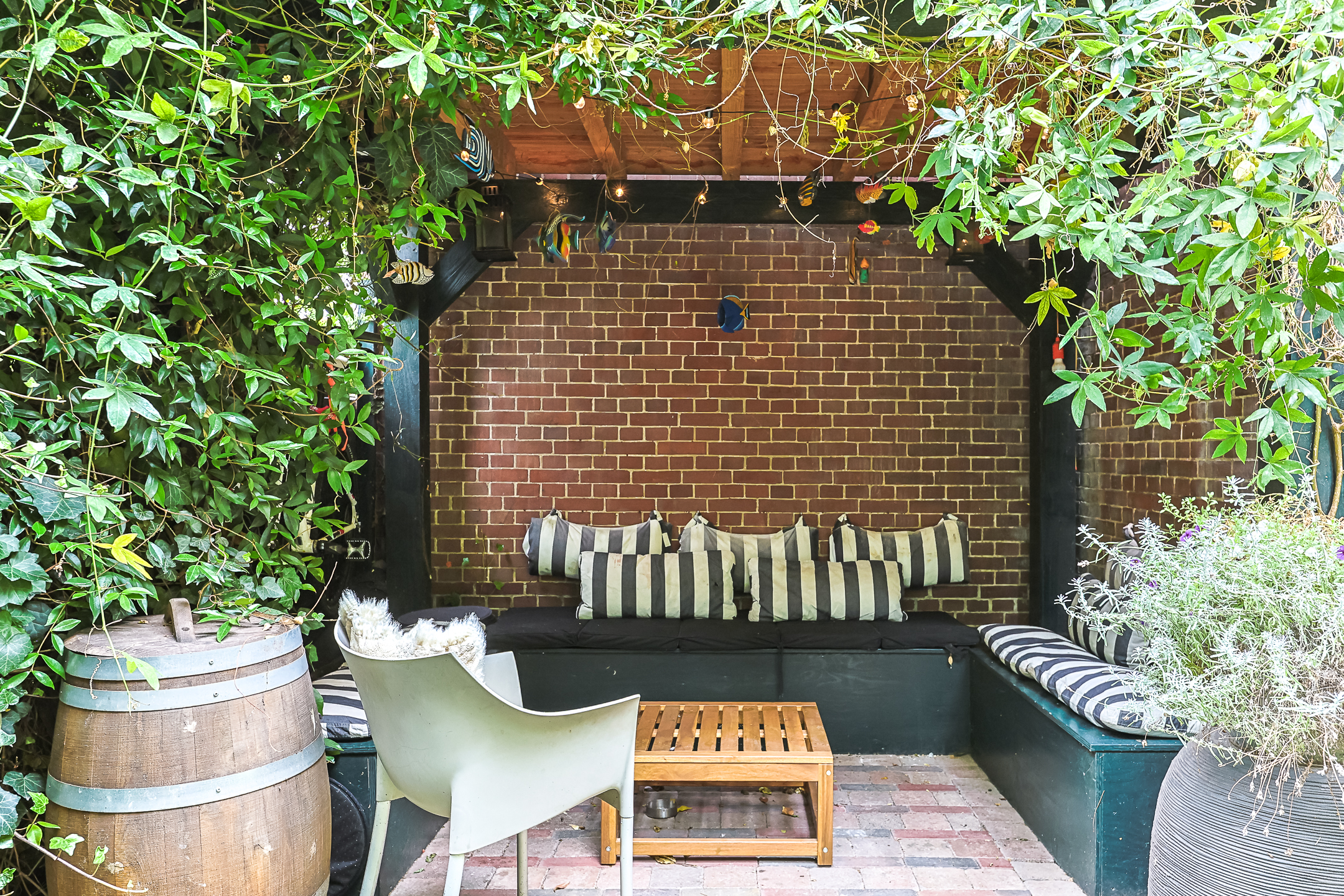 The private, romantic, and very sunny garden is a fragrant paradise of Jasmine, Passionflower, and Clematis in the summer, with two Trumpet trees serving as umbrellas. There is a recently built gazebo where you can also enjoy sitting in less favorable weather on benches that provide space to store cushions or garden equipment.