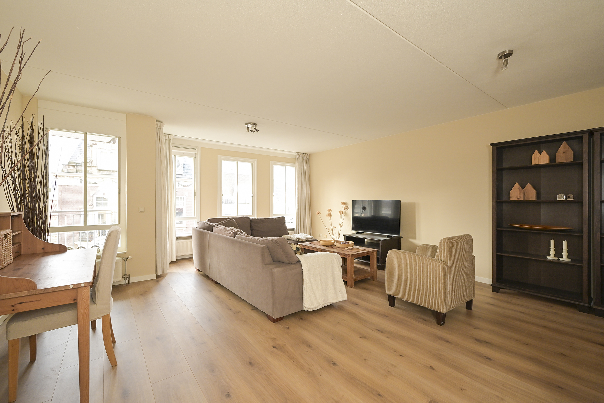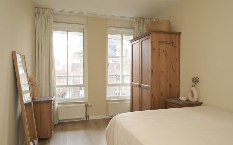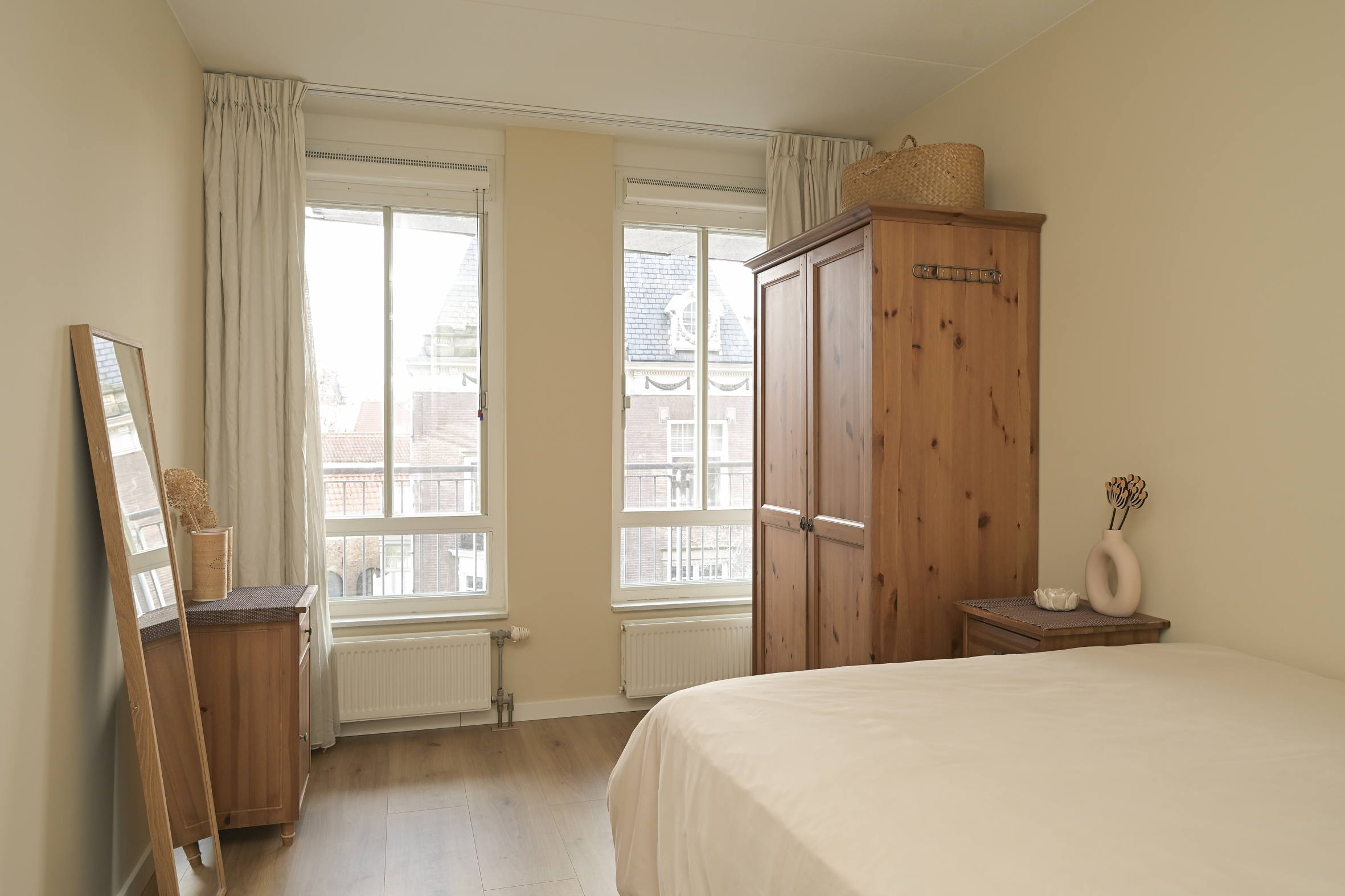 Wat hier vooral opvalt is de ruimte in de leefkamer. De woon-/eetkamer is royaal opgezet en vormt samen met de open keuken een prettige plek om te leven, te werken en gasten te ontvangen. Via de woonkamer is er toegang tot het balkon. Aan de voorzijde, richting de Fluwelen Burgwal, bevinden zich twee slaapkamers van goed formaat, met toegang tot het balkon.