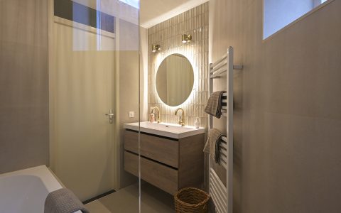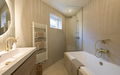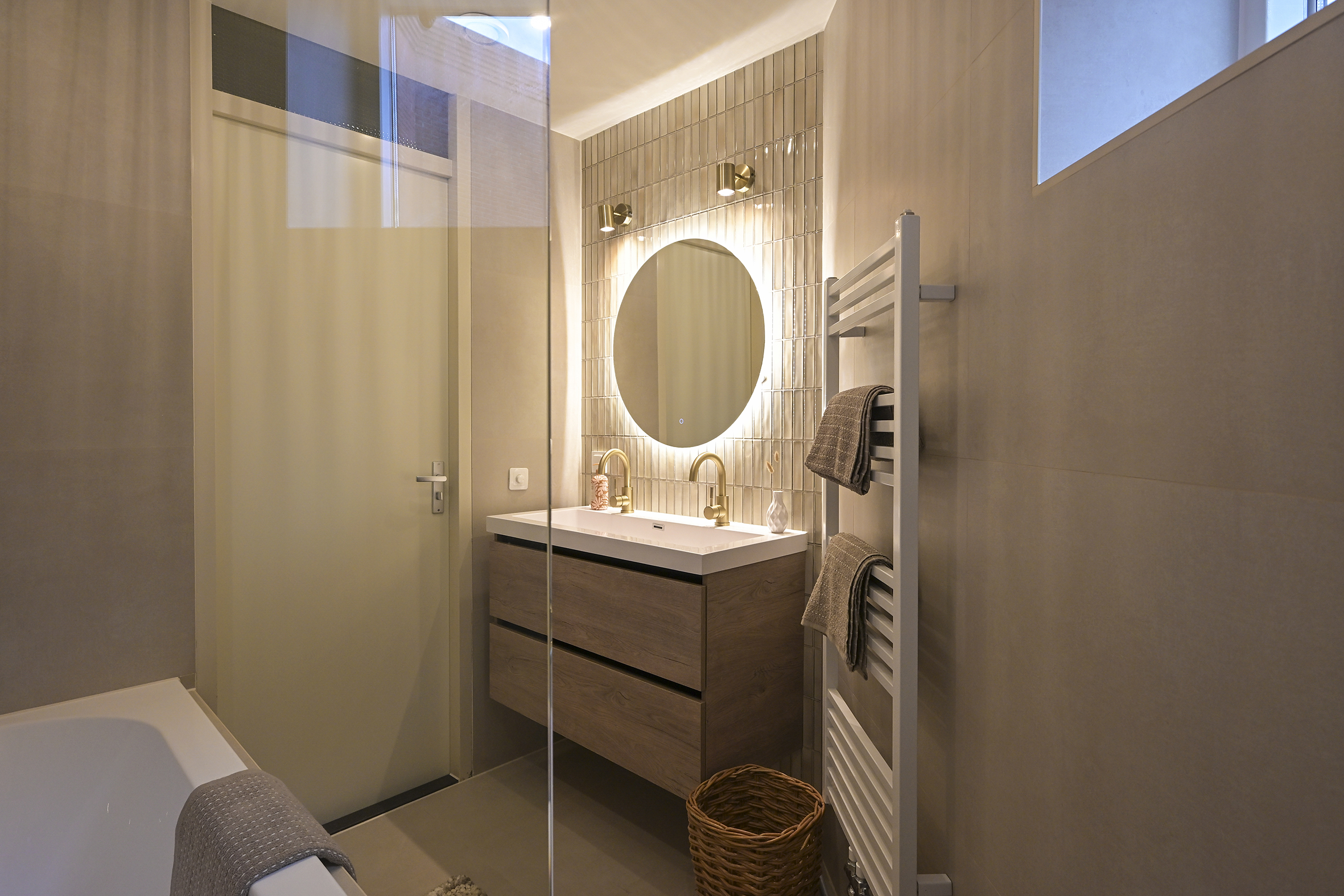 Hal met video-intercom. Zeer ruime woon-/eetkamer met open keuken en toegang tot het balkon. Twee slaapkamers aan de voorzijde met toegang tot het balkon. Luxe, recent vernieuwde badkamer met ligbad, inloopdouche en wastafel, plus handdoekradiator. Separaat toilet met fonteintje.