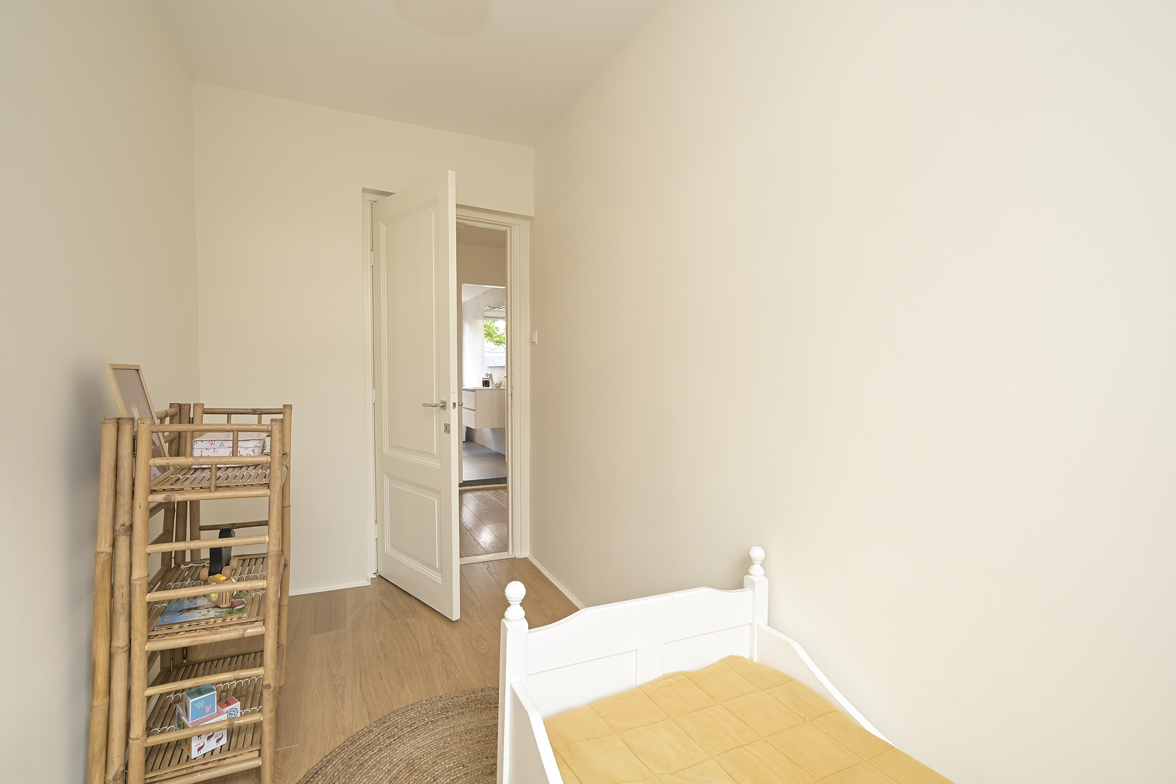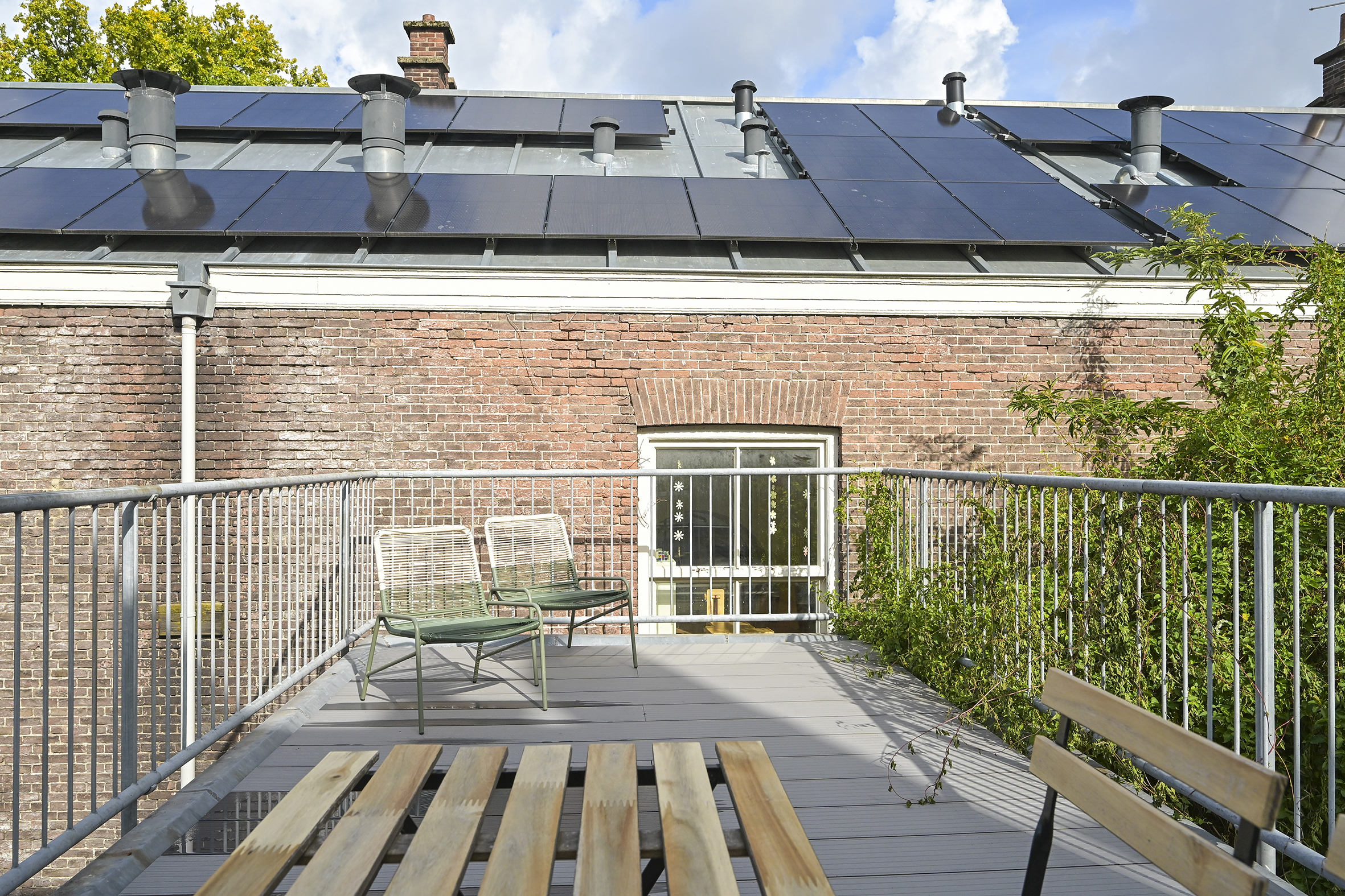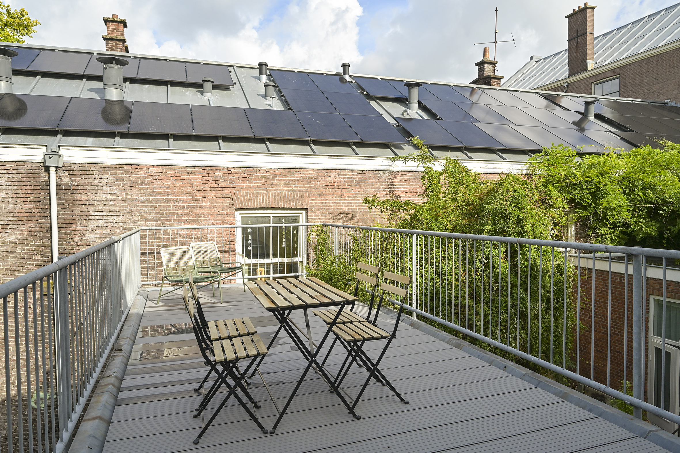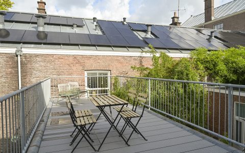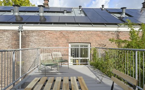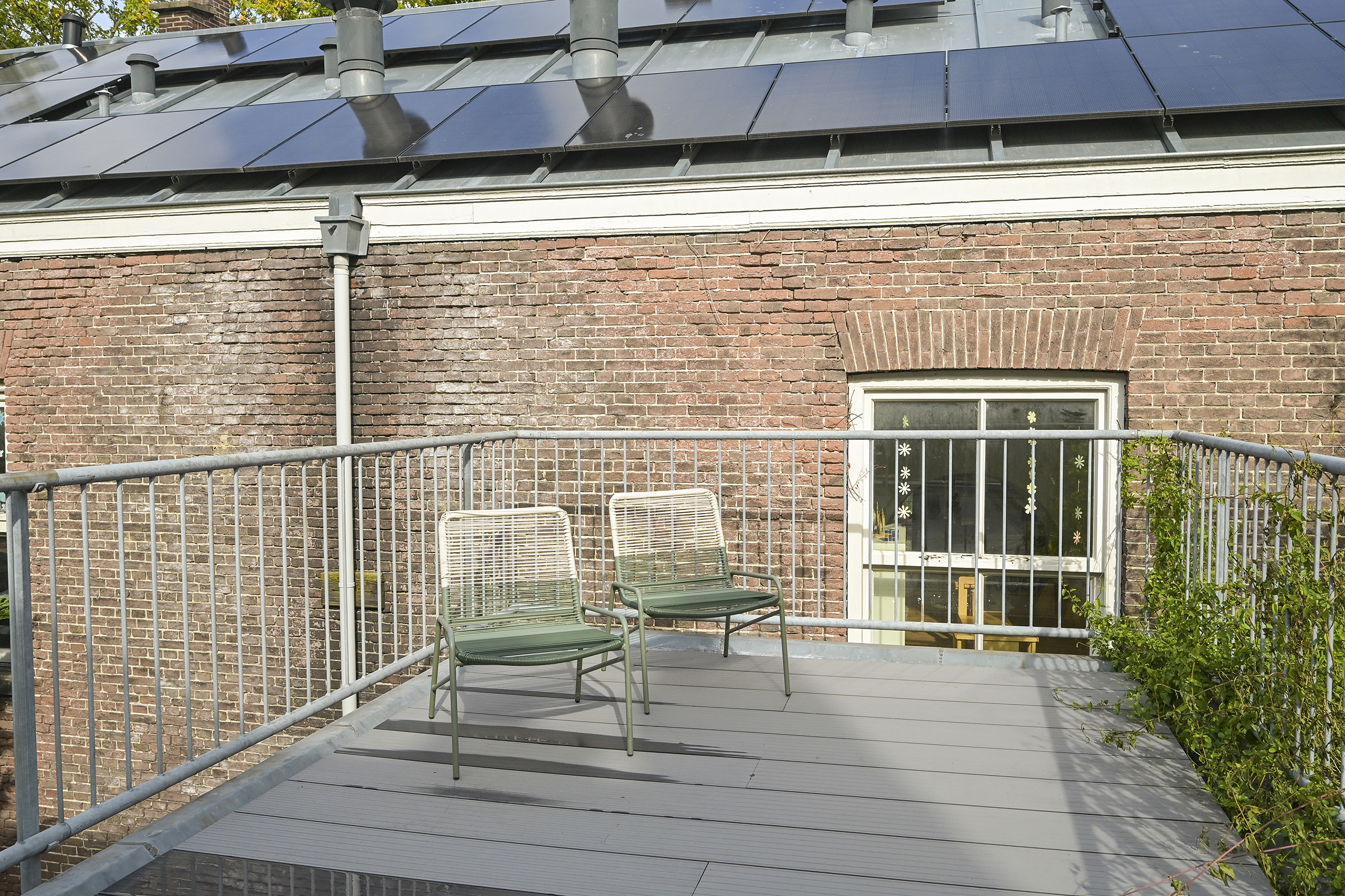 Aan de achterzijde van de keuken ligt een zonnig dakterras – dé plek om te genieten van een kop koffie in de ochtendzon of een borrel met vrienden. Op de tweede verdieping bevinden zich twee royale slaapkamers en een derde (slaap-/werk)kamer. De moderne badkamer voorzien van vloerverwarming heeft een grote inloopdouche, dubbele wastafel, toilet, handdoekdroger en een Siemens wasmachine en droger.