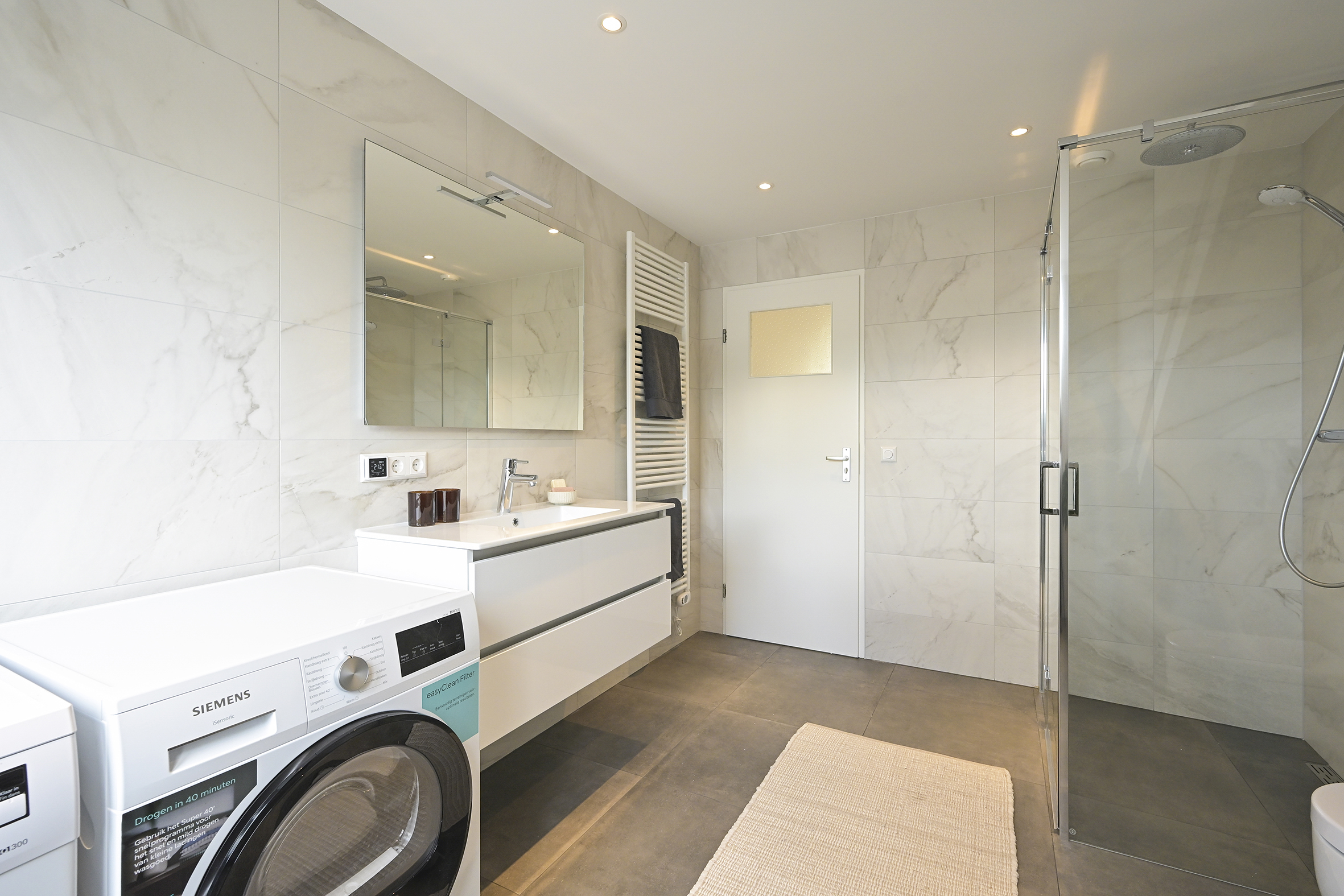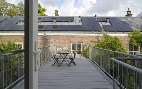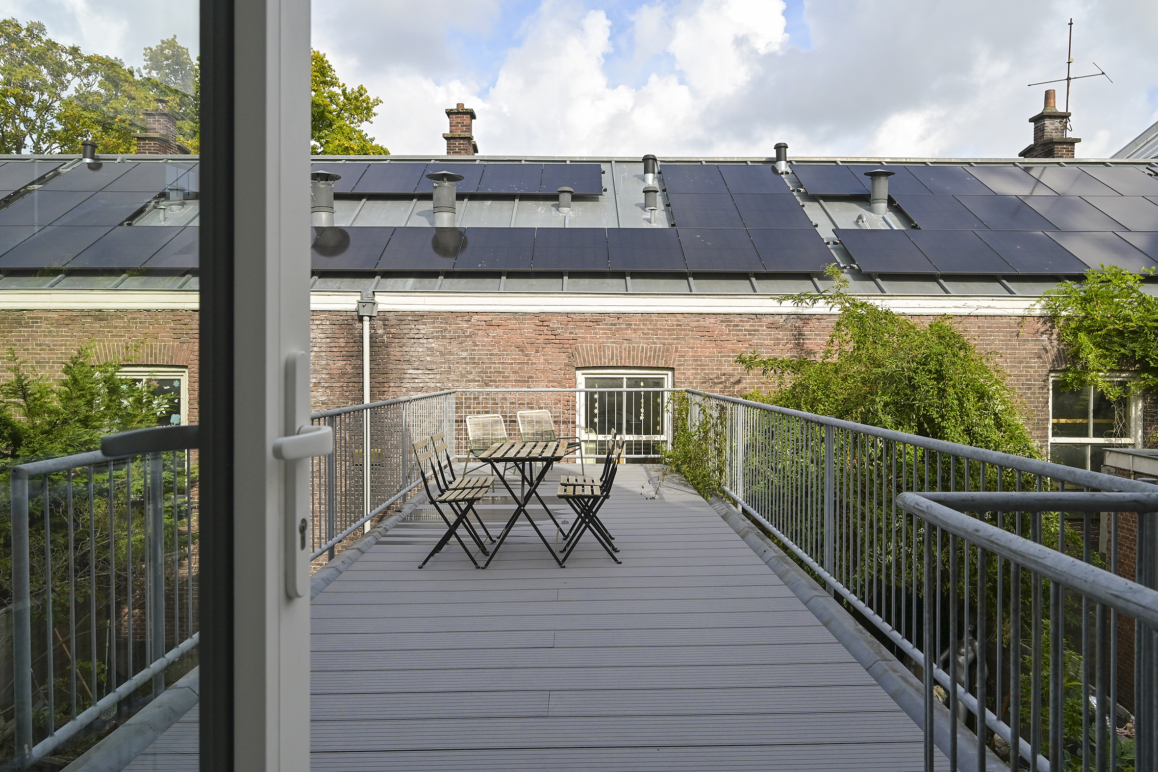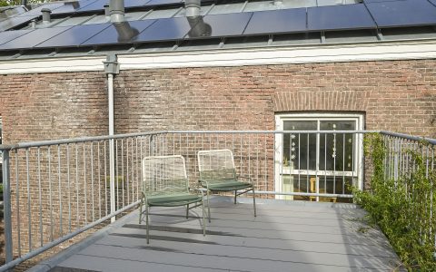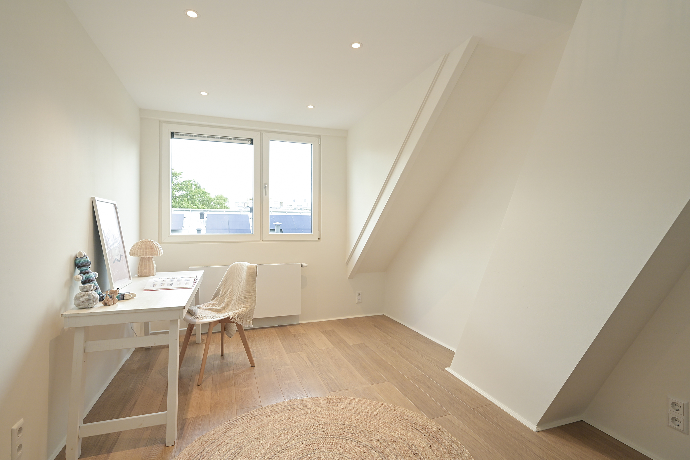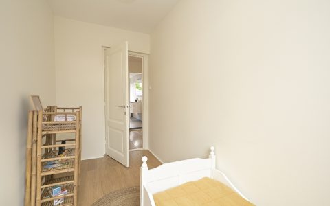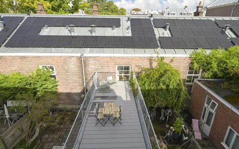 Aan de achterzijde van de keuken ligt een zonnig dakterras – dé plek om te genieten van een kop koffie in de ochtendzon of een borrel met vrienden. Op de tweede verdieping bevinden zich twee royale slaapkamers en een derde (slaap-/werk)kamer. De moderne badkamer voorzien van vloerverwarming heeft een grote inloopdouche, dubbele wastafel, toilet, handdoekdroger en een Siemens wasmachine en droger.
