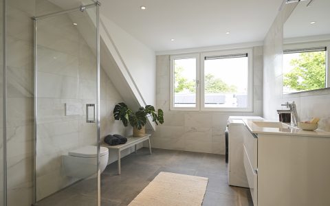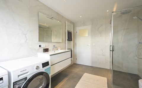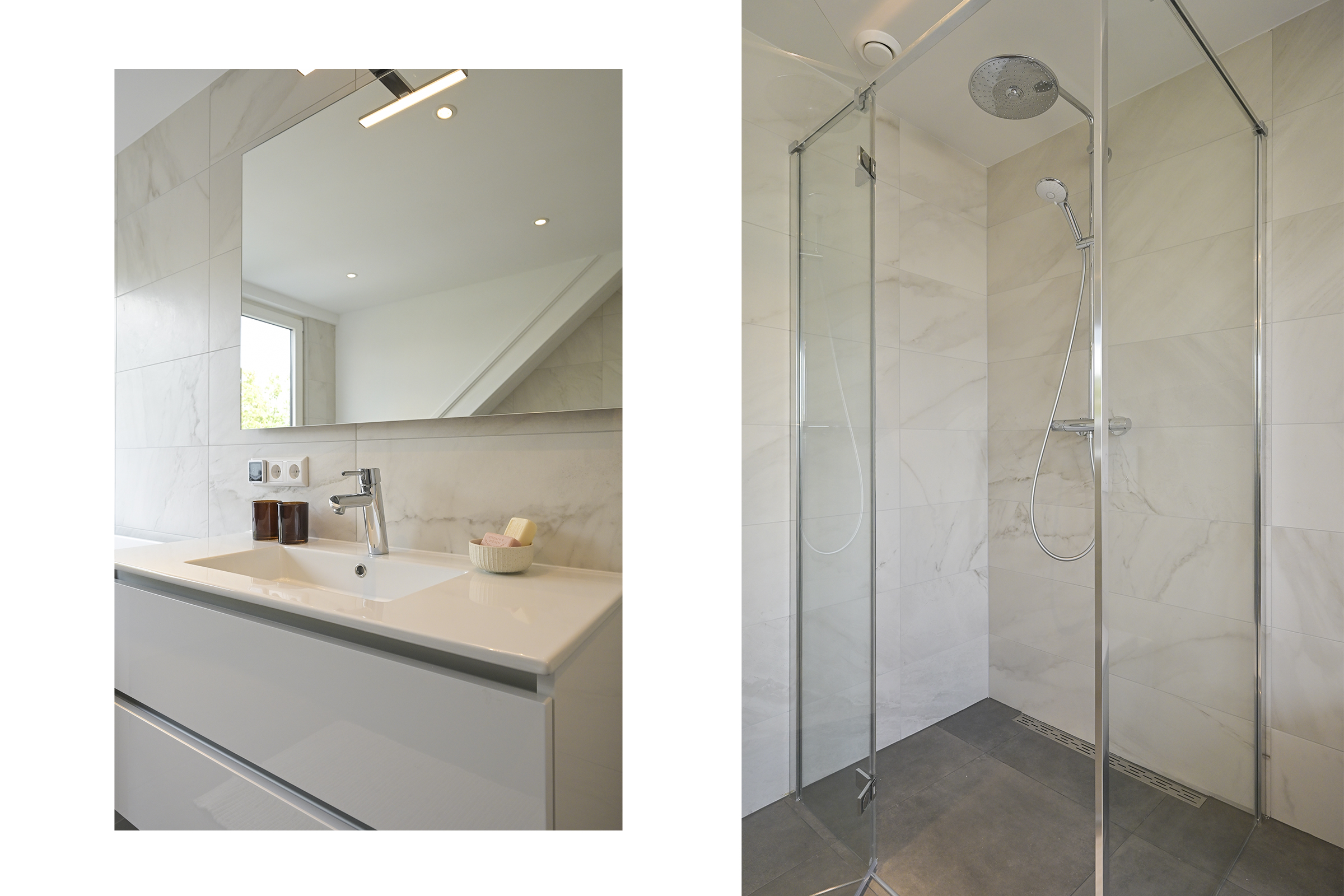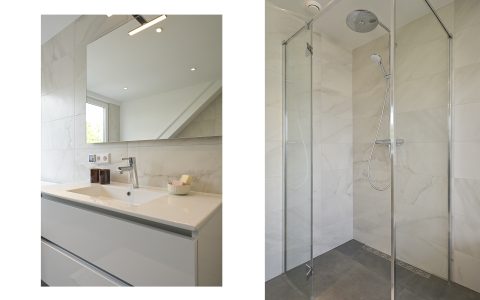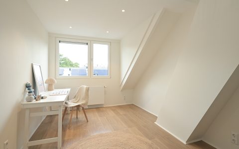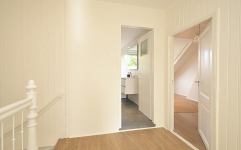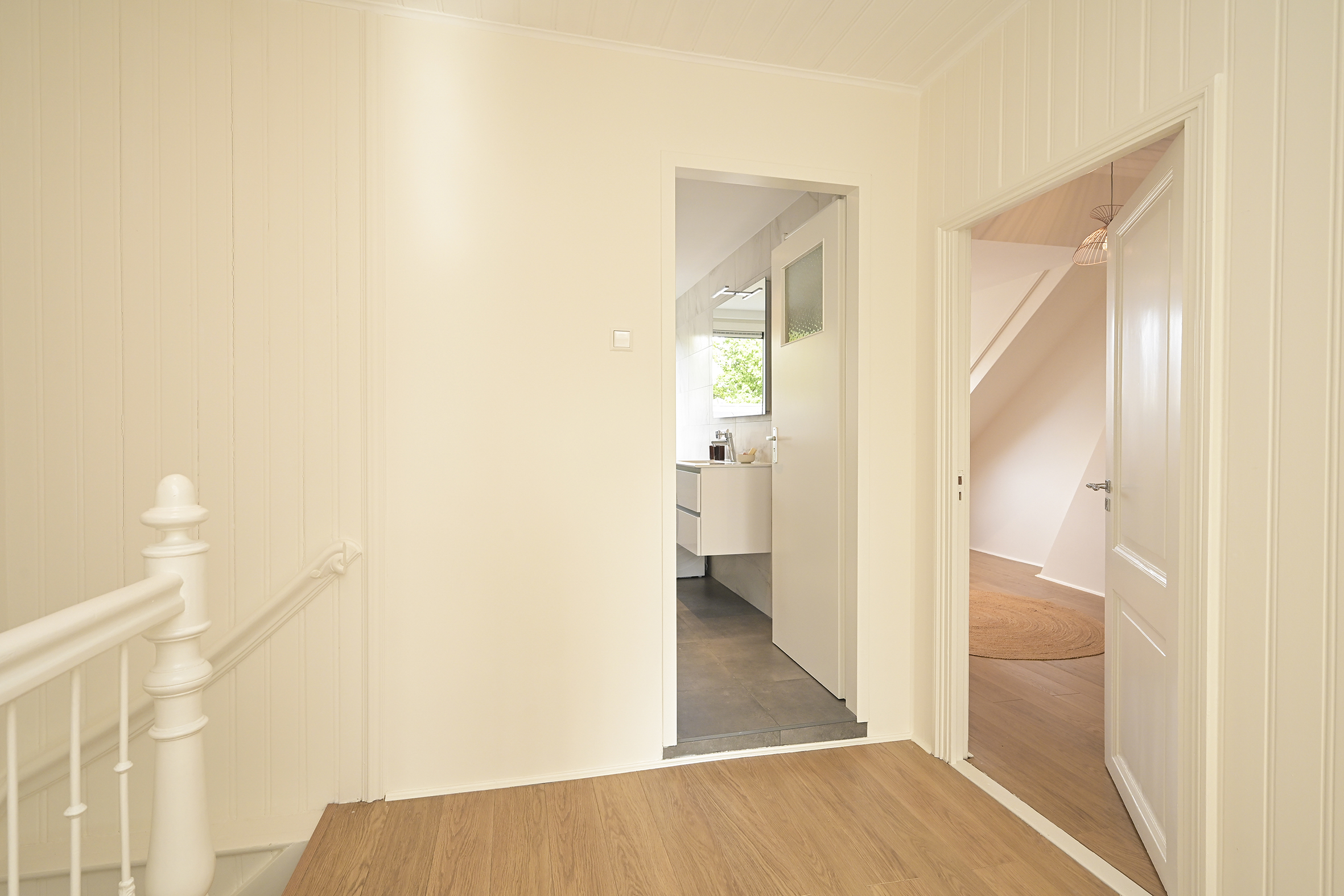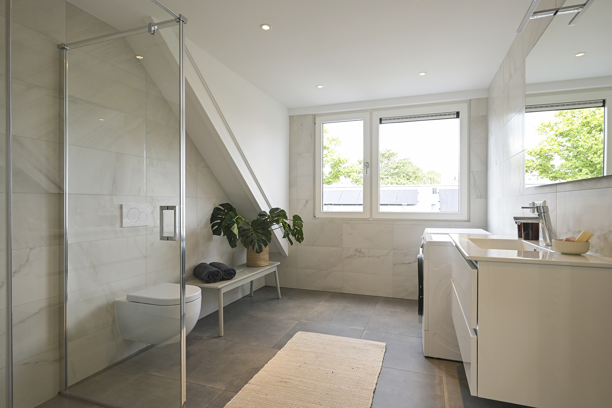 Aan de achterzijde van de keuken ligt een zonnig dakterras – dé plek om te genieten van een kop koffie in de ochtendzon of een borrel met vrienden. Op de tweede verdieping bevinden zich twee royale slaapkamers en een derde (slaap-/werk)kamer. De moderne badkamer voorzien van vloerverwarming heeft een grote inloopdouche, dubbele wastafel, toilet, handdoekdroger en een Siemens wasmachine en droger.