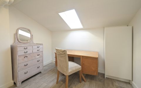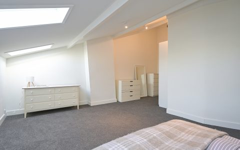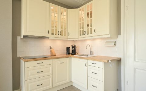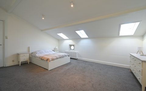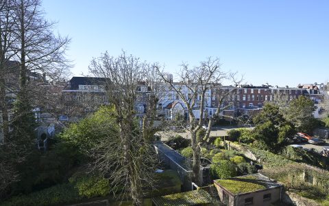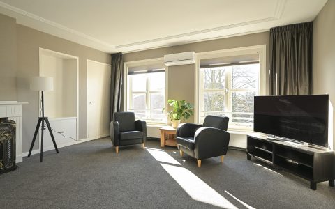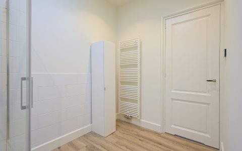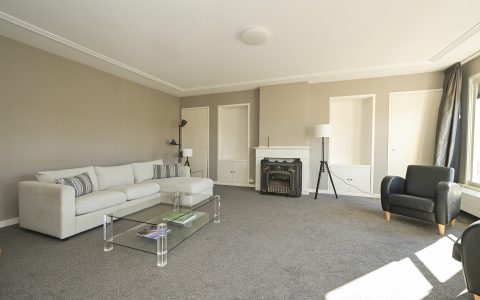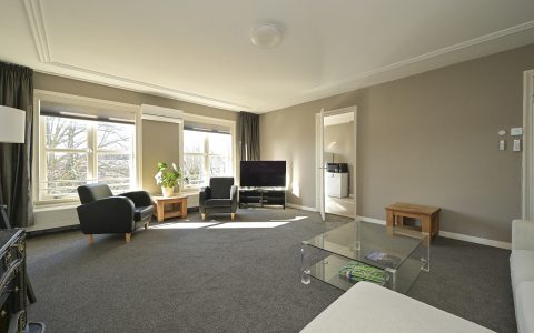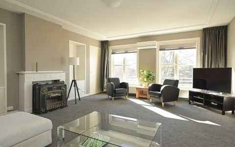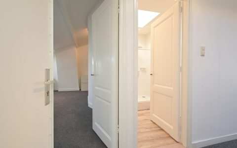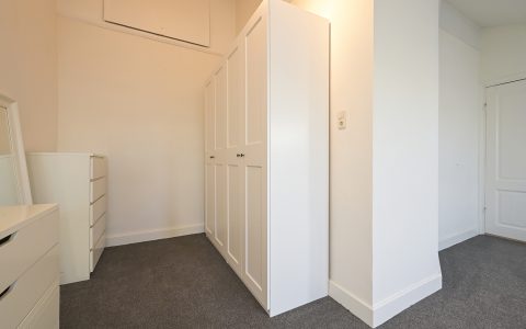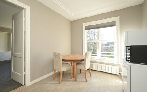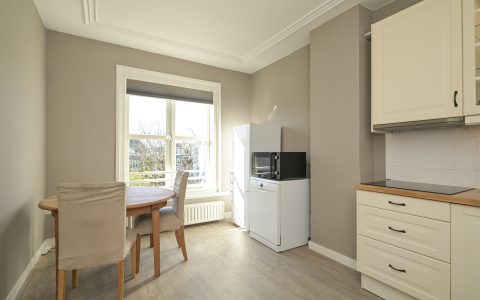 The property features a spacious bedroom with a walk-in wardrobe. At the rear, the bright and comfortable living room offers open views over the green gardens of Koninginnegracht and Balistraat. The separate kitchen is fully equipped with all necessary built-in appliances. The modern bathroom includes a walk-in shower and washbasin.