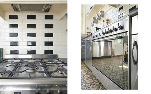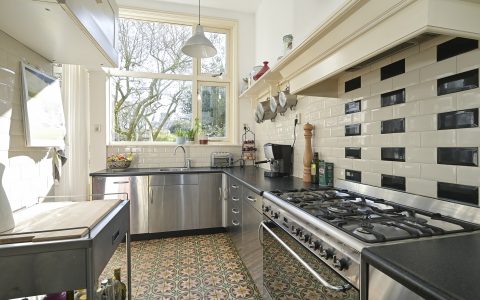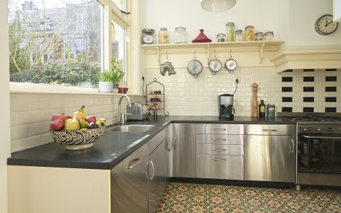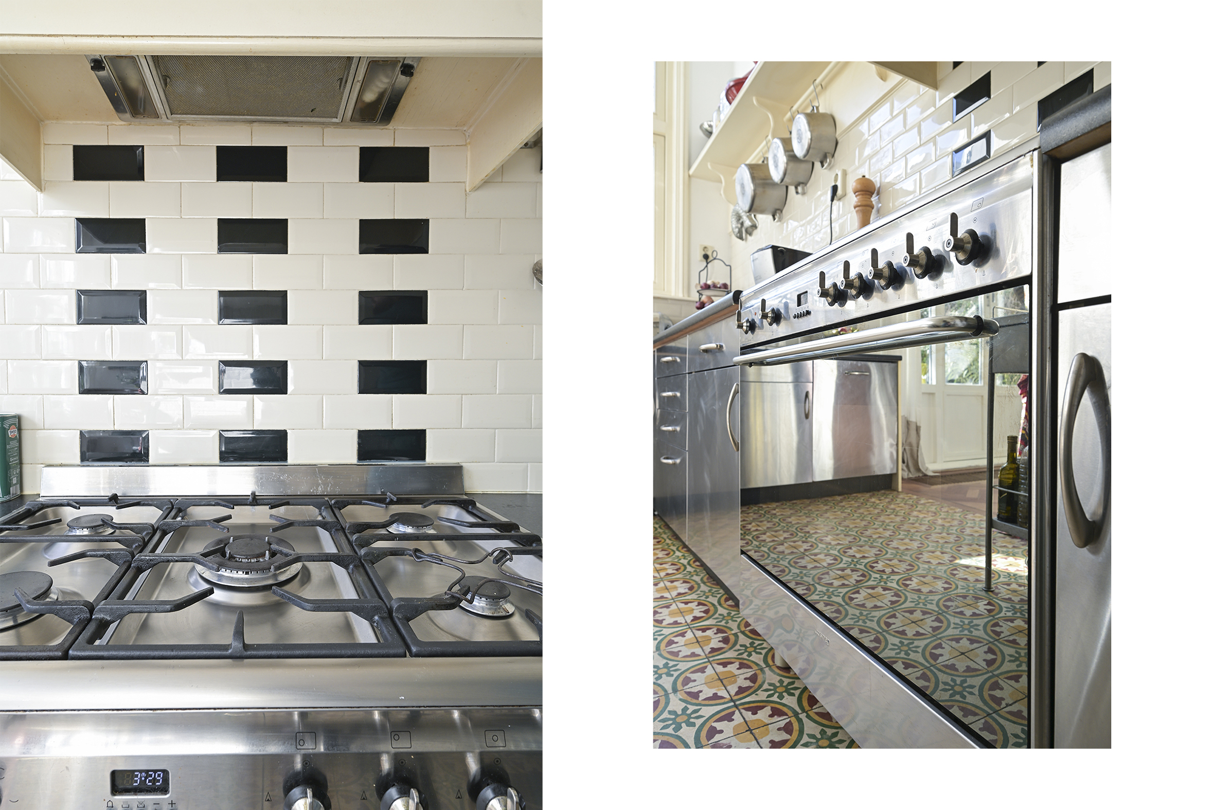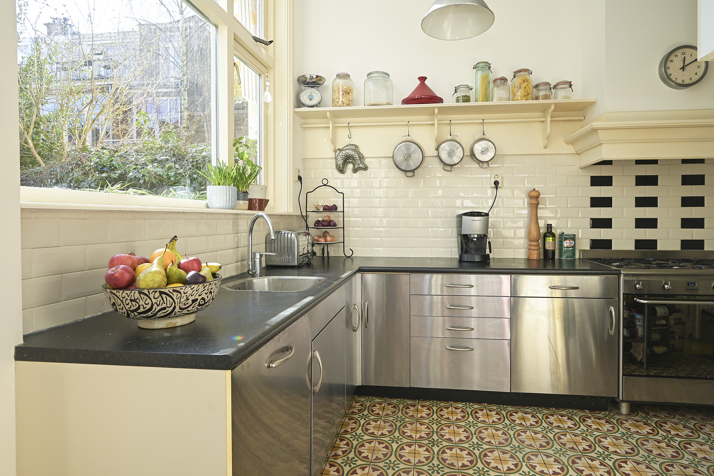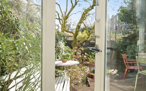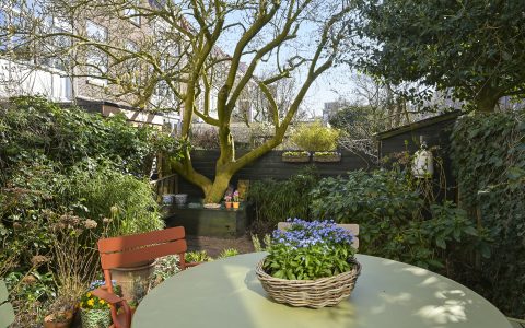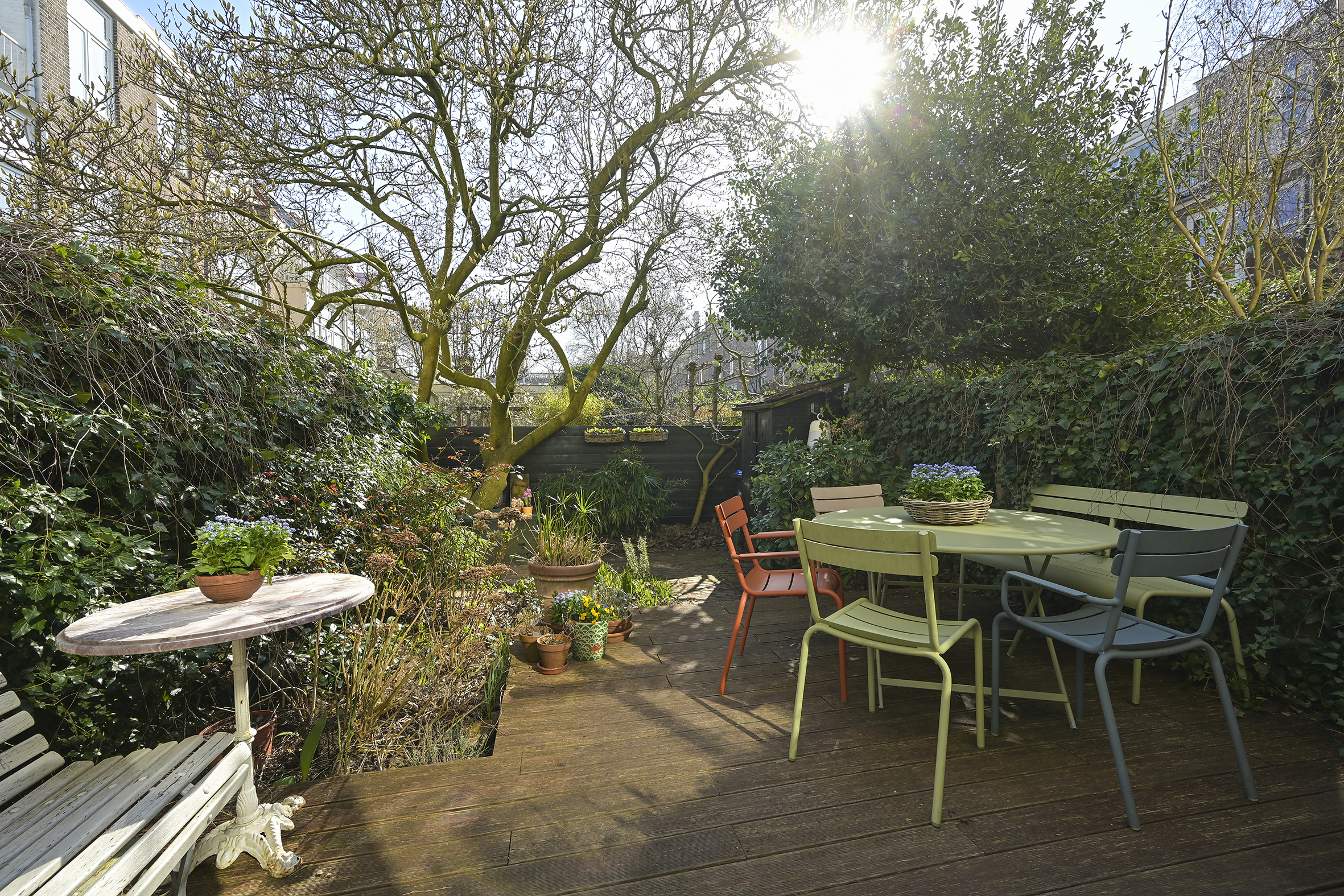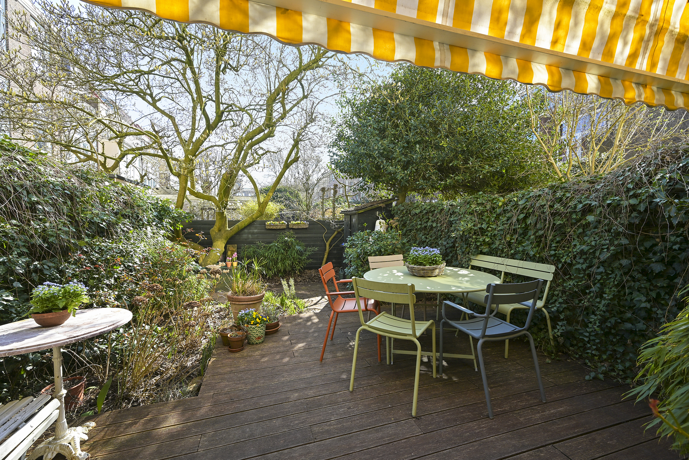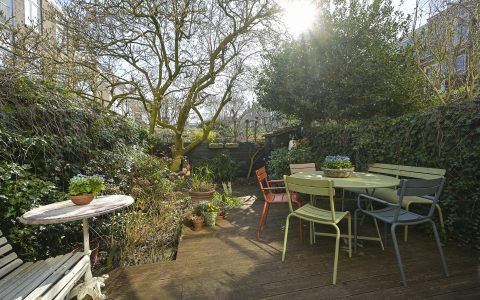The kitchen is arranged in an L-shape and is fitted with various built-in appliances, including a dishwasher, a classic mantel with extractor hood and a large five-burner cooker with integrated oven. French doors lead to the architect-designed rear garden, facing south-east and enjoying open views between the surrounding buildings. A beautiful Magnolia tree forms the centrepiece of the garden.