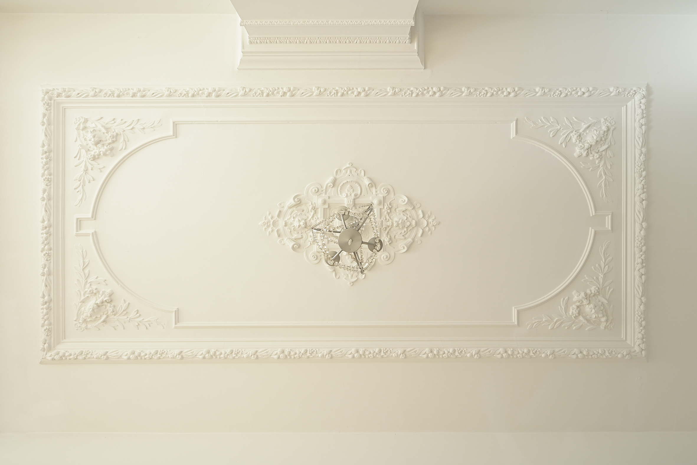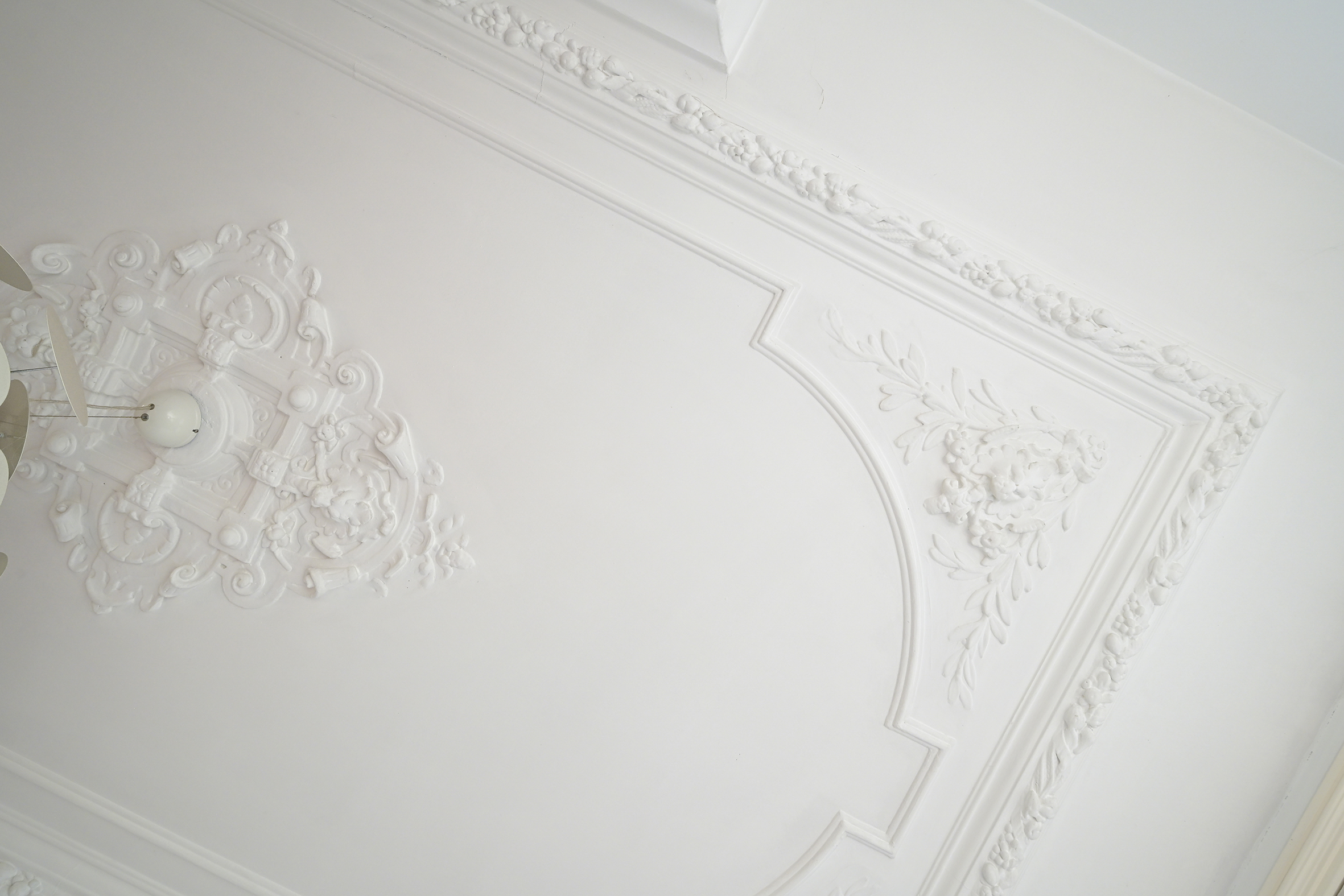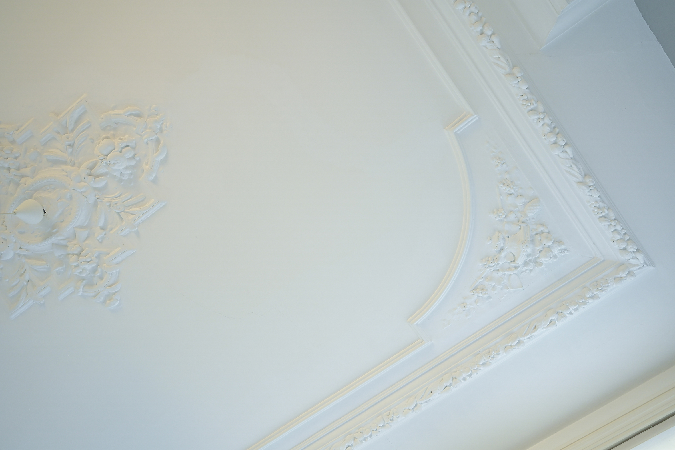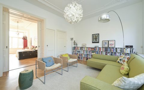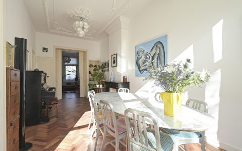 The living room en suite is particularly atmospheric thanks to its well-preserved period features, including an ornate ceiling, herringbone parquet flooring, a marble fireplace and original en suite doors. The dining room at the rear connects openly with the kitchen.