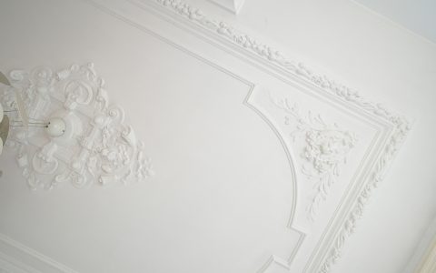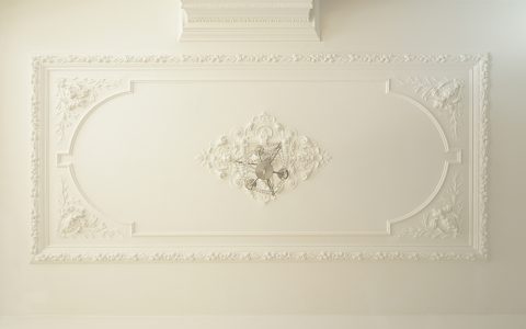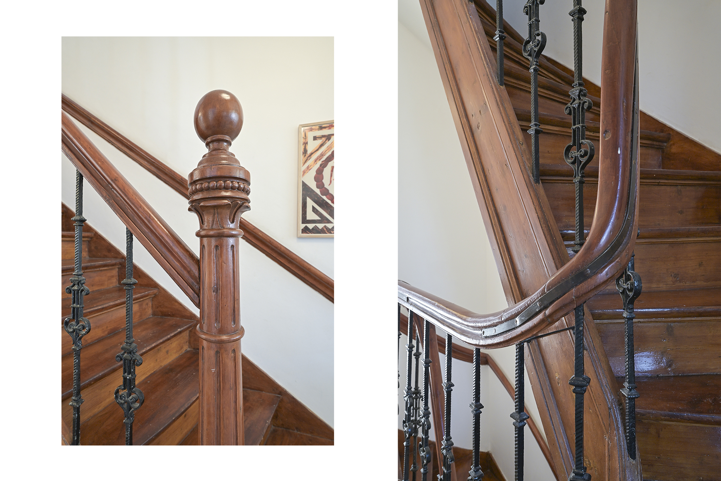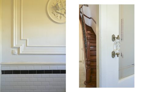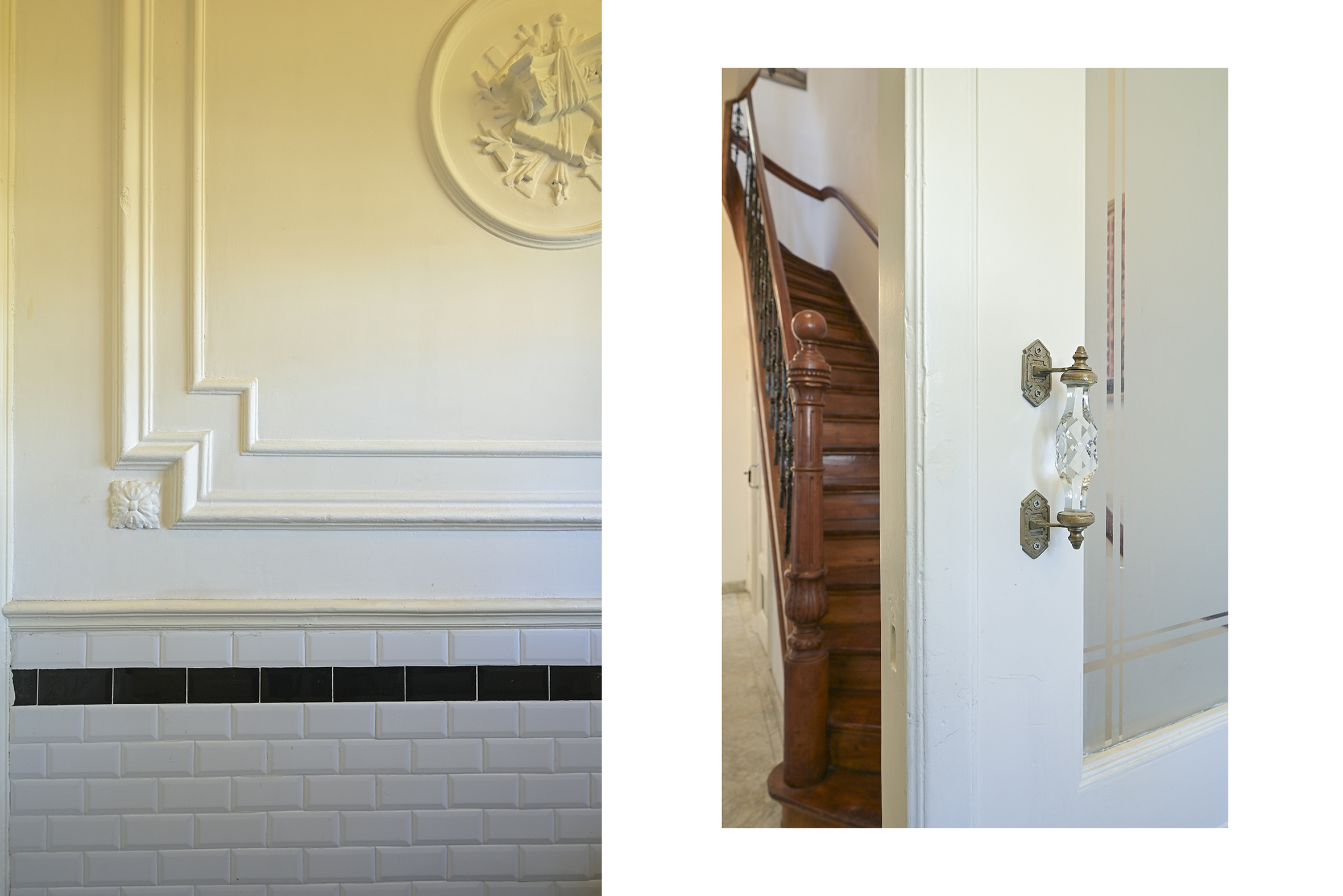 The living room en suite is particularly atmospheric thanks to its well-preserved period features, including an ornate ceiling, herringbone parquet flooring, a marble fireplace and original en suite doors. The dining room at the rear connects openly with the kitchen.