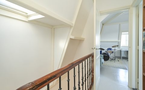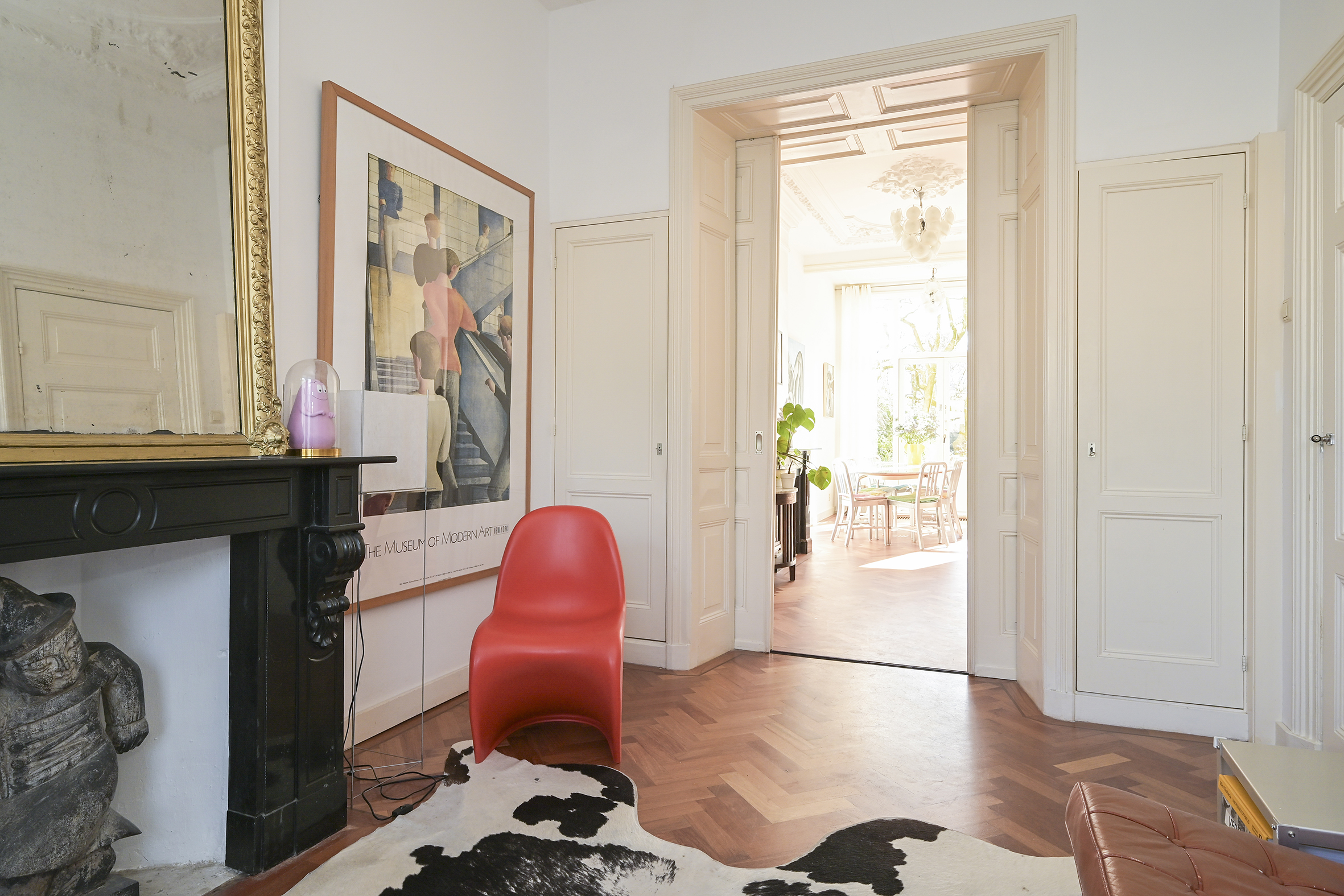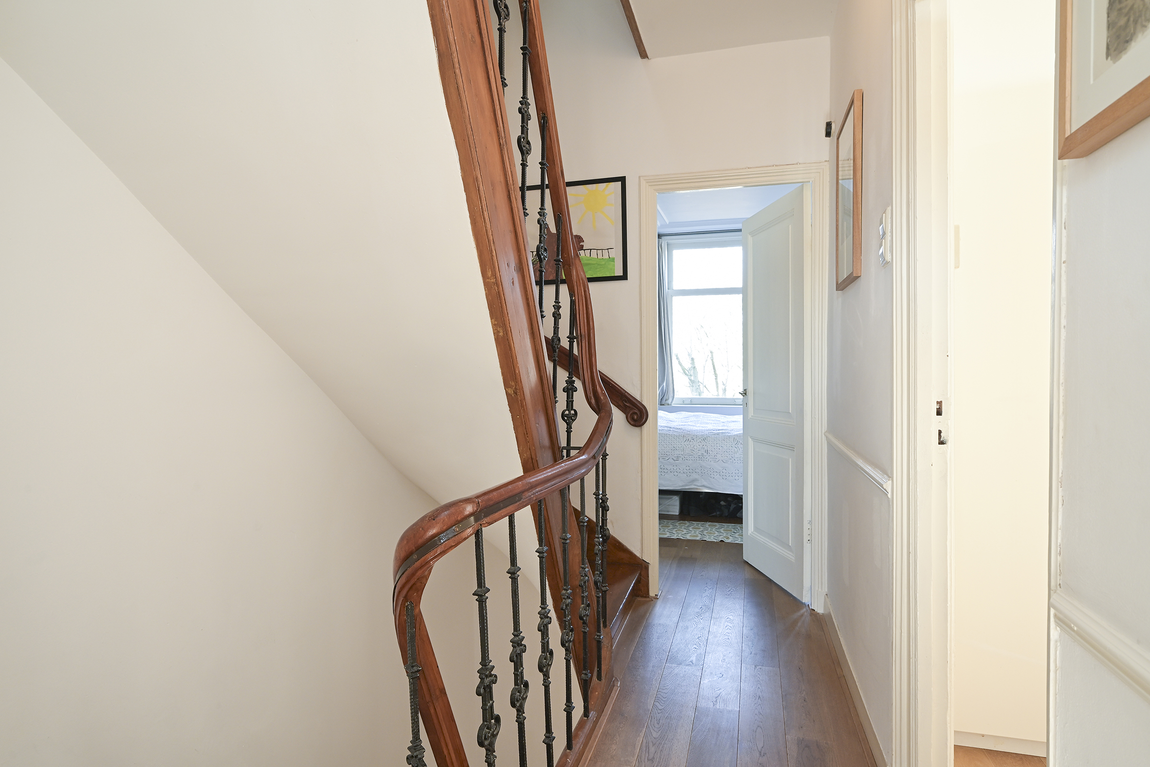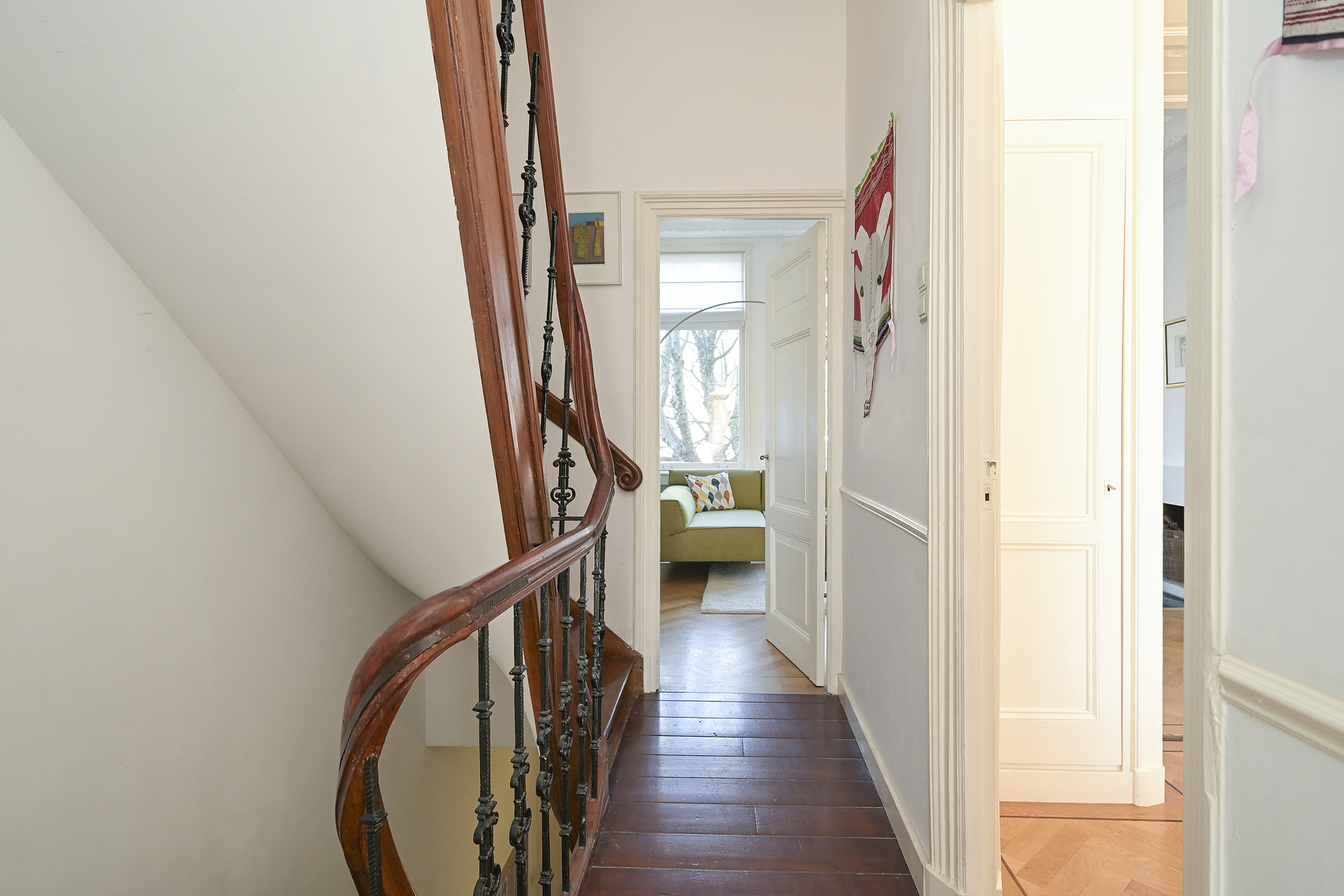 Landing, separate toilet and a beautiful second living room spanning the full width of the house. This elegant room features herringbone parquet flooring, an ornamental ceiling and a fireplace, with lovely views across Koningsplein.