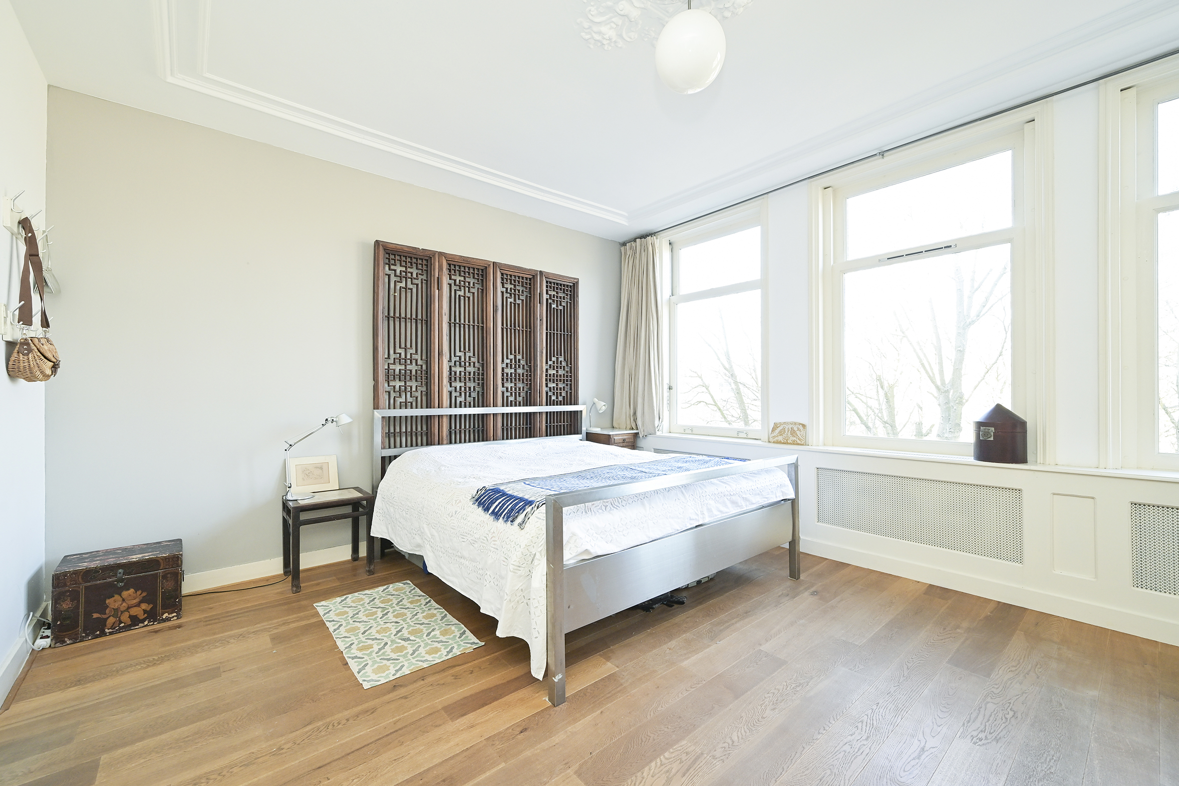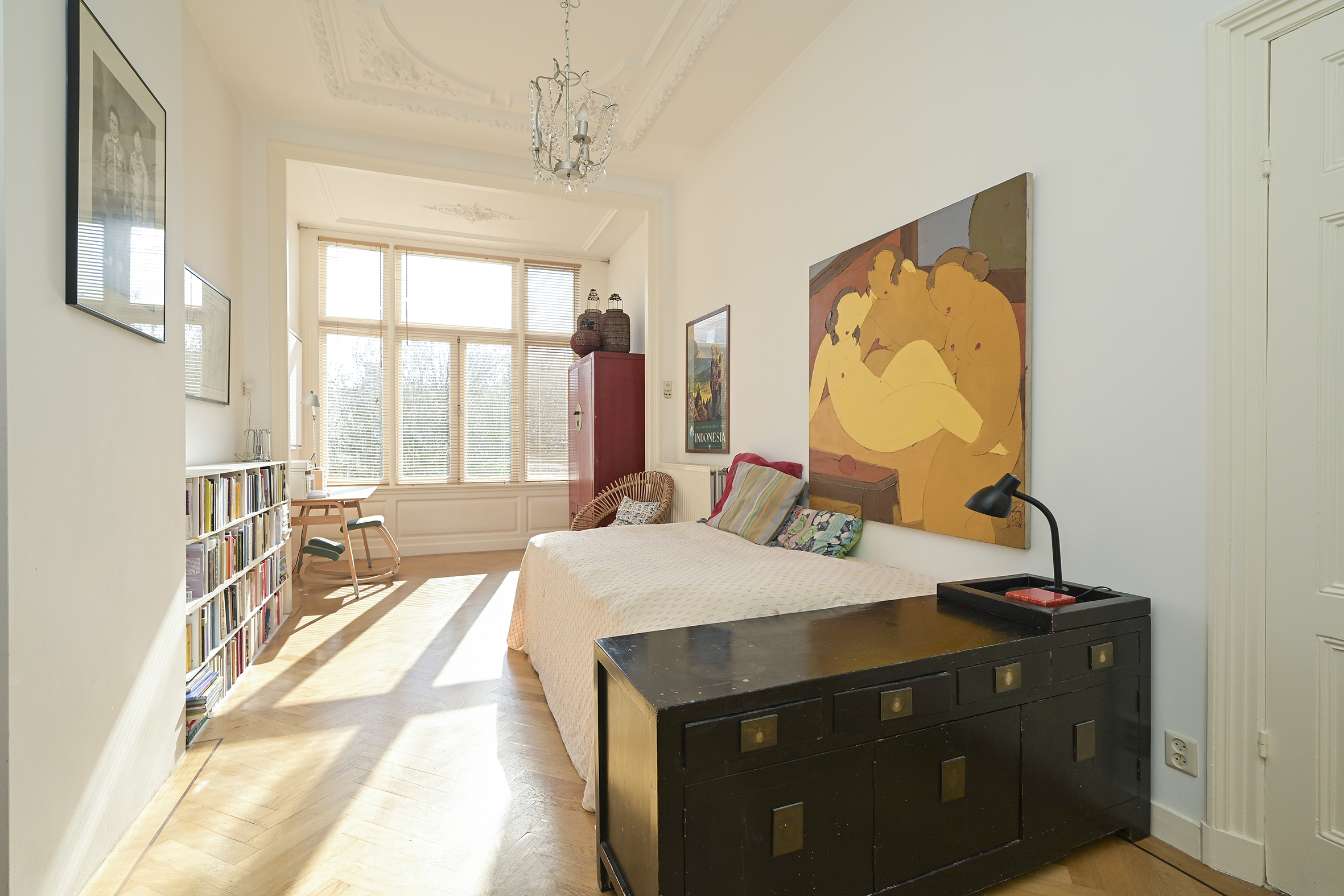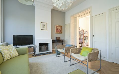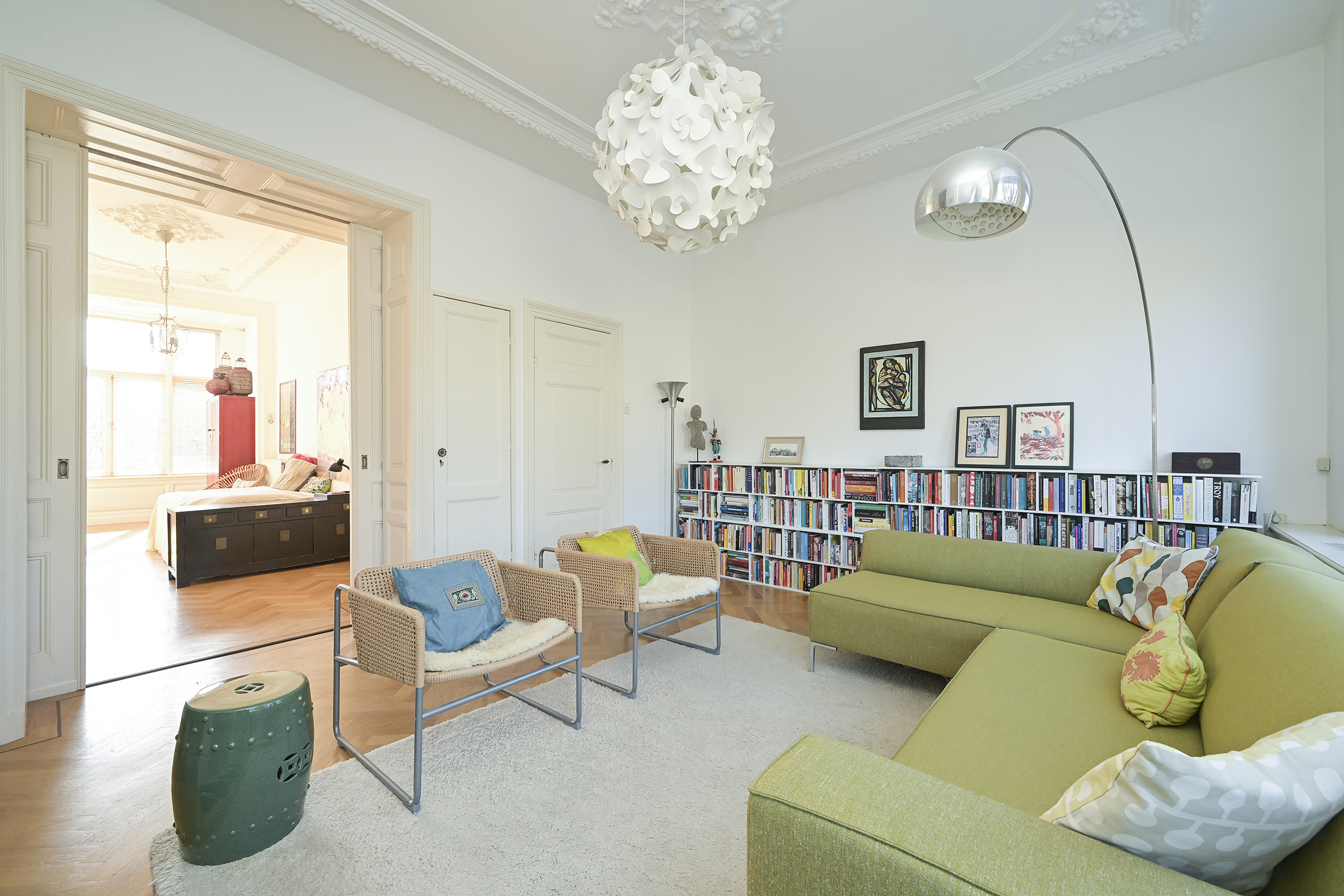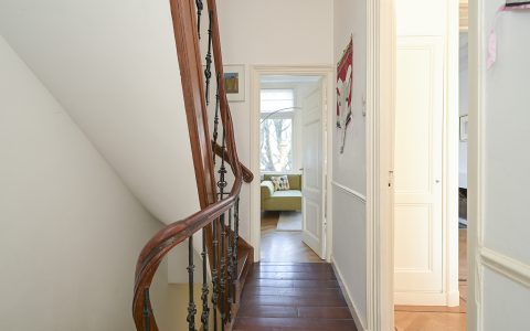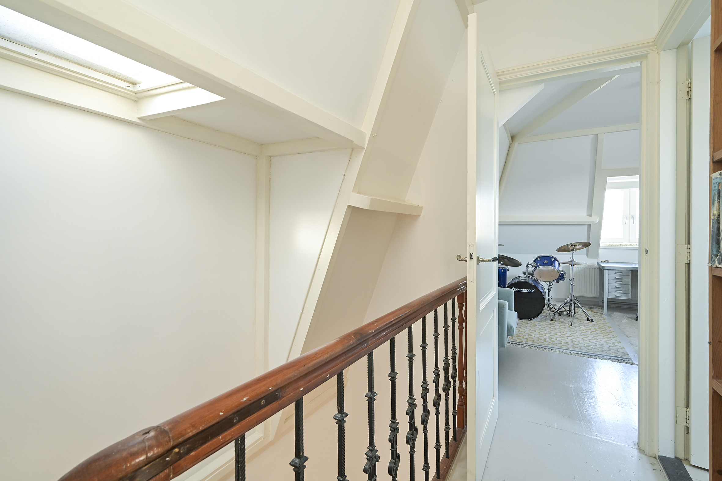Landing, separate toilet and a beautiful second living room spanning the full width of the house. This elegant room features herringbone parquet flooring, an ornamental ceiling and a fireplace, with lovely views across Koningsplein.
