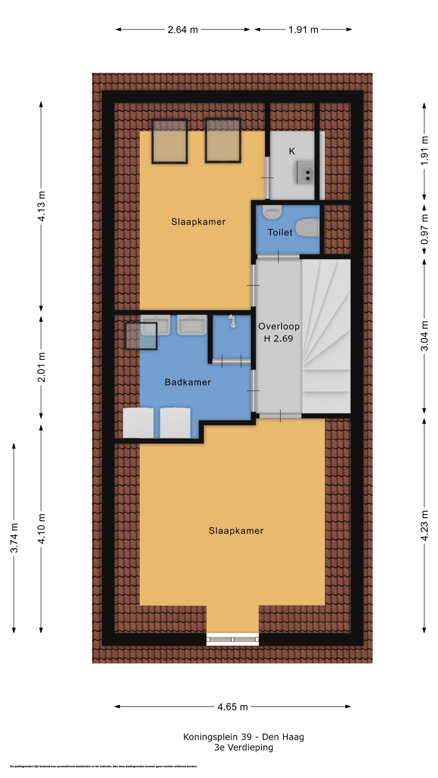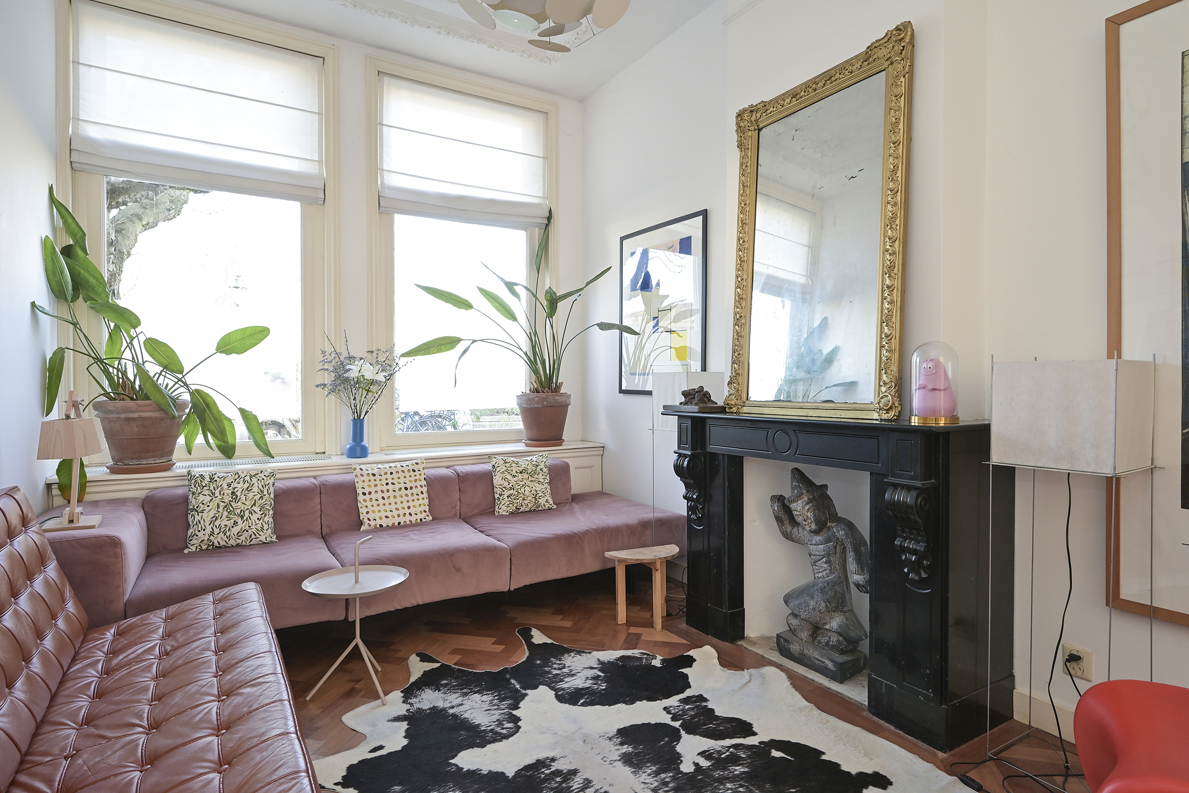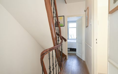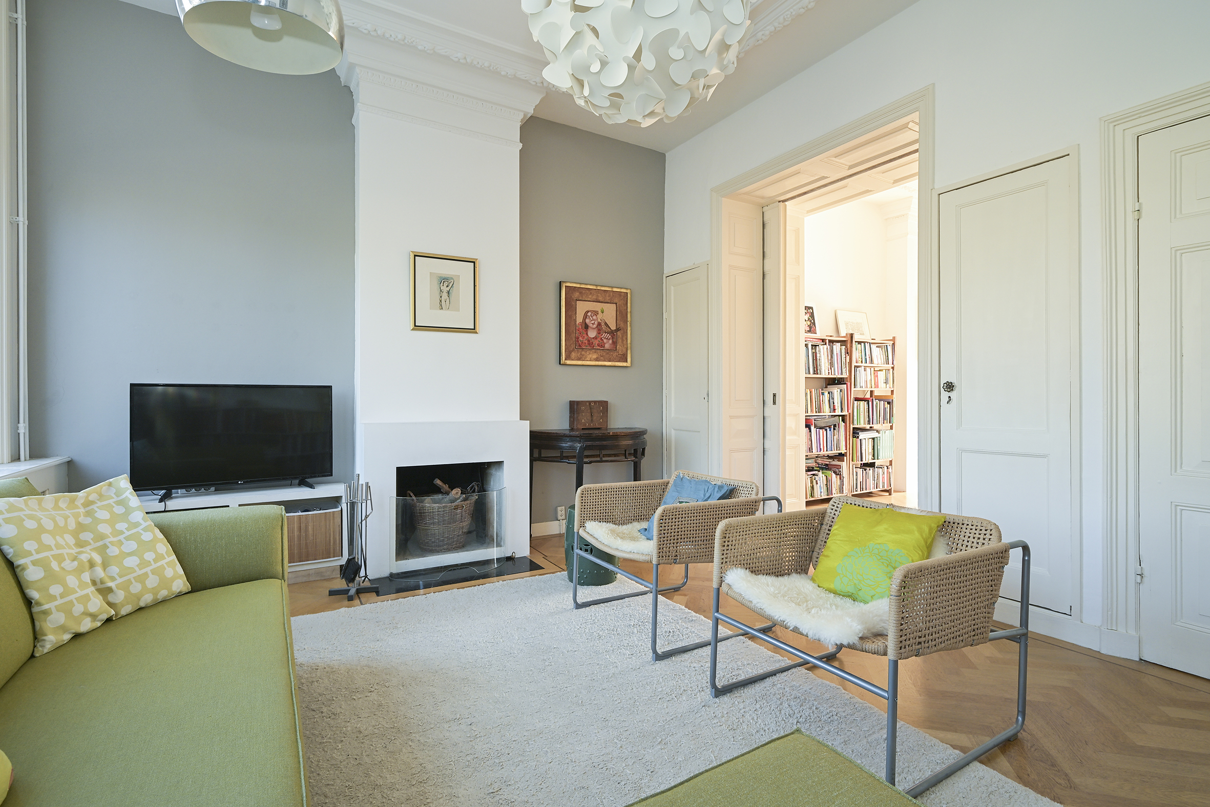 Landing, separate toilet and a beautiful second living room spanning the full width of the house. This elegant room features herringbone parquet flooring, an ornamental ceiling and a fireplace, with lovely views across Koningsplein.