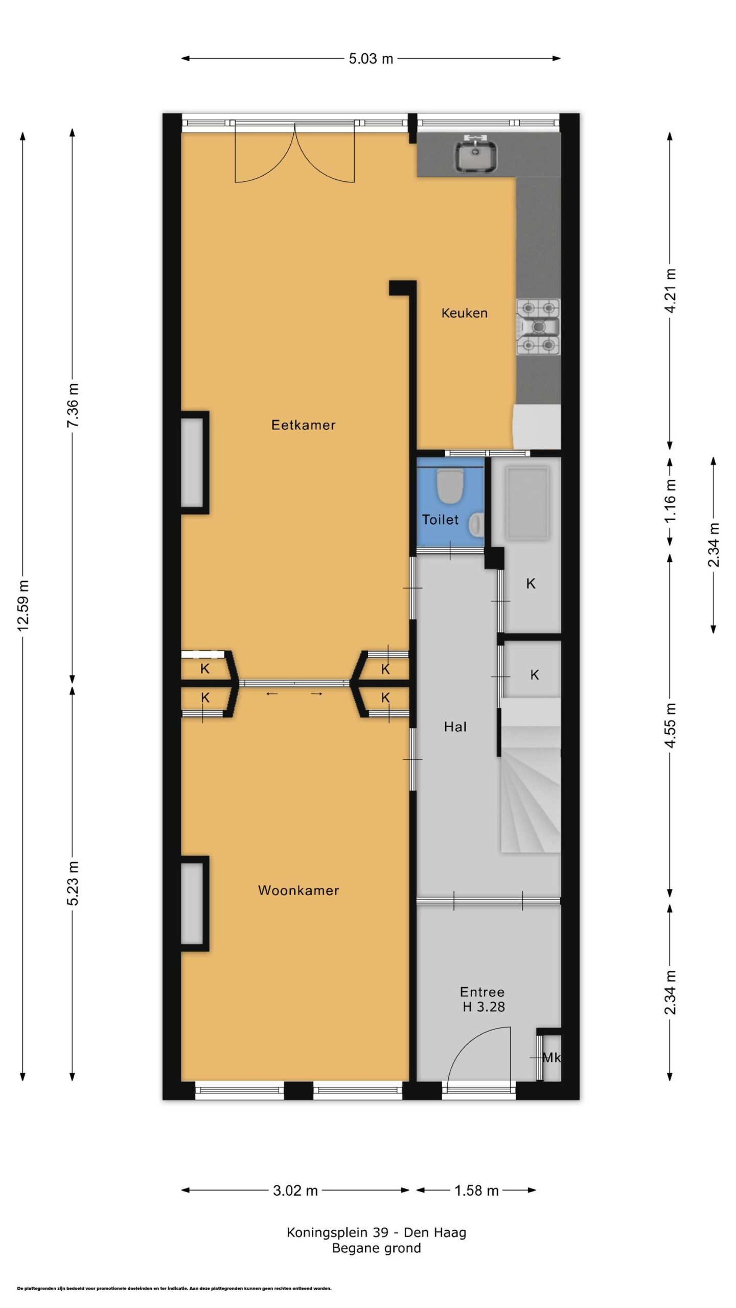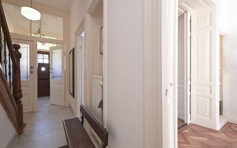 Entree, vestibule met meterkast en fraaie marmeren vloer, deur naar de gang. Via de vestibule komt u in de gang met de trapopgang, de deur naar de kelder onder de keuken en een toilet met fonteintje. Vanuit de gang zijn ook de woonkamer en de half open keuken bereikbaar. De woonkamer en suite is zeer sfeervol vanwege alle goed bewaard gebleven klassieke elementen zoals het fraaie ornamenten plafond, de visgraat parketvloer, de marmeren schouw en de ensuite deuren. De eetkamer aan de achterzijde staat in open verbinding met de keuken. Deze keuken is in L-opstelling en beschikt over diverse inbouw-apparatuur (vaatwasser, klassieke schouw met afzuigkap, groot 5-pits fornuis met geïntegreerde oven. Via openslaande deuren kan de onder architectuur aangelegde achtertuin bereikt worden. Deze tuin is op het zuid oosten gelegen en heeft vrij uitzicht tussen de bebouwing door. In de tuin staat een prachtige Magnolia.