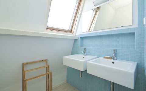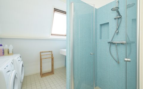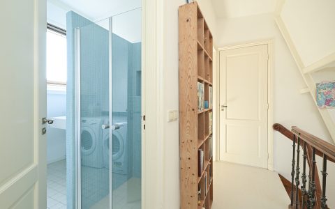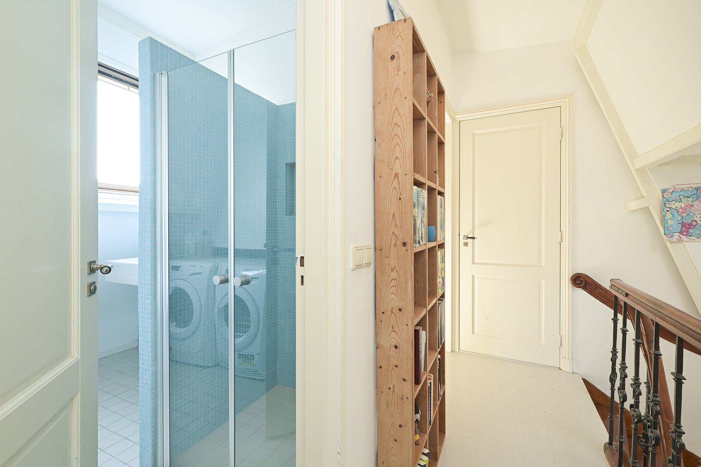 Landing, a charming and spacious front room filled with natural light thanks to Velux windows. The centrally located bathroom includes a shower, two washbasins and connections for a washing machine and dryer. Separate toilet, rear bedroom and storage space with the central heating installation.