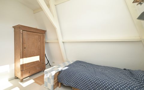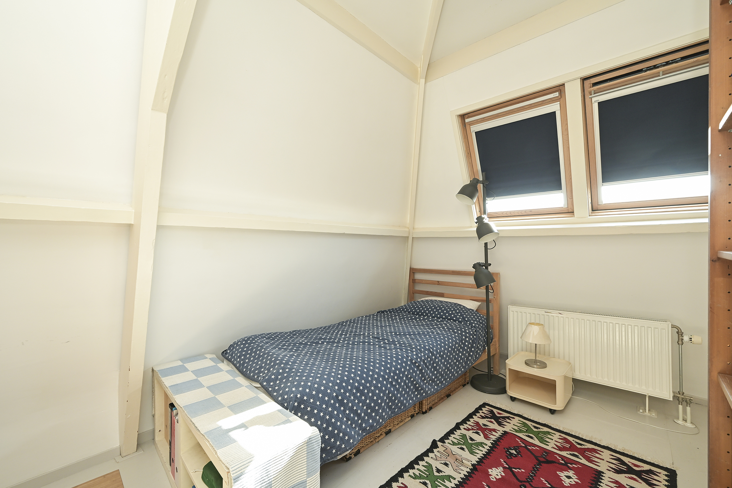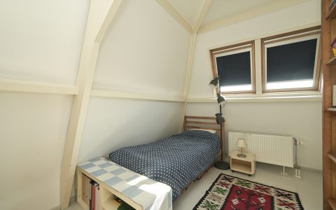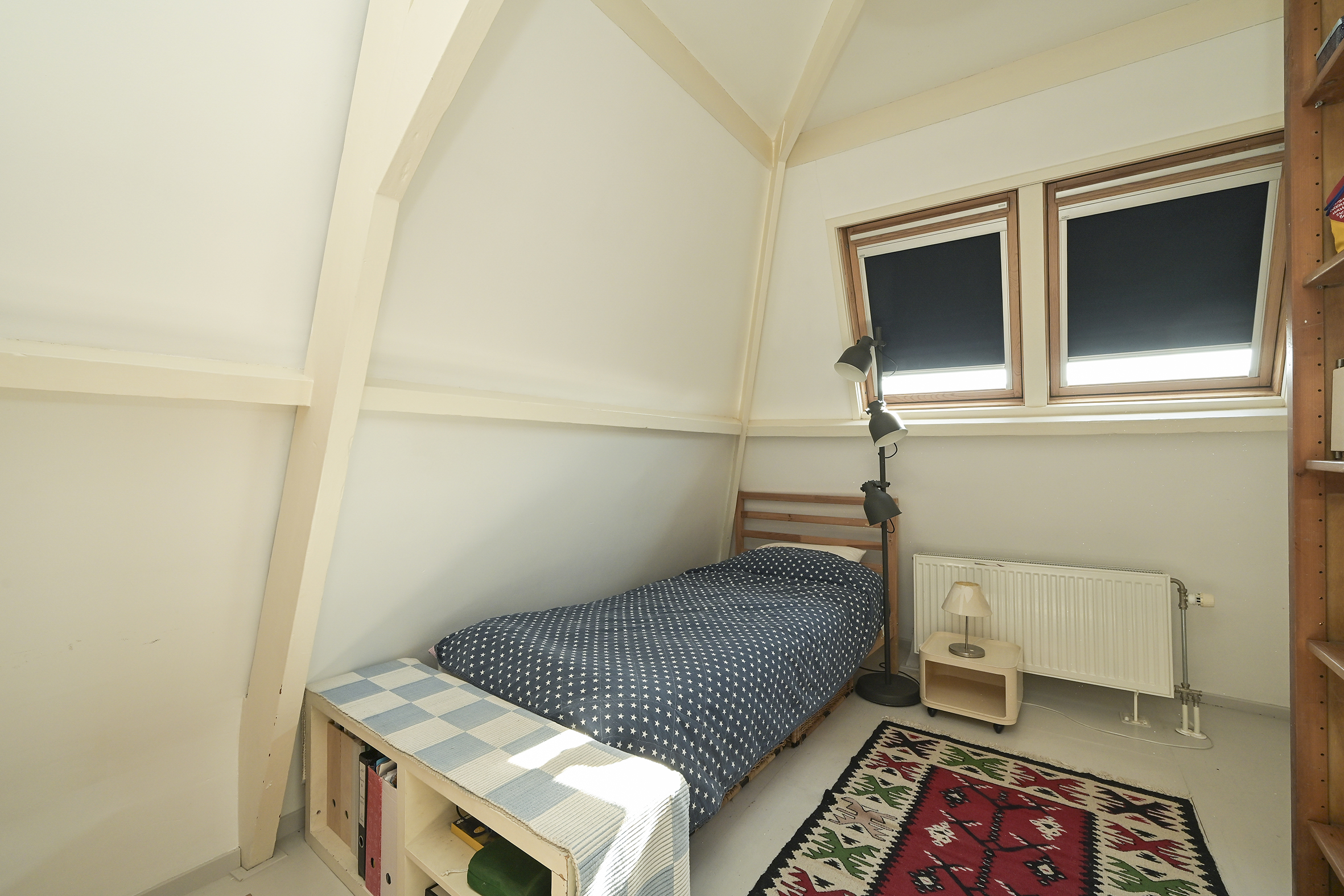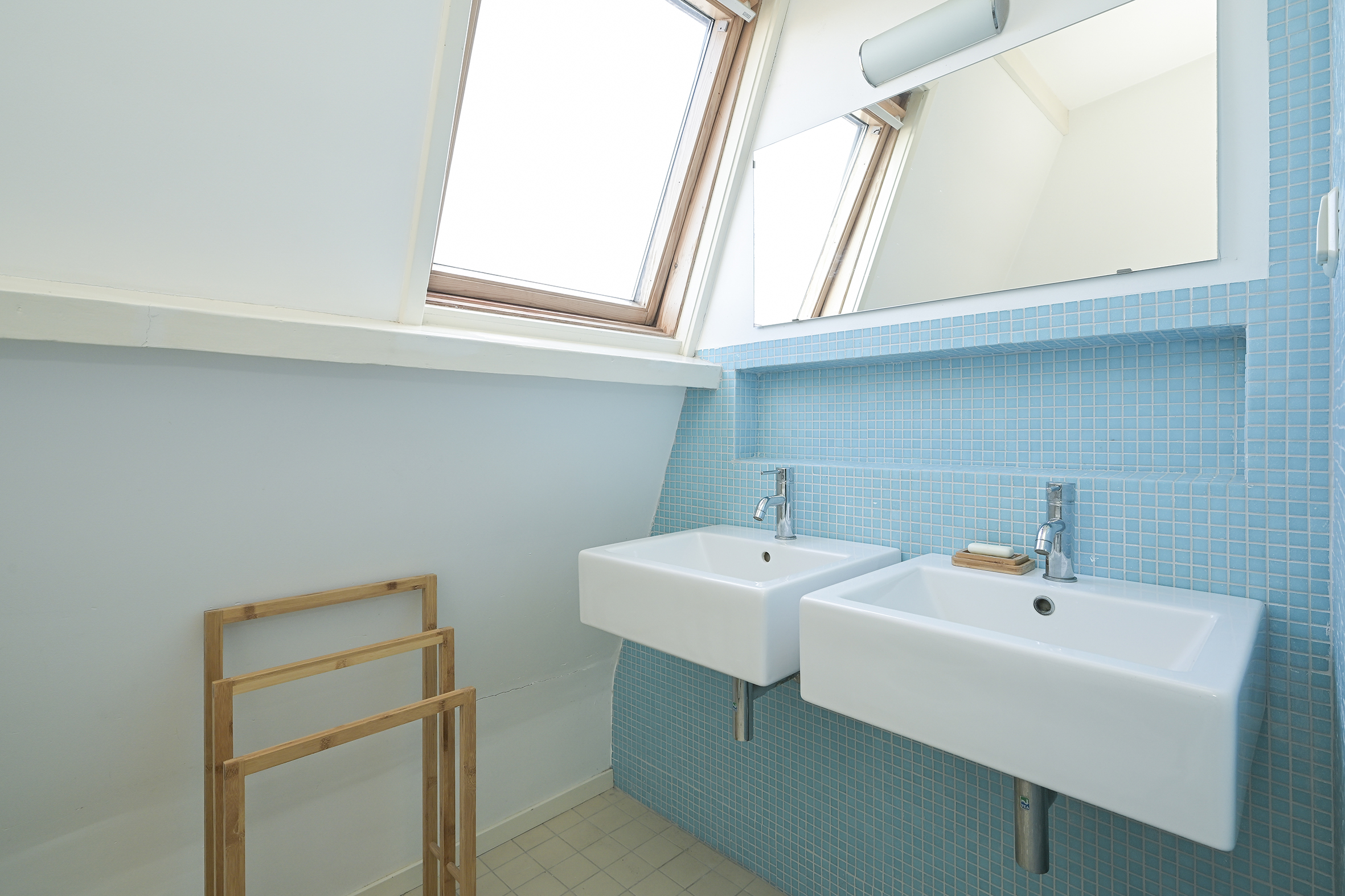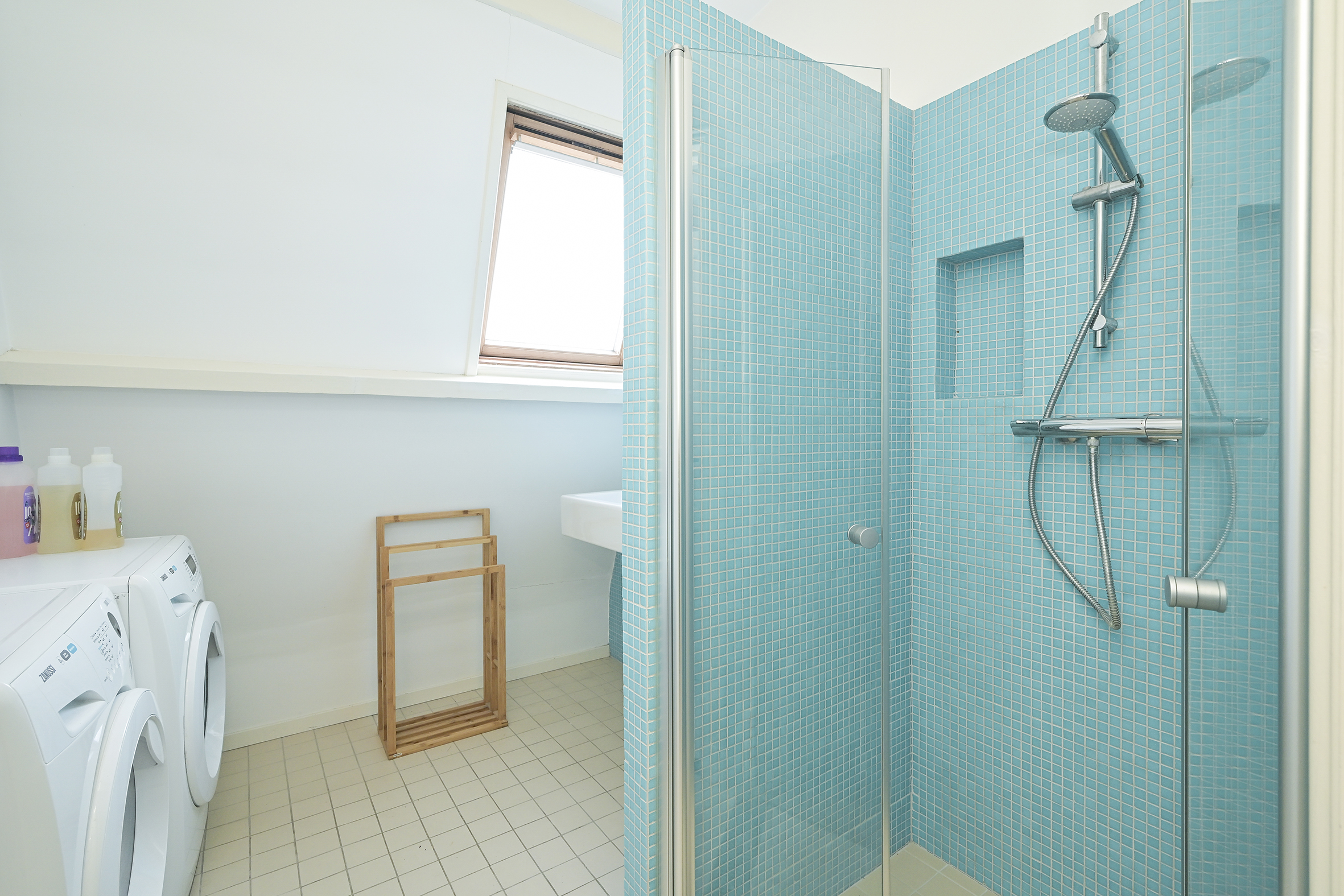 Overloop, sfeervolle en ruime voorkamer met veel daglicht vanwege de velux ramen, tussen gelegen badkamer met douche, twee wastafels aansluiting voor wasmachine en droger, aparte wc, achter slaapkamer en bergruimte met cv-opstelplaats.