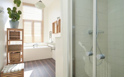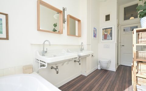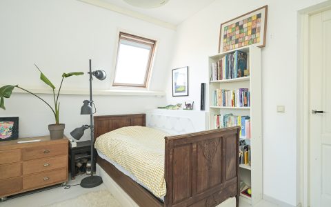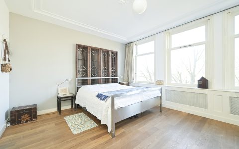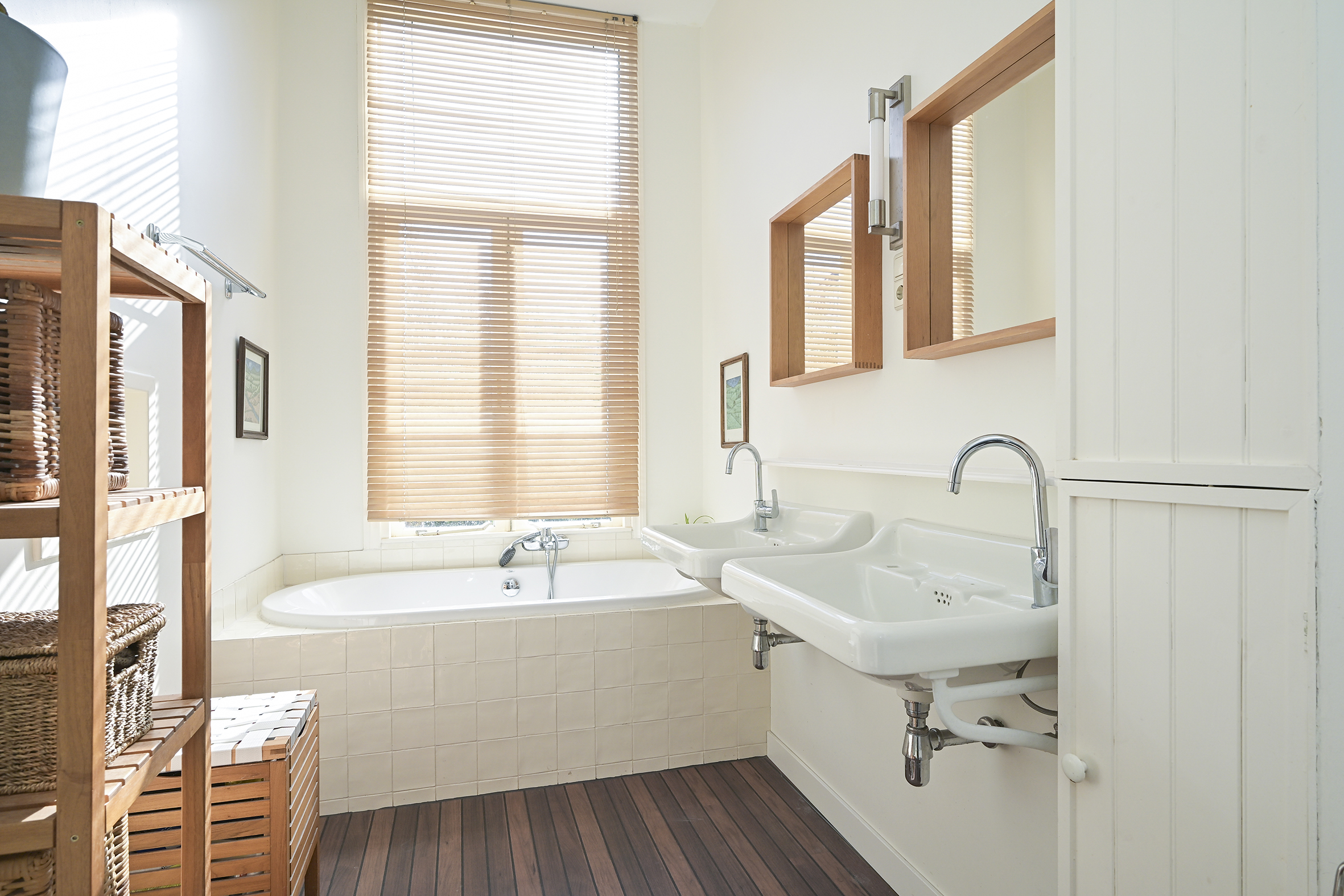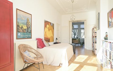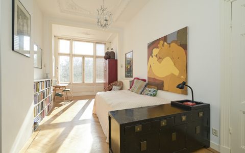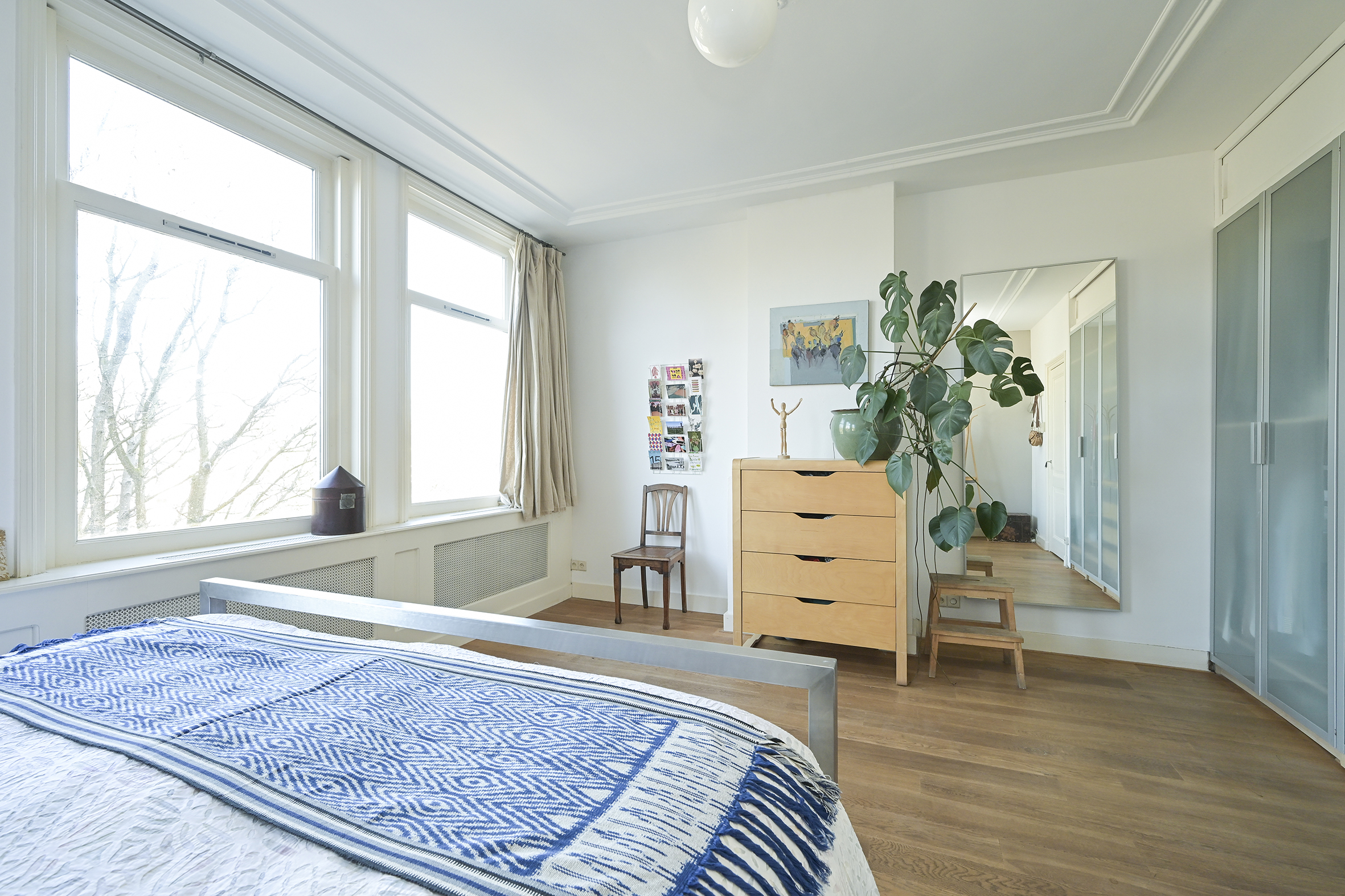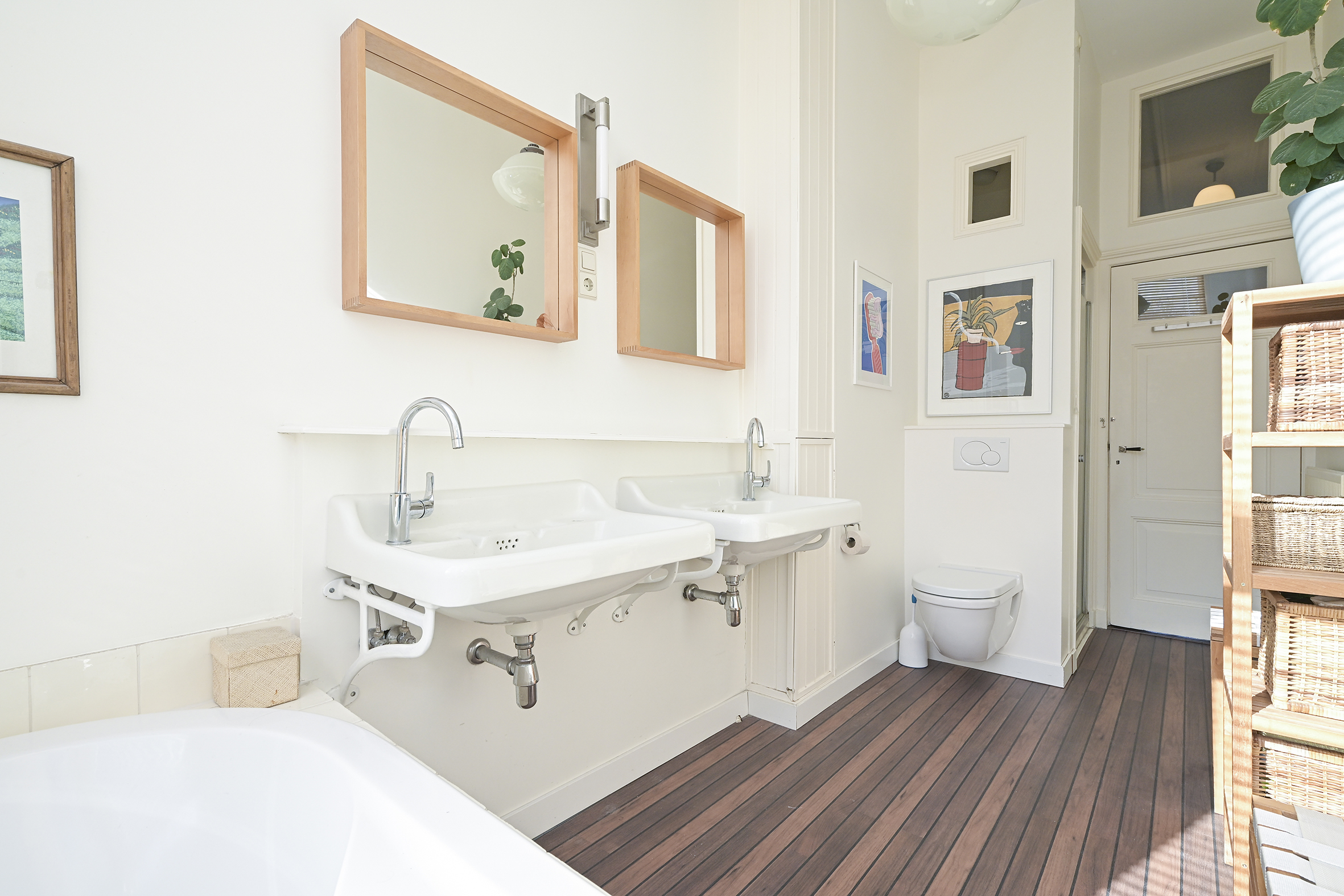 Through the en suite doors you reach the spacious rear room, currently used as a guest room/study. The bathroom is located at the rear of the house and is well equipped with a bathtub, double washbasin and a rain shower. This floor is finished with a beautiful oak parquet floor.