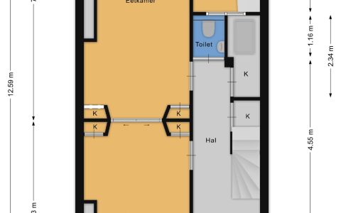 Entrance, vestibule with meter cupboard and beautiful marble floor, leading to the hallway. From the vestibule you enter the hallway with staircase, access to the cellar beneath the kitchen and a guest toilet with washbasin. The living room and semi-open kitchen are also accessible from the hallway.