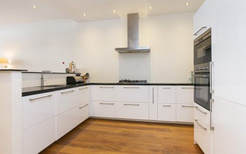 entree, hal, ruime woon-/eetkamer met moderne open witte keuken voorzien van alle inbouw apparatuur o.a. 5-pits gaskookplaat, rvs afzuigkap en zwart granieten blad, centrale hal met toegang tot de voorslaapkamer, moderne badkamer met ligbad, wastafel en handdoekradiator, cv-ruimte met Remeha Avanta HR en aansluitingen voor wasapparatuur, hangend toilet met fontein, achter slaapkamer met deur naar de zeer zonnige achtertuin. De tuin is voorzien van hardhouten schuttingen en grijze natuursteen tegels. Ruime hoofdslaapkamer annex moderne badkamer met hangend toilet, inloopdouche, wastafelmeubel met laden. Vanuit de hoofdslaapkamer zijn er dubbele deuren naar de achtertuin.