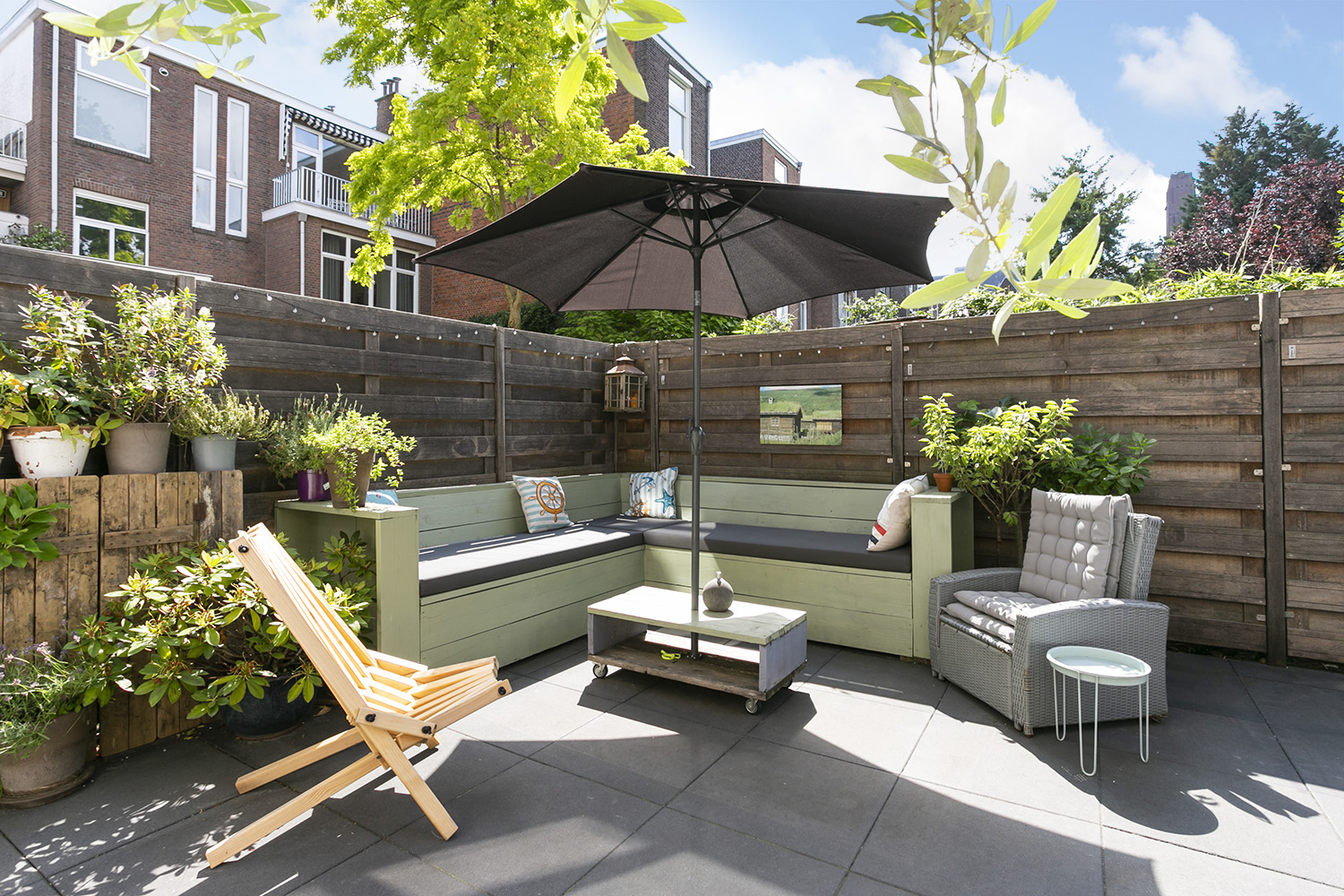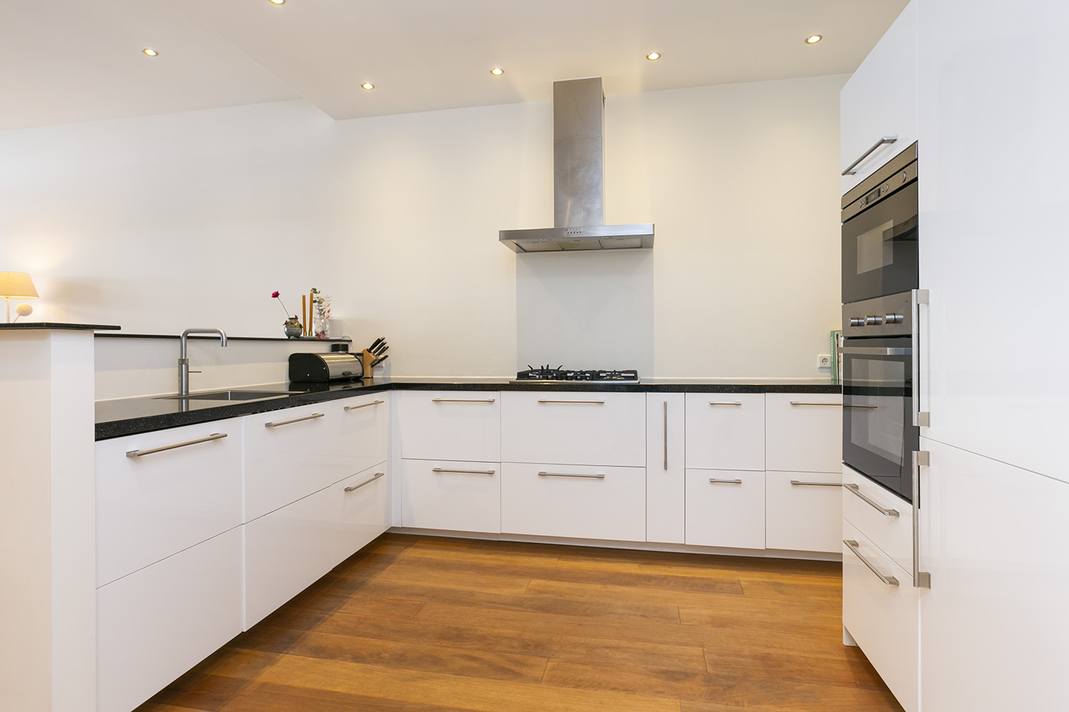 entrance, hall, spacious living/dining room with modern open white kitchen with all appliances including 5-burner gas hob, stainless steel extractor hood and black granite top, central hall with access to the front bedroom, modern bathroom with bath, wash basin and towel radiator , central heating room with Remeha Avanta HR and connections for washing equipment, hanging toilet with fountain, rear bedroom with door to the very sunny backyard. The garden is equipped with new (hardwood) fences and gray stone tiles. Spacious master bedroom annex modern bathroom with hanging toilet, walk-in shower, wash basin with drawers. From the master bedroom there are double doors to the rear garden.