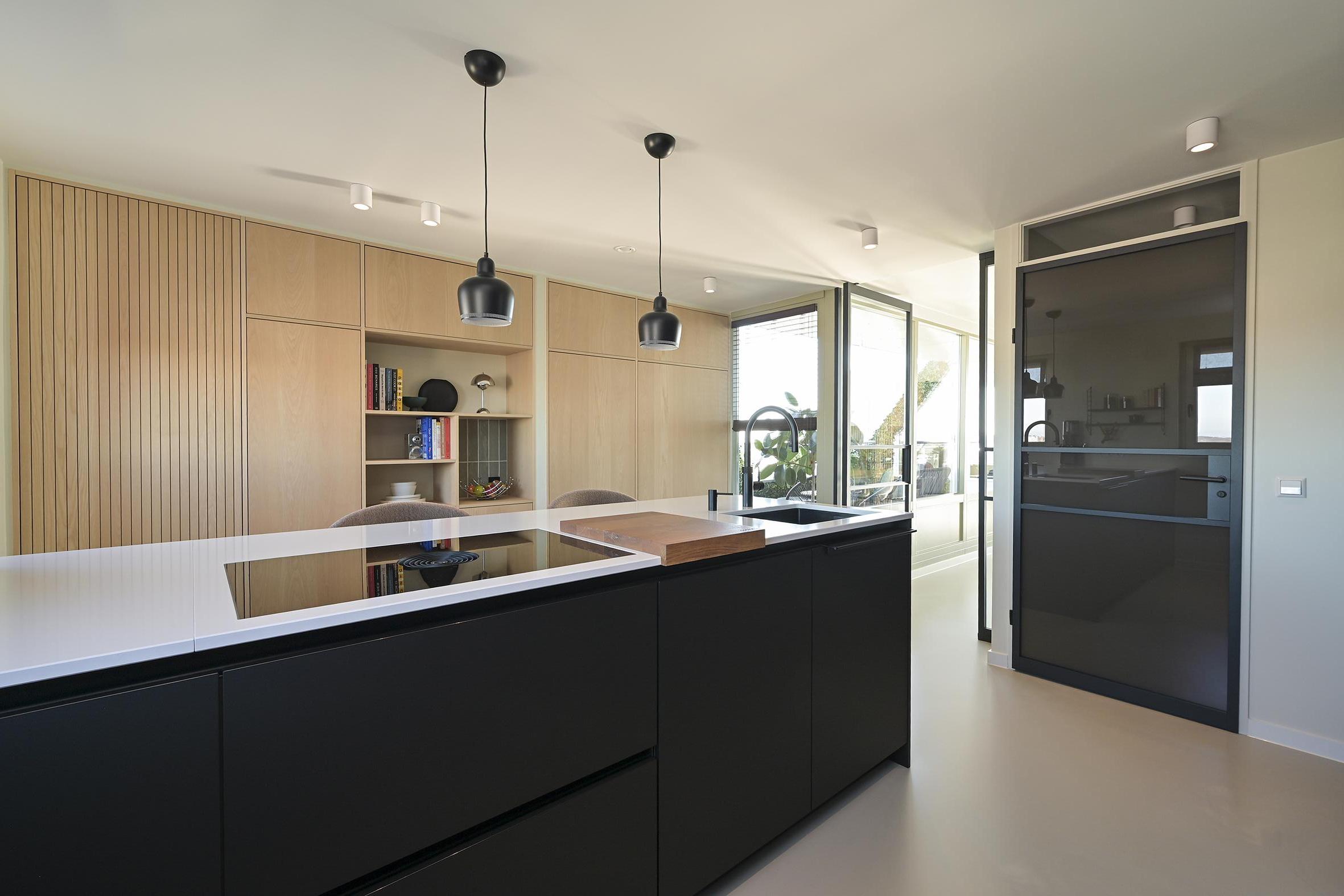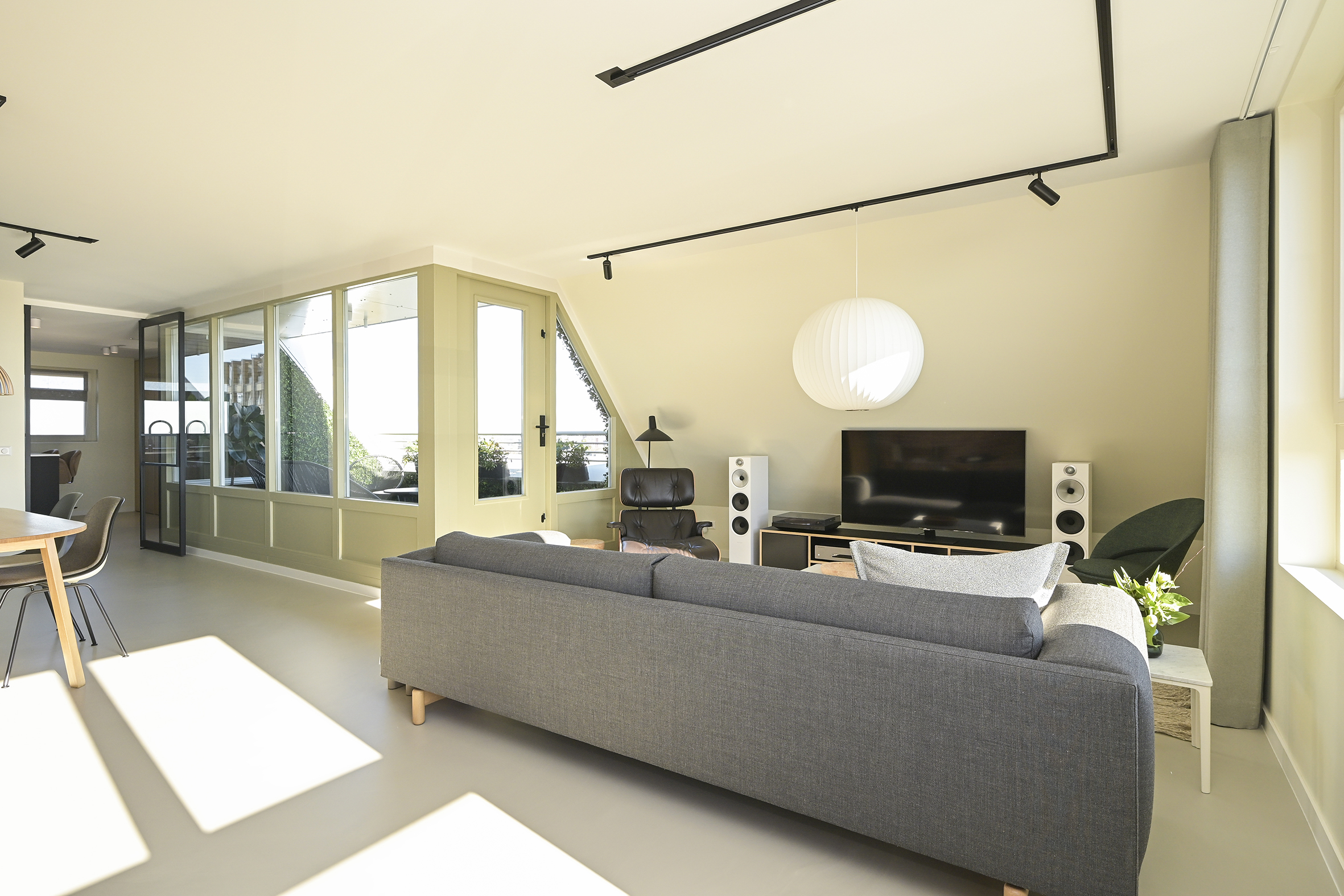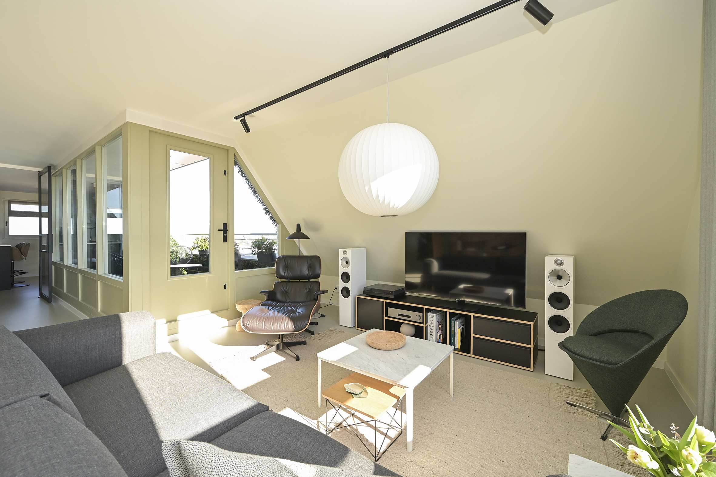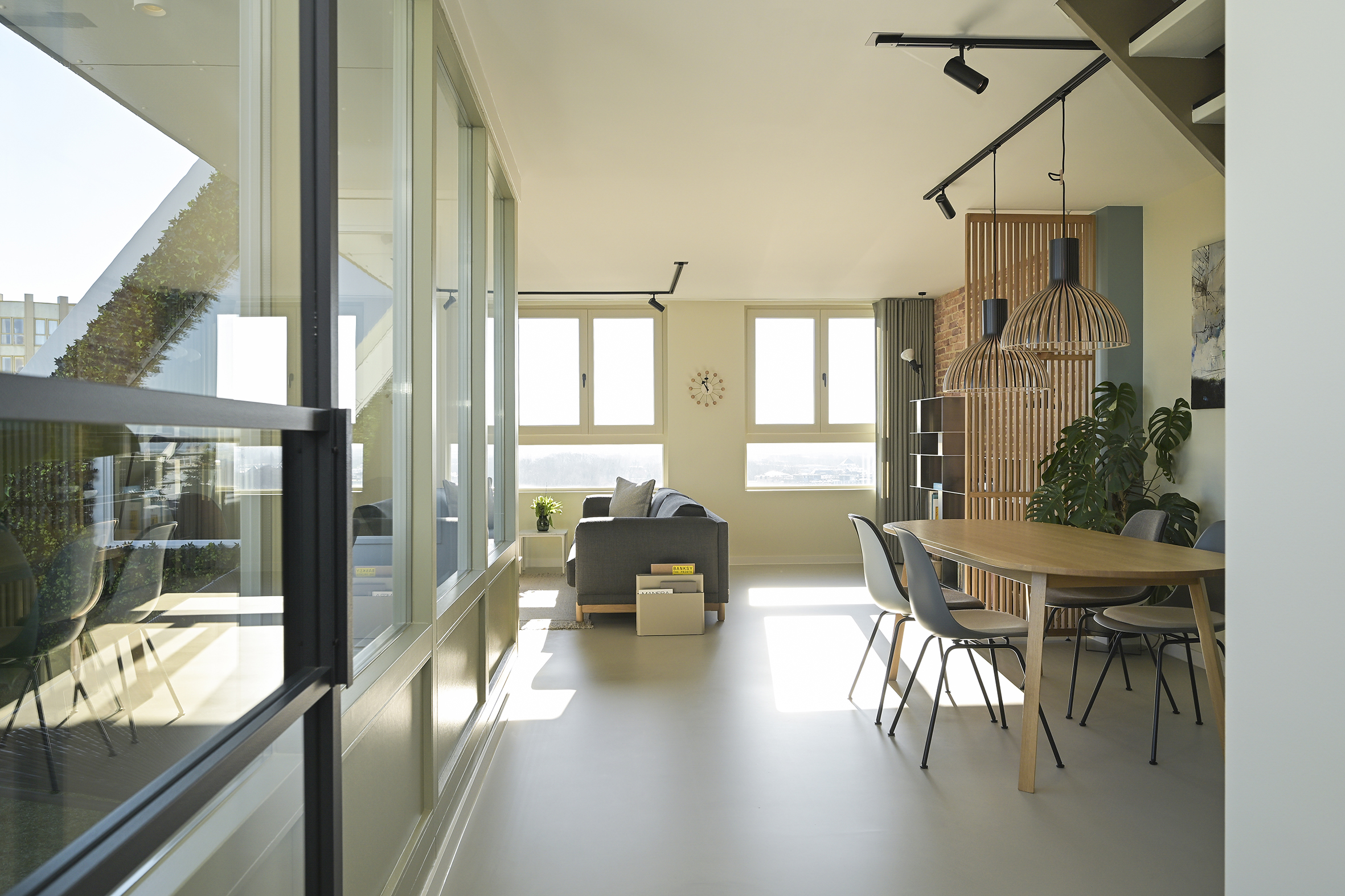 Aansluitend bevindt zich de lichte woon-eetkamer met grote raampartijen en toegang tot het royale dakterras van ca. 11 m². Een beschutte buitenruimte waar u comfortabel zit en waar het uitzicht, dankzij de hoge ligging, echt onderdeel wordt van het dagelijks wonen.