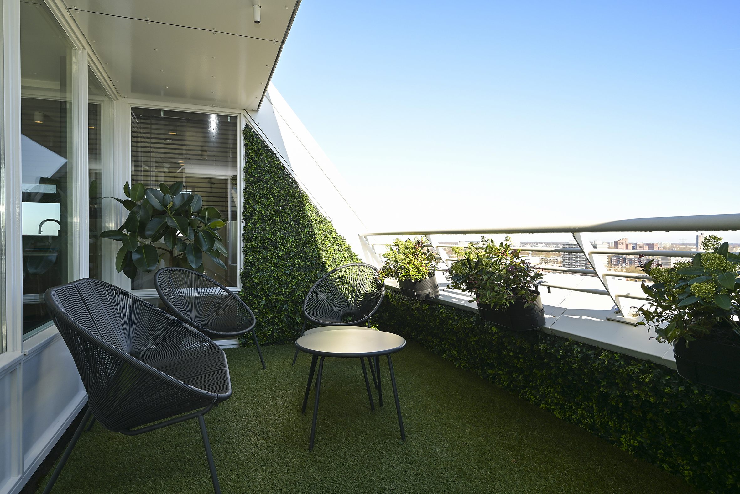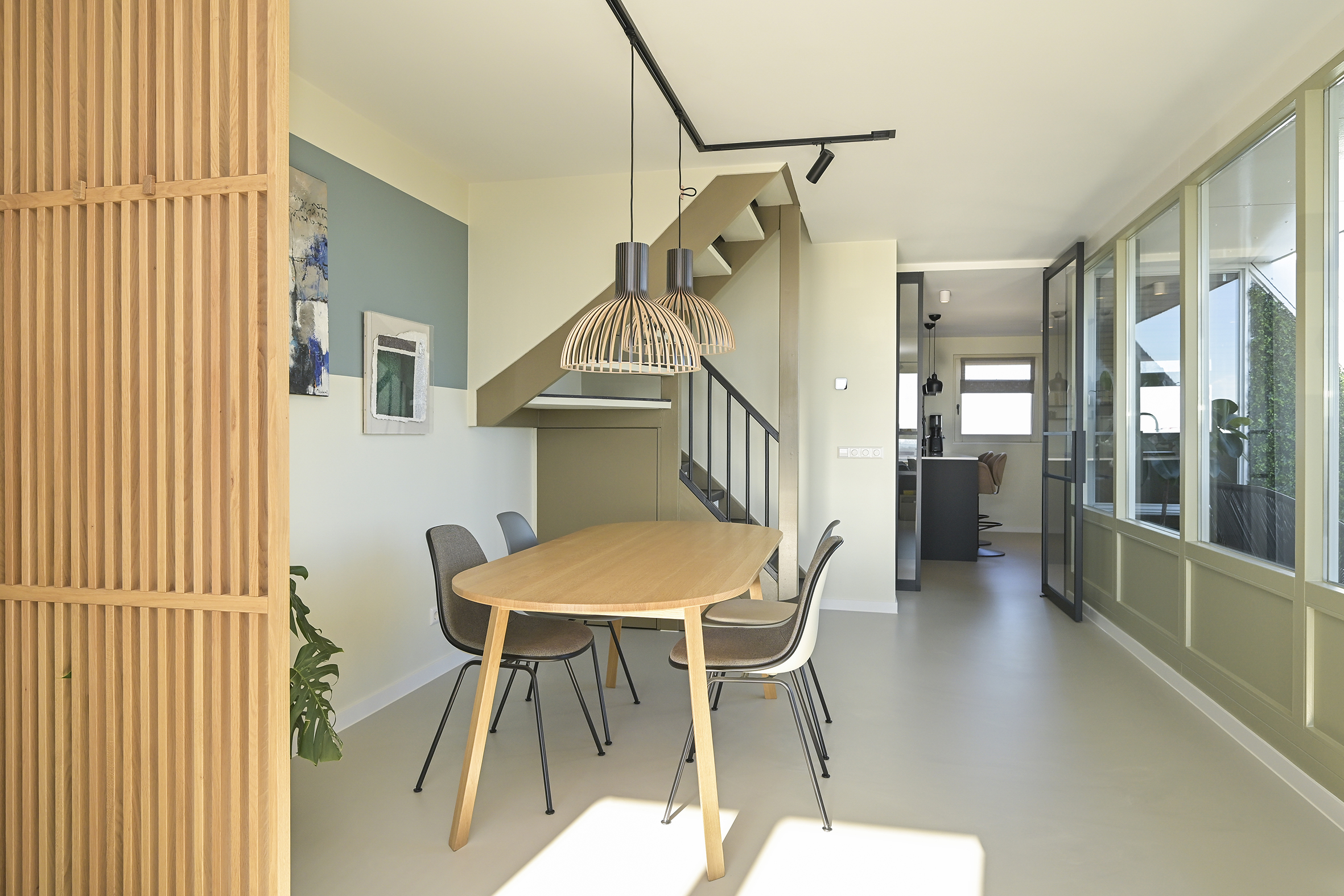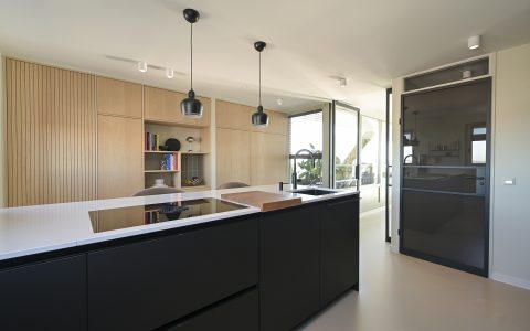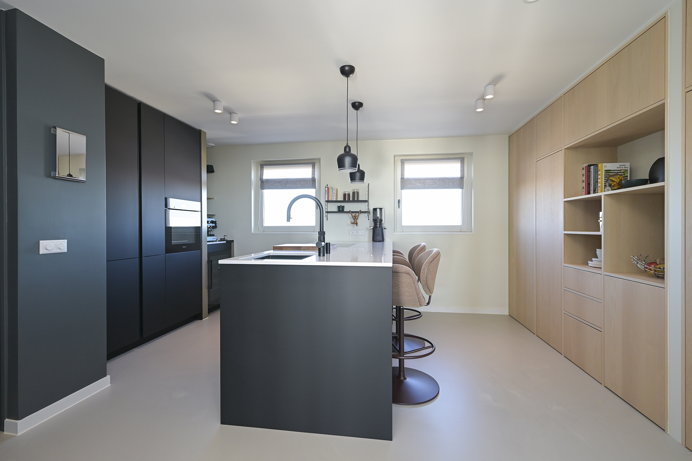 Aansluitend bevindt zich de lichte woon-eetkamer met grote raampartijen en toegang tot het royale dakterras van ca. 11 m². Een beschutte buitenruimte waar u comfortabel zit en waar het uitzicht, dankzij de hoge ligging, echt onderdeel wordt van het dagelijks wonen.