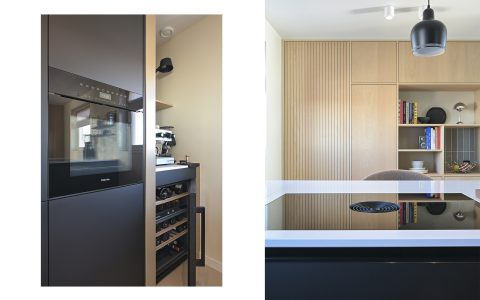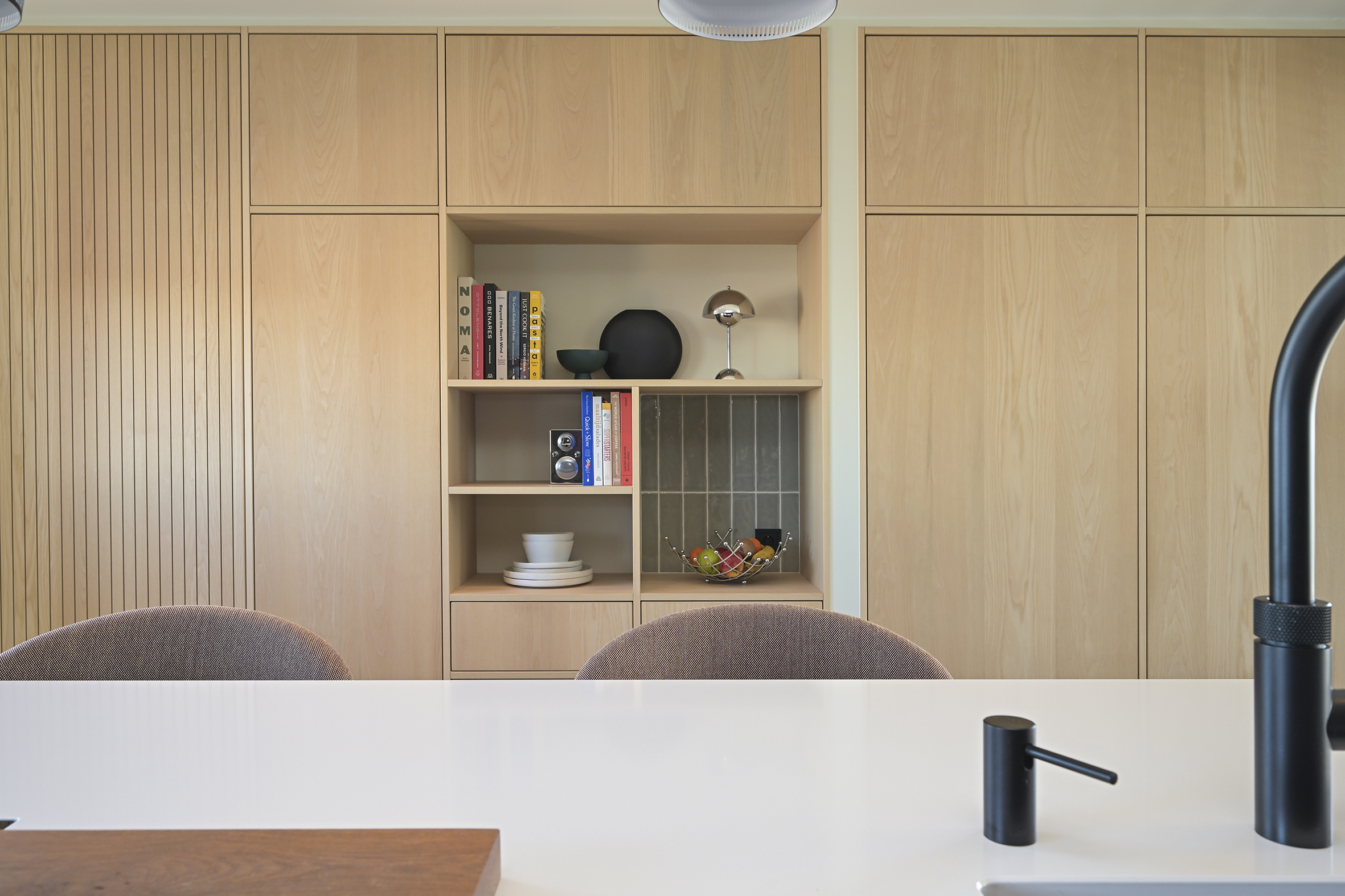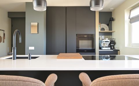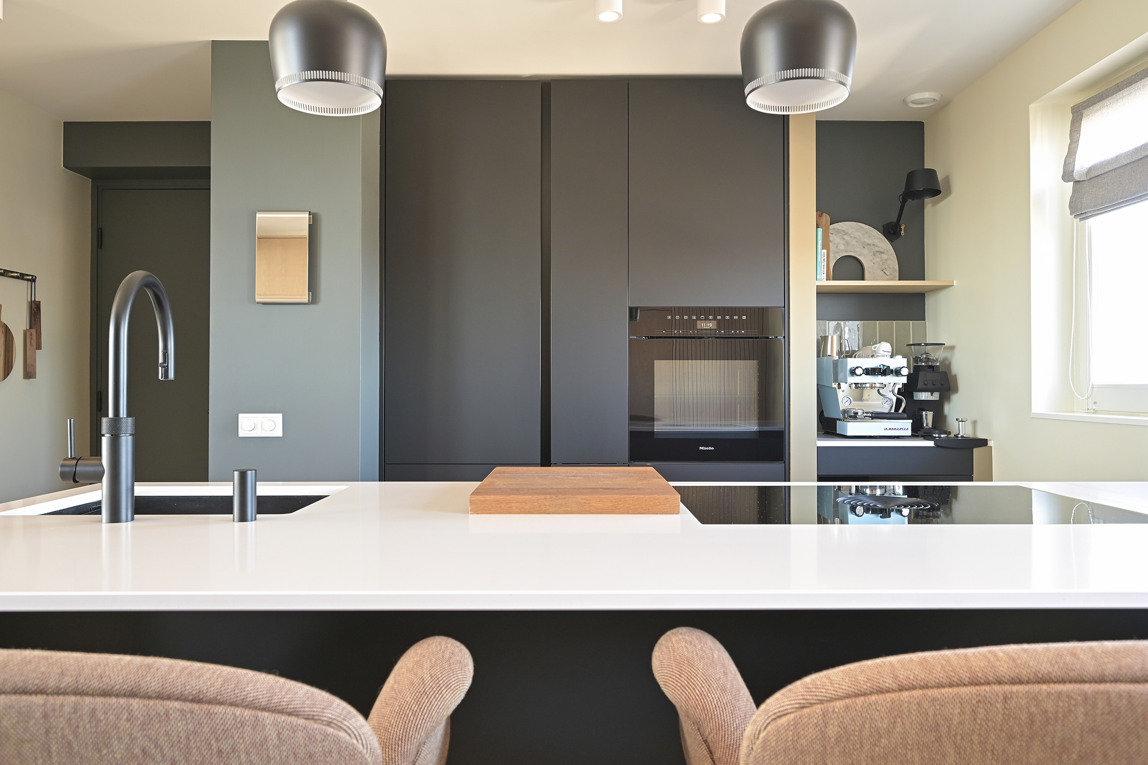 Entree in hal met meterkast en modern toilet. De dichte woonkeuken, geplaatst in 2022, is uitgevoerd in een praktische opstelling met diverse inbouwapparatuur, waaronder een Bora-kookplaat, Quooker, combi-oven, koelkast/vriezer, vaatwasser en wijnkoelkast.