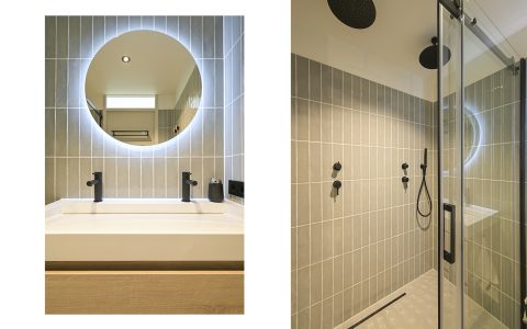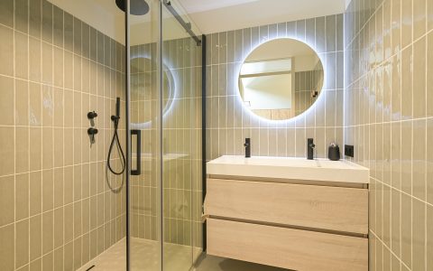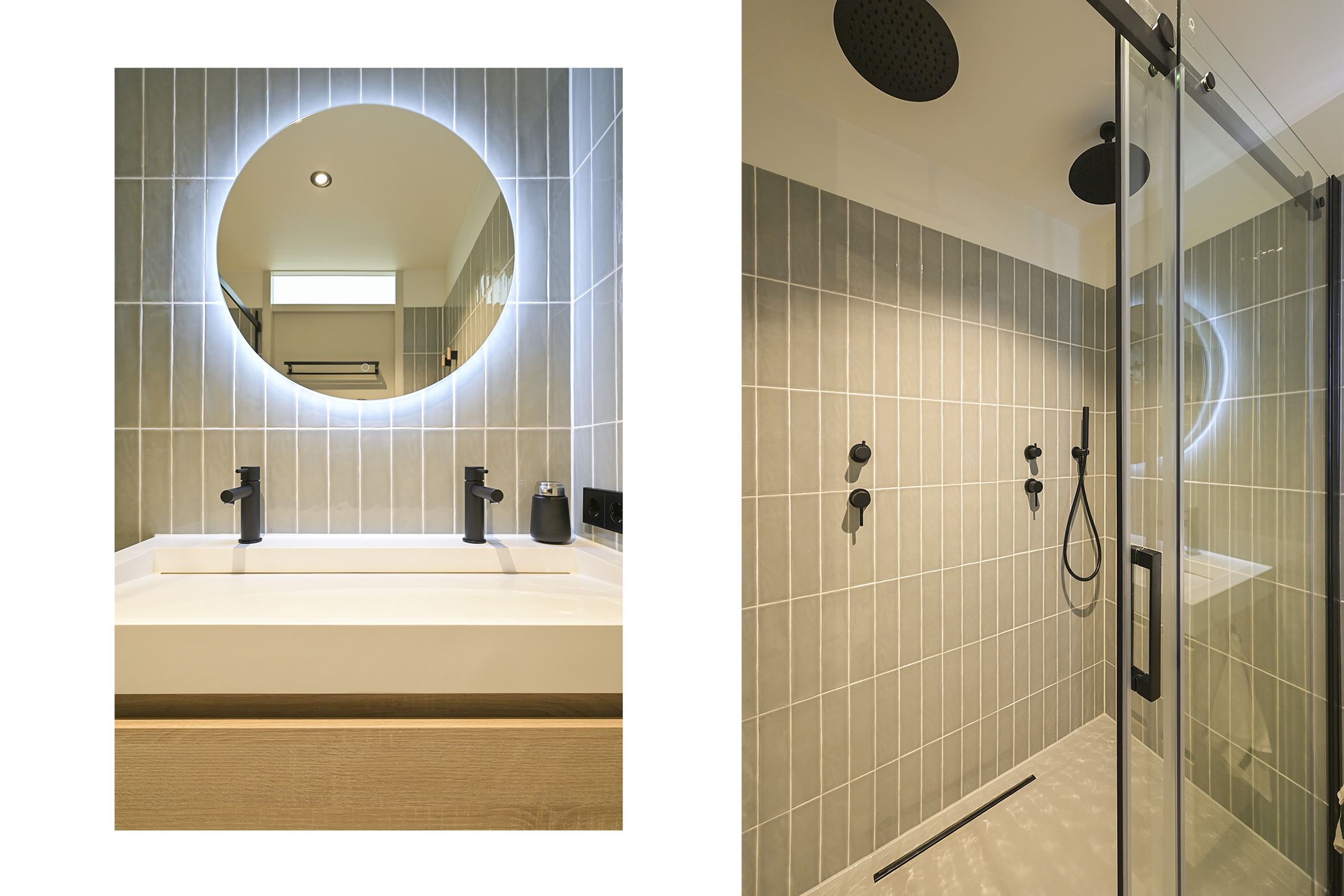 De vernieuwde badkamer is modern afgewerkt en voorzien van een inloopdouche met twee regendouches en een wastafelmeubel.